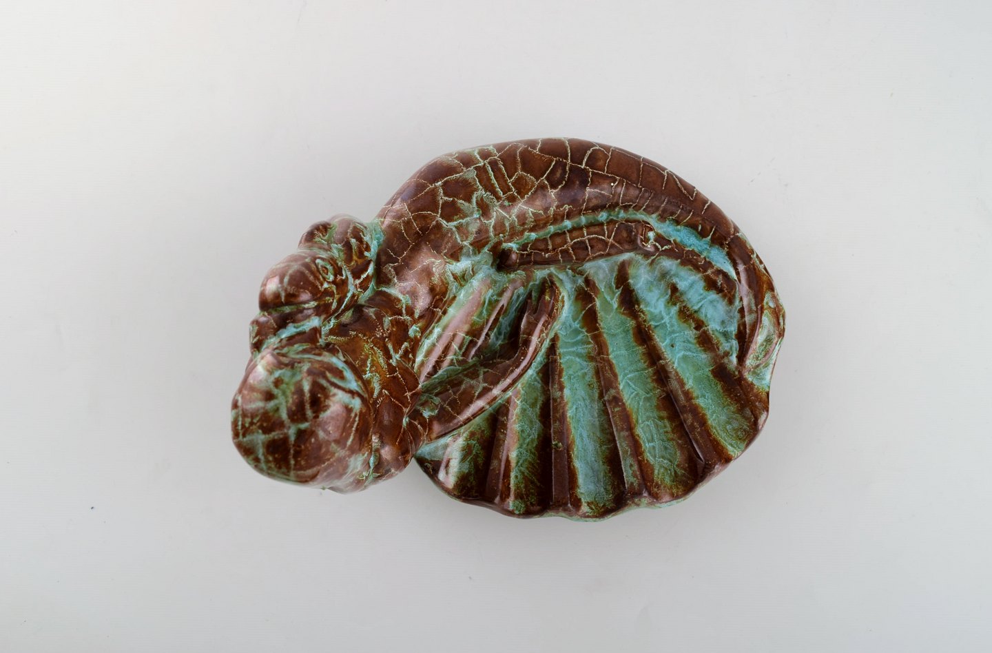 Sculpture / bowl in the form of lying mermaid with fish. Beautiful glaze in red, brown and turquoise tones. 1940's.