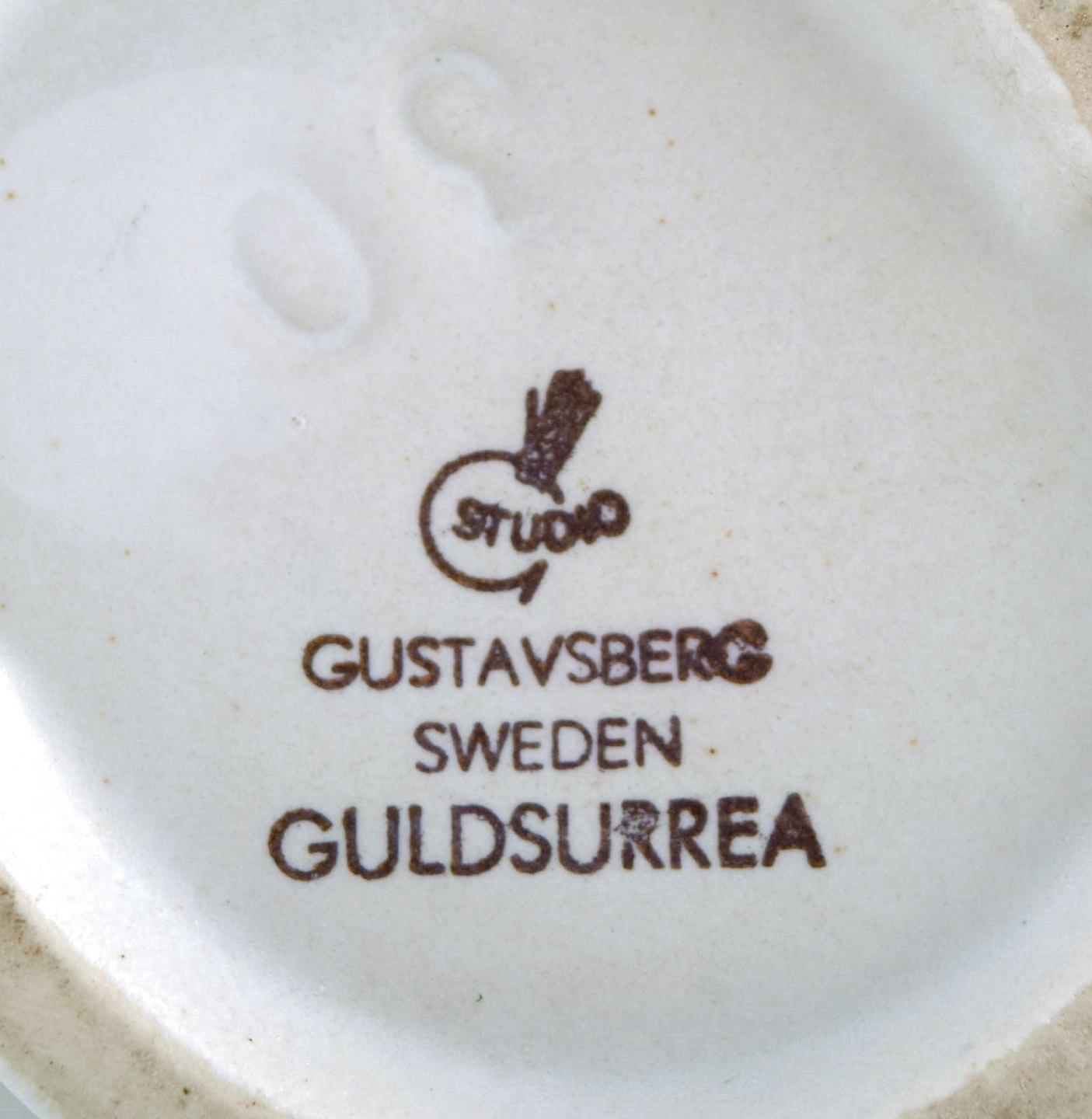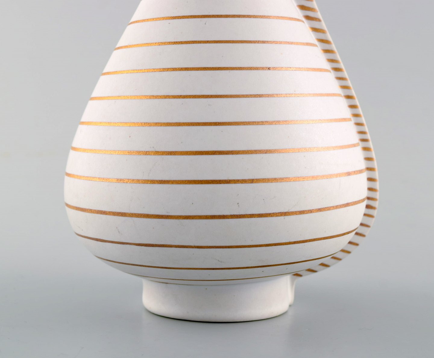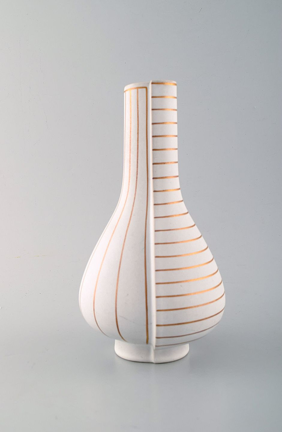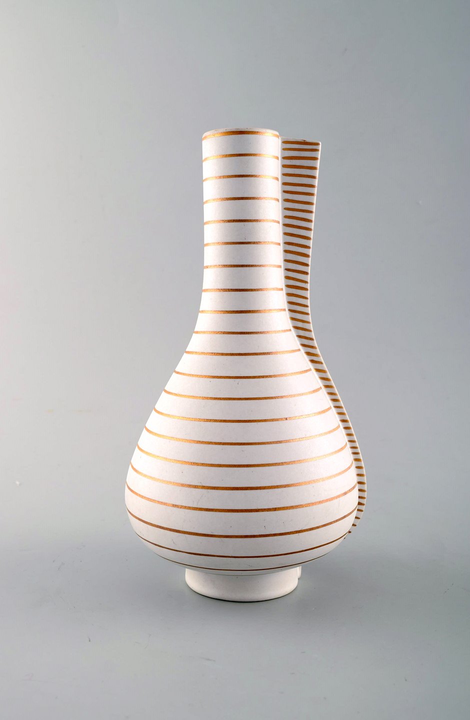 Wilhelm Kåge for Gustavsberg Studio Hand. Stor "Guldsurrea" keramik dobbeltvase i mat hvid carrara-glasur med horisontale og vertikale guldstriber. Ikonisk og surrealistisk design. Surrea serien blev designet i 1936.