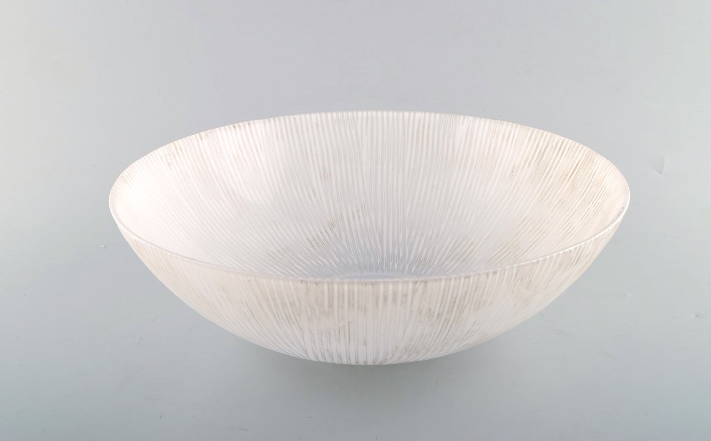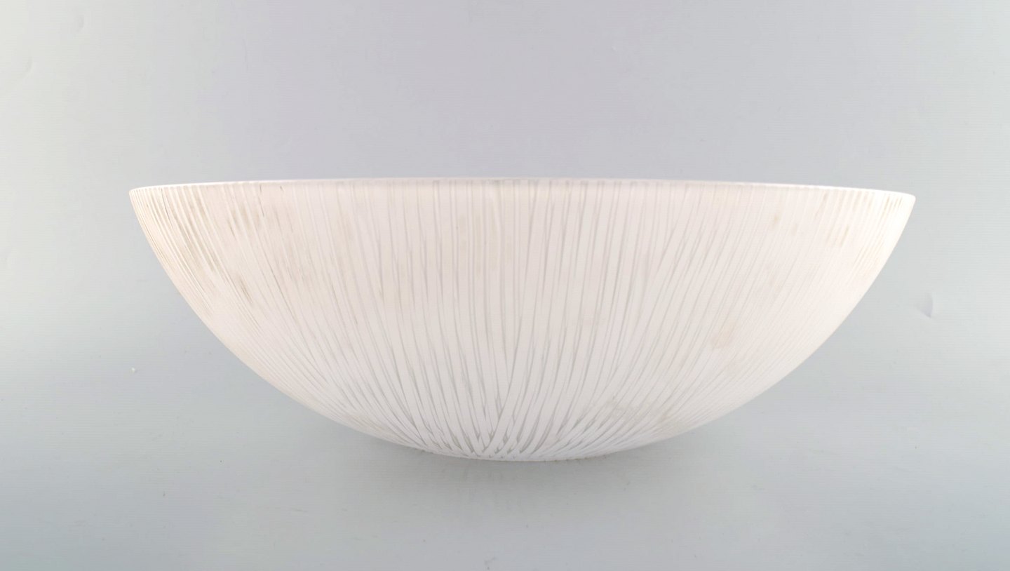 Ingegerd Råman for Orrefors. Stor "Savann" skål i mælkehvidt kunstglas. Sent 1900-tallet. I flot stand. Mærkat. Måler: 35,5 x 12 cm.