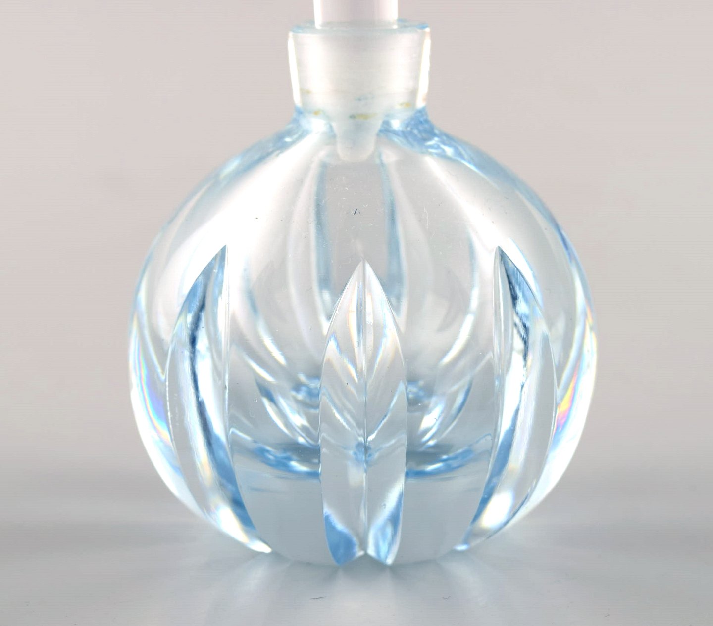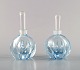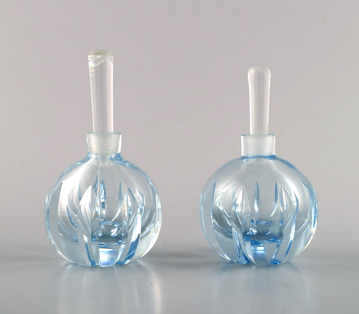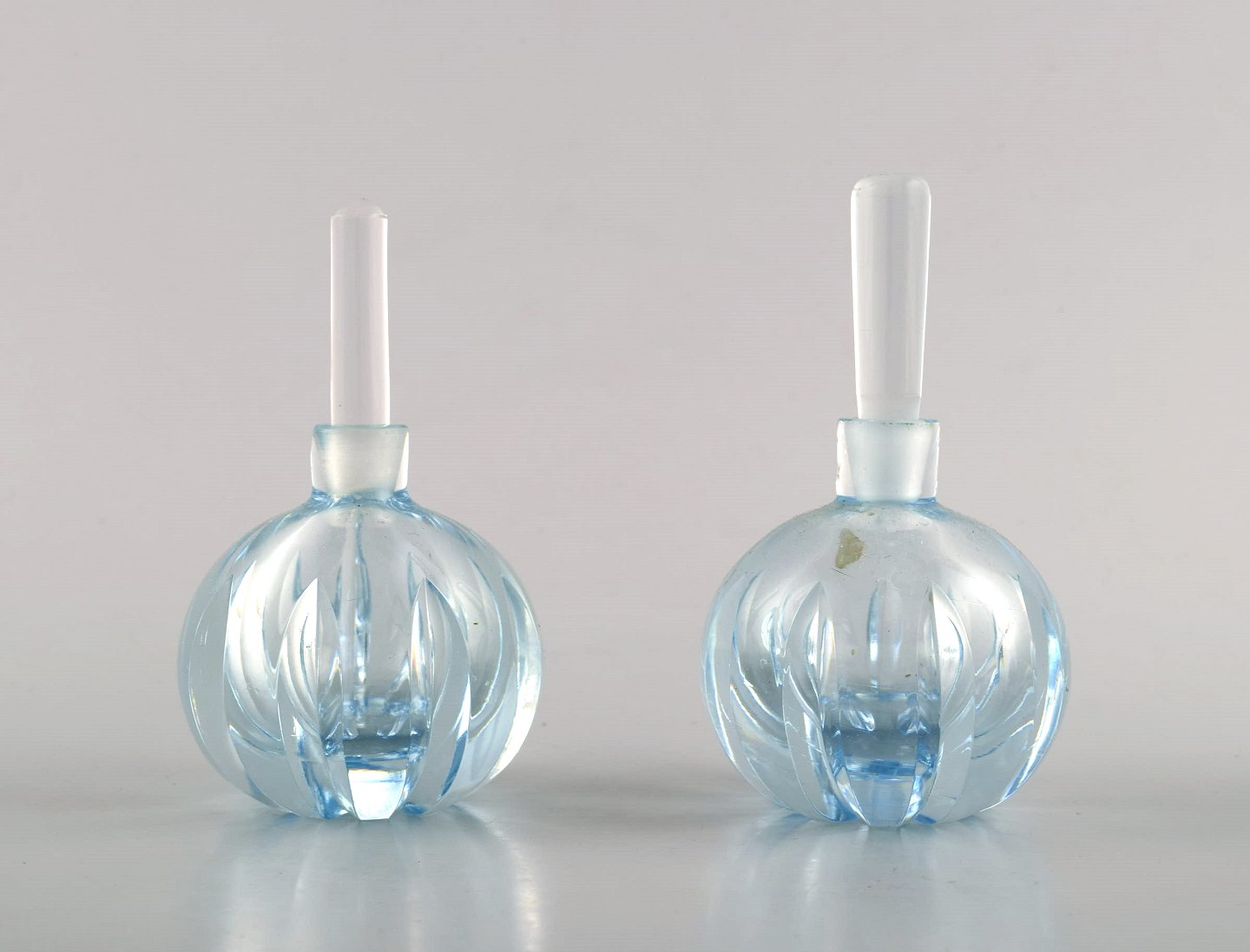 Edward Hald for Orrefors. En samling på seks mundblæste art deco flakoner i lyseblåt kunstglas. Designet i 1940'erne.