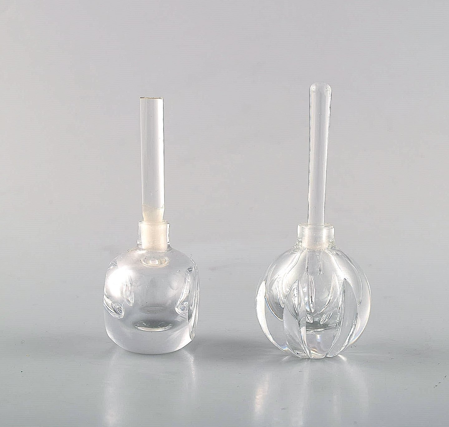 Vicke Lindstrand for Kosta Boda og Edward Hald for Orrefors. En samling på seks mundblæste parfume flakoner i klart kunstglas. Designet i 1940'erne og 1960'erne.