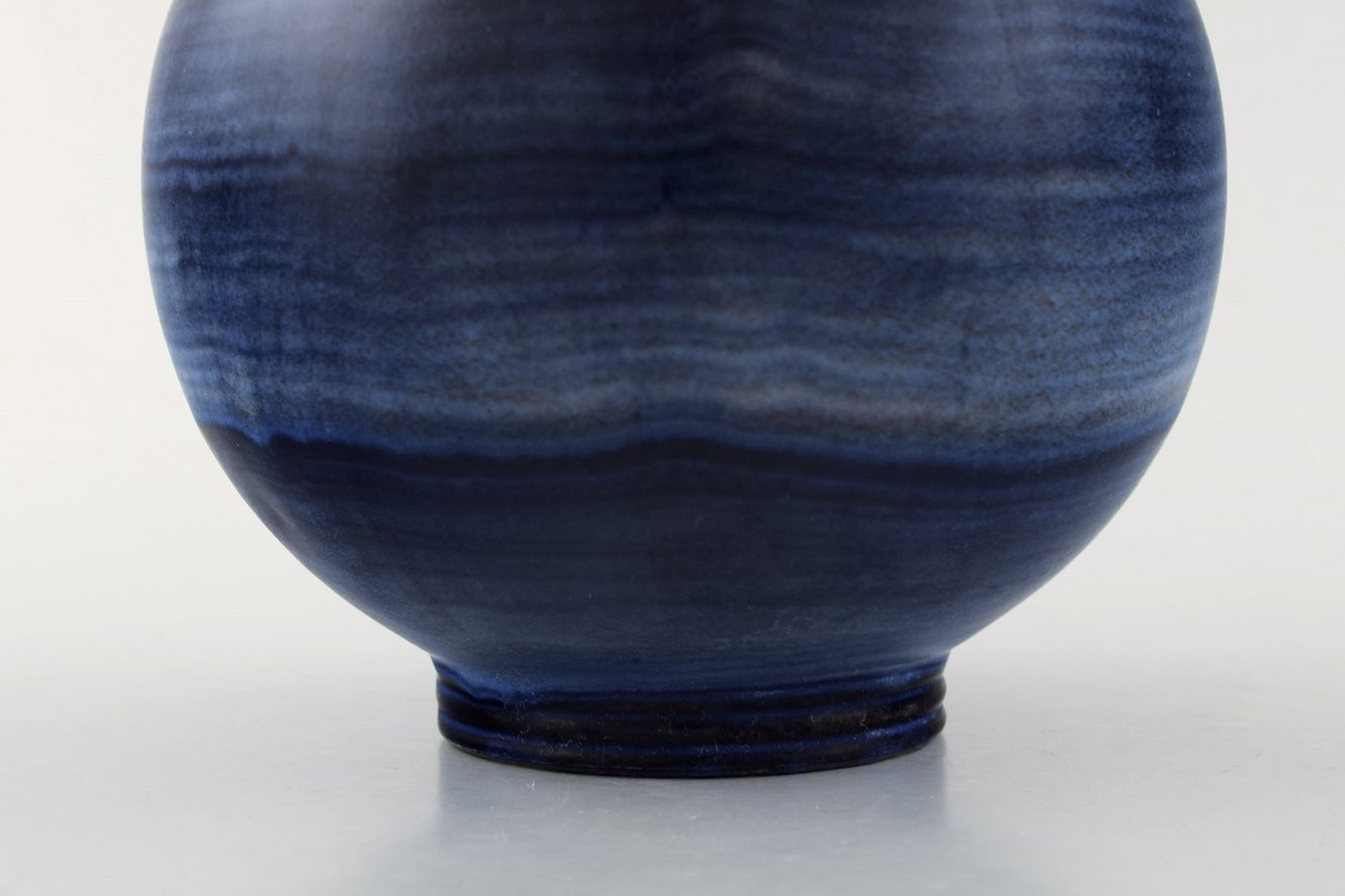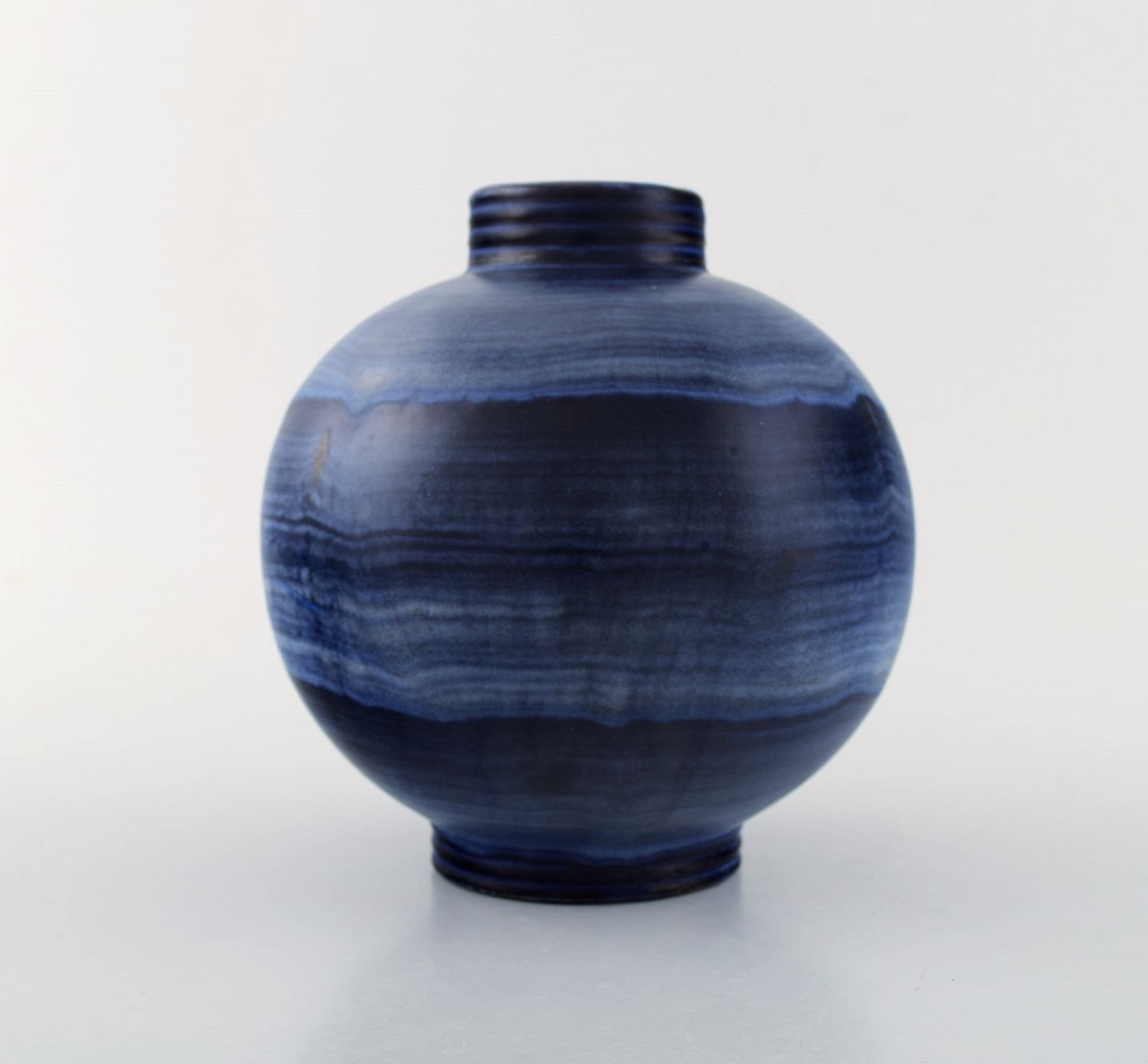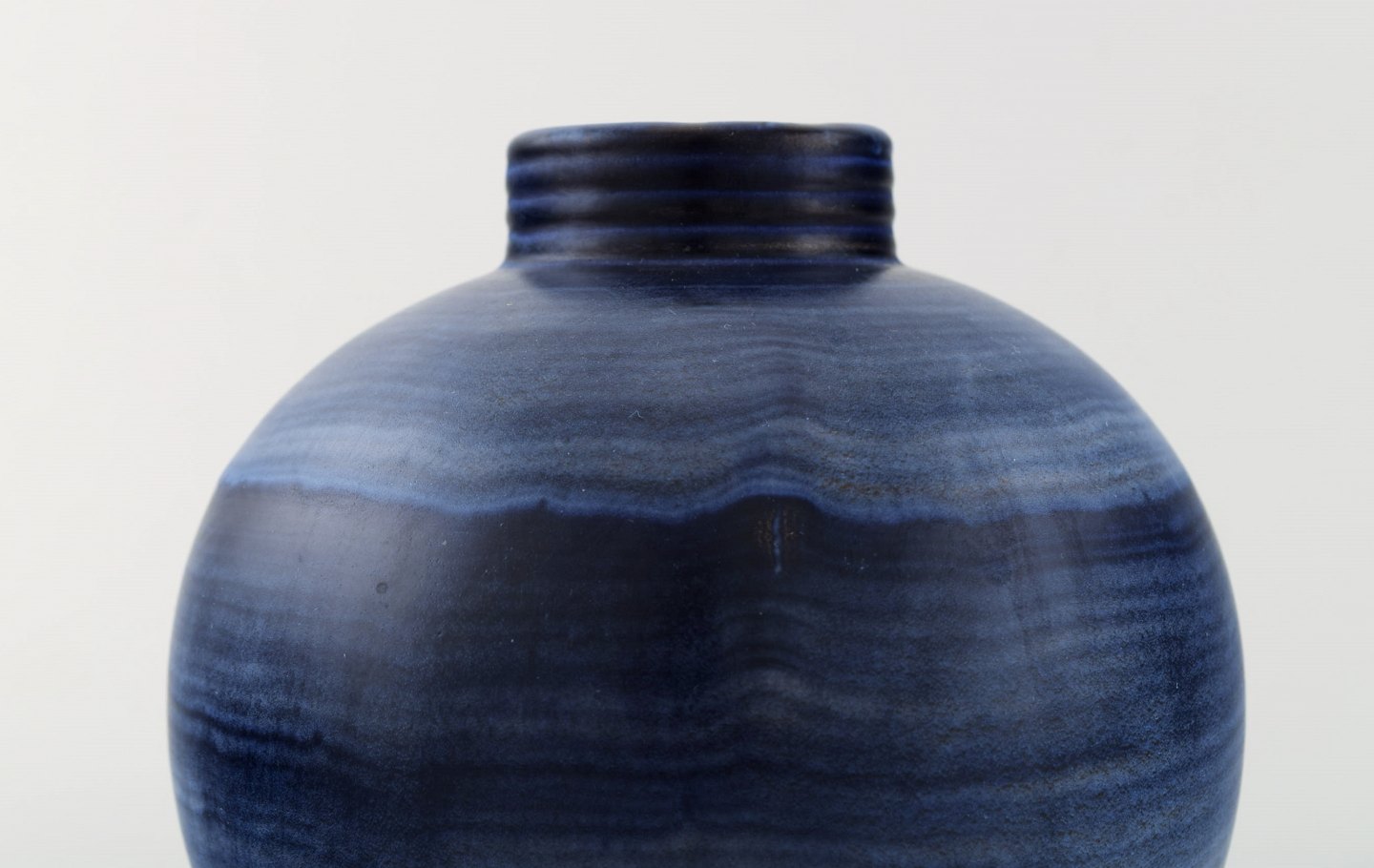 Ilse Claesson for Rørstrand. Sjælden rund art deco vase. Smuk glasur i dybe blå nuancer. 1930'erne. Måler: 16 x 15 cm. I flot stand. 1. sortering. Stemplet.
