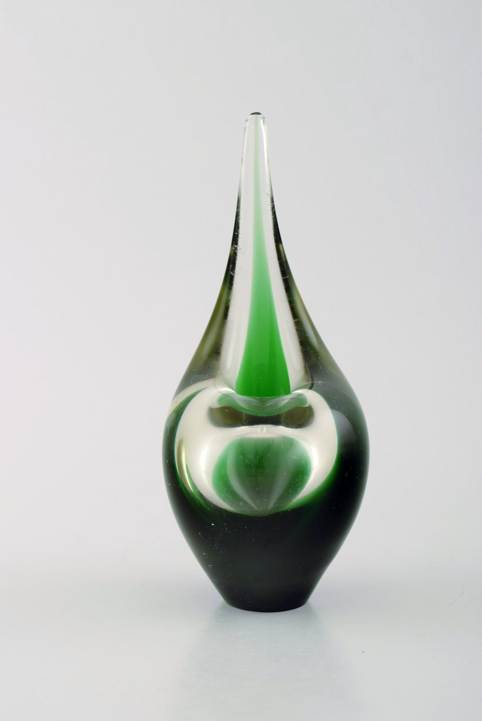 Per Lütken for Holmegaard. Samling af fem sjældne "Flamingo" vaser og skulpturer i grønt kunstglas. Dateret 1961.