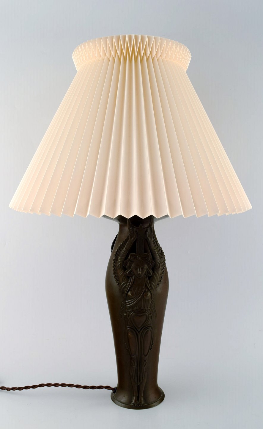 Gudmund Hentze (f. 1875, d. 1948), dansk billedhugger og maler. Bordlampe af patineret bronze med skønvirkemotiver i form af kvindeskikkelser. Ca. 1910. Udført af Tvermoes & Arahamson.
