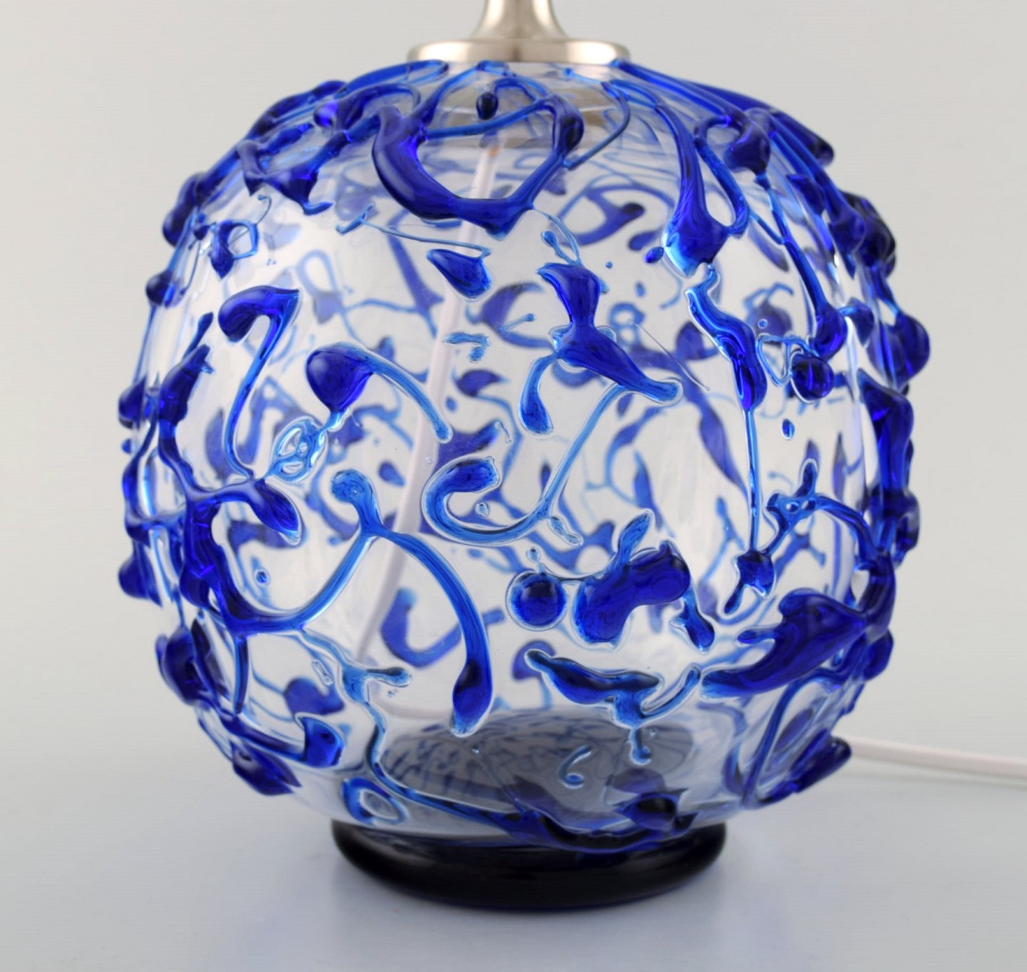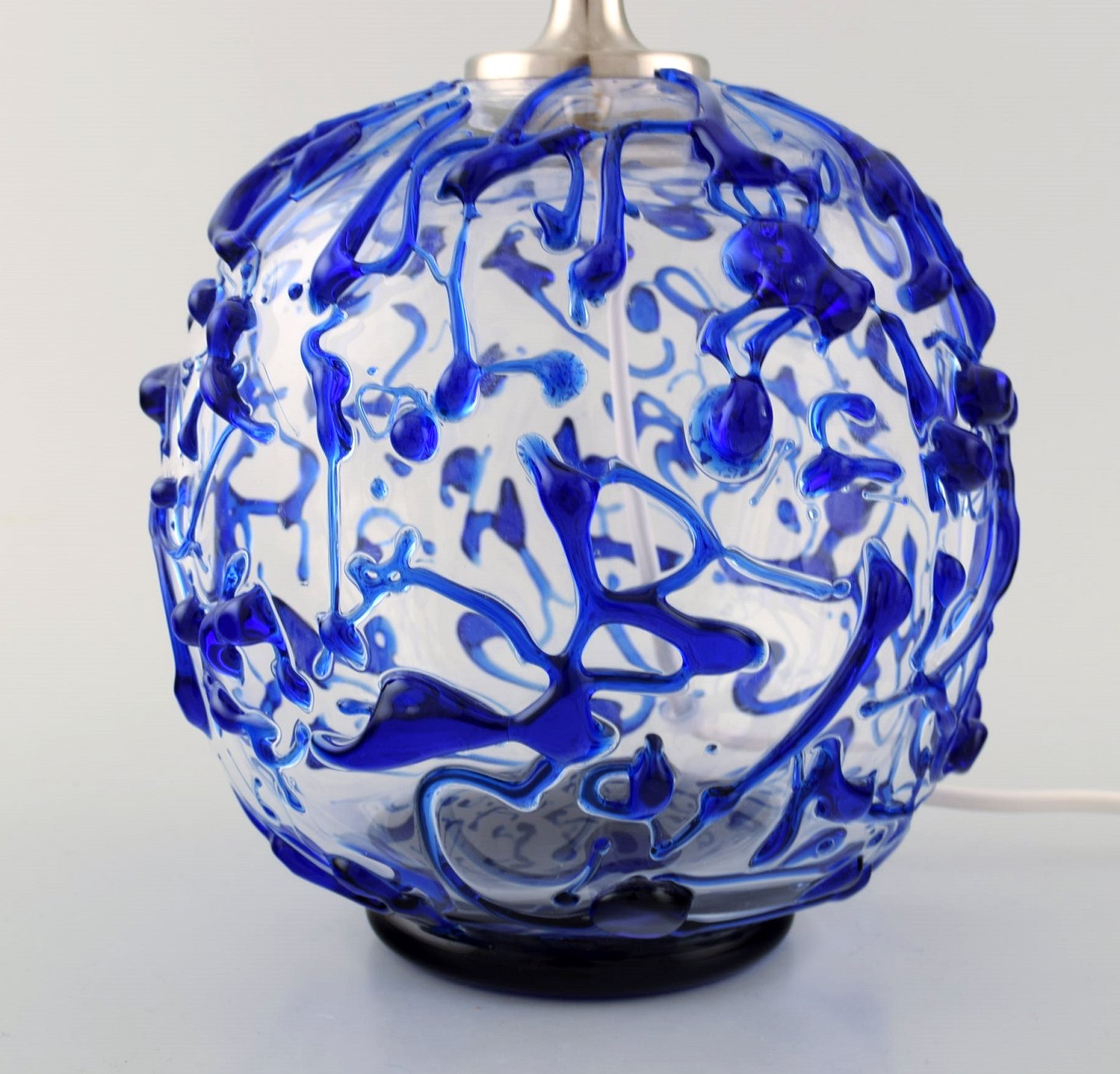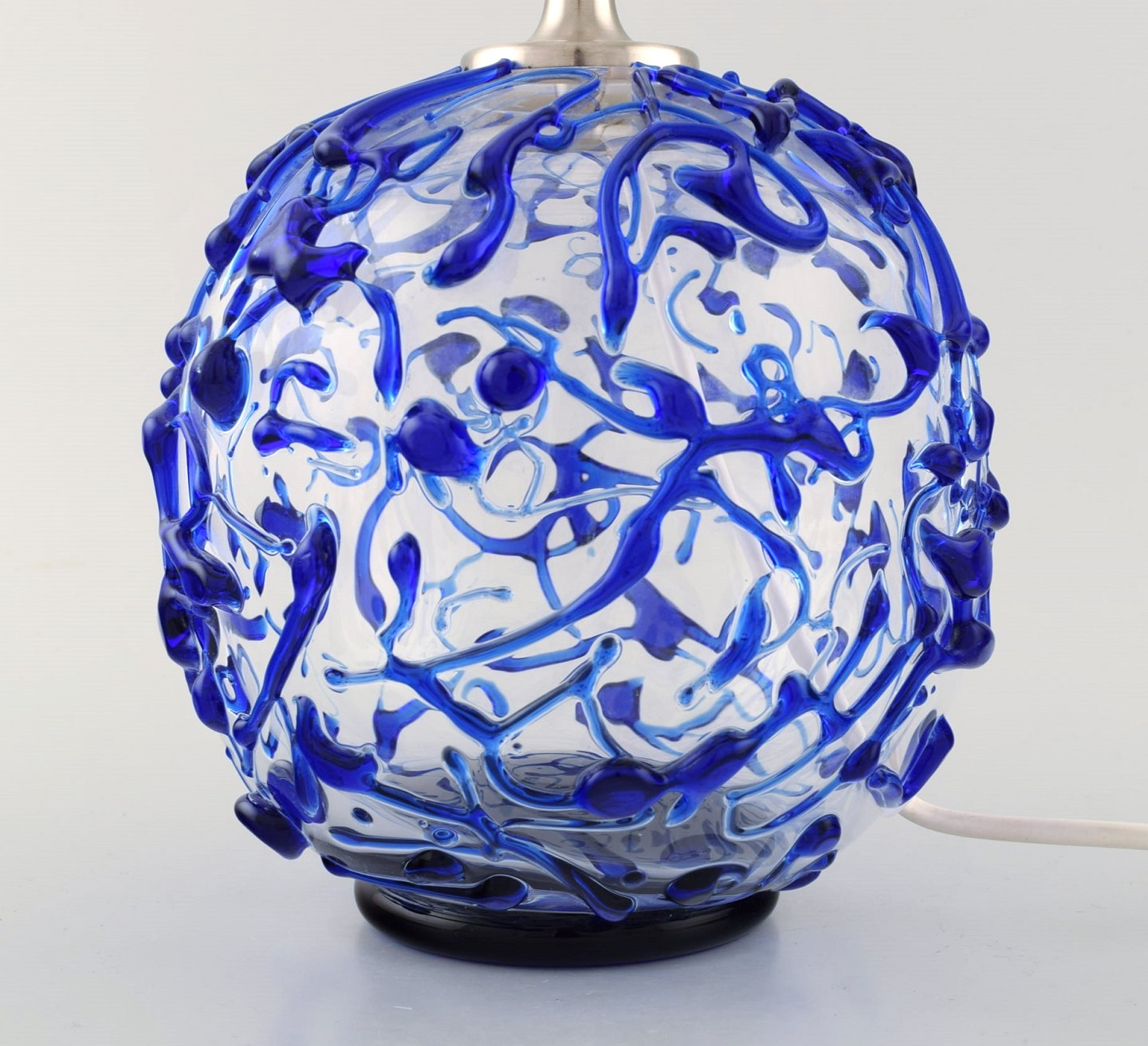 Kastrup / Holmegaard. Sjælden kuglerund bordlampe i klart og blåt kunstglas. Moderne design, 1960'erne. Lag af "karamelliserede" strejf.