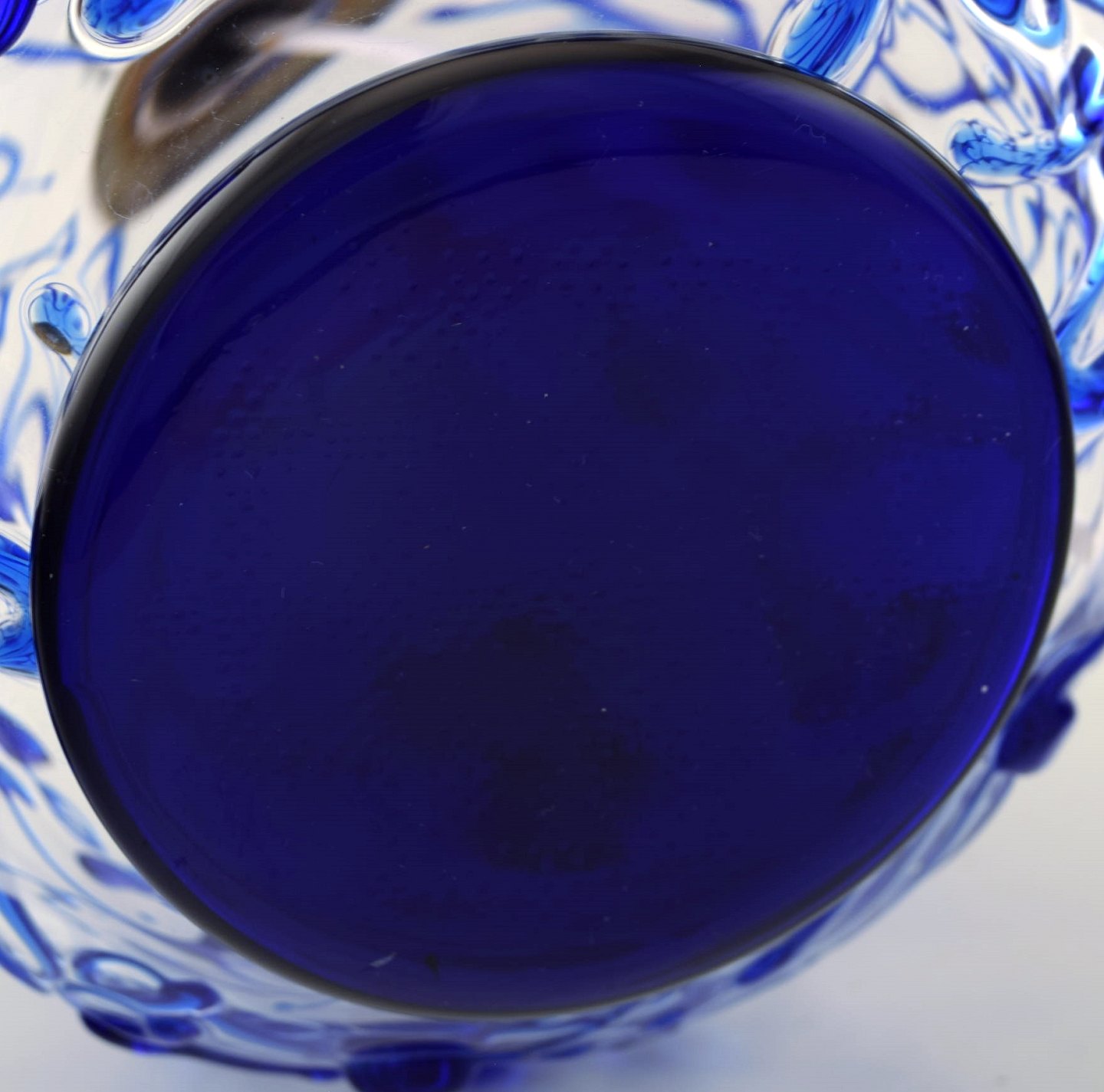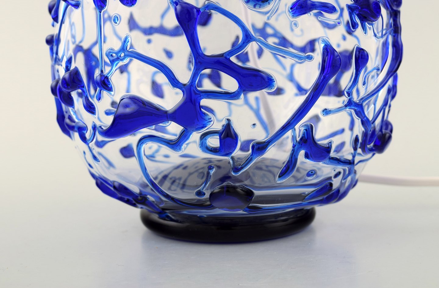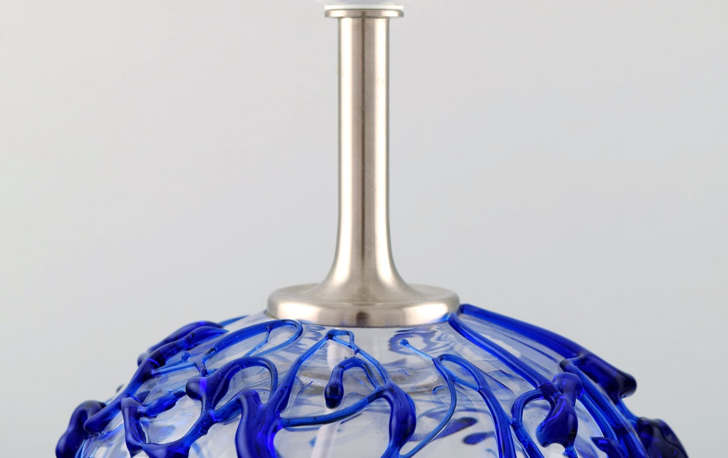 Kastrup / Holmegaard. Sjælden kuglerund bordlampe i klart og blåt kunstglas. Moderne design, 1960'erne. Lag af "karamelliserede" strejf.