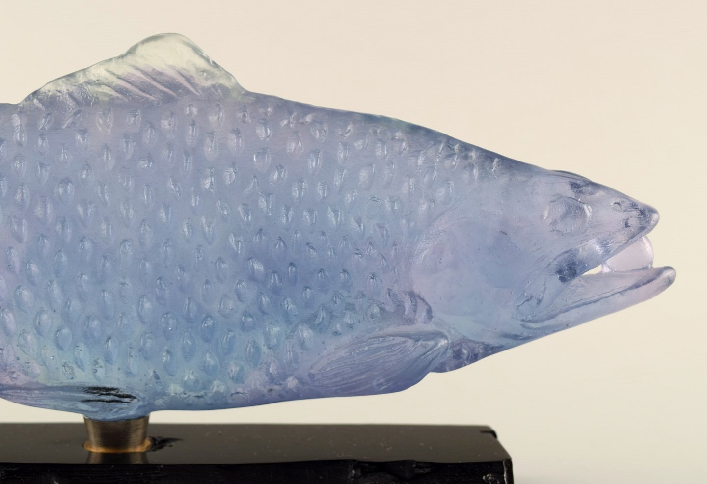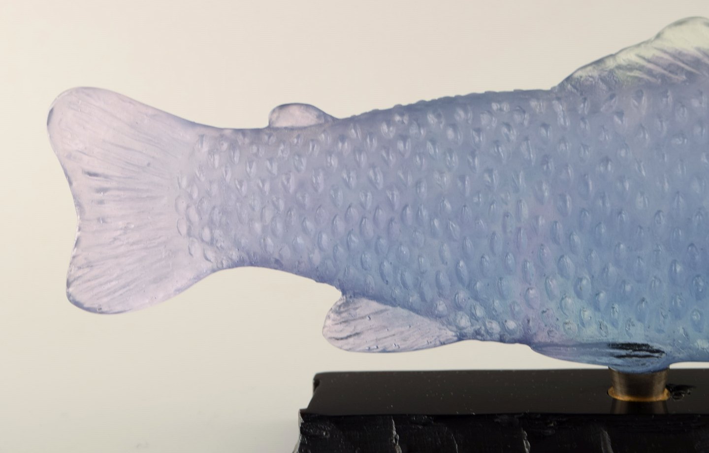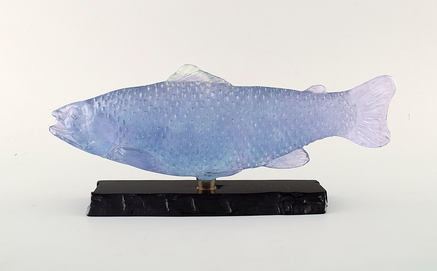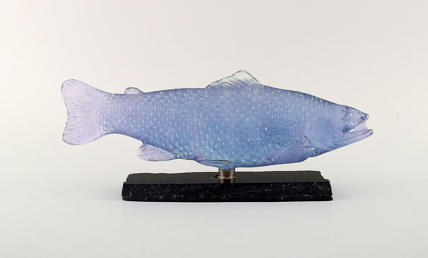 Daum, Frankrig. Fisk i lilla kunstglas på fod af sort marmor. 1900-tallet. i flot stand. Signeret. Måler: 27,5 x 11 cm.