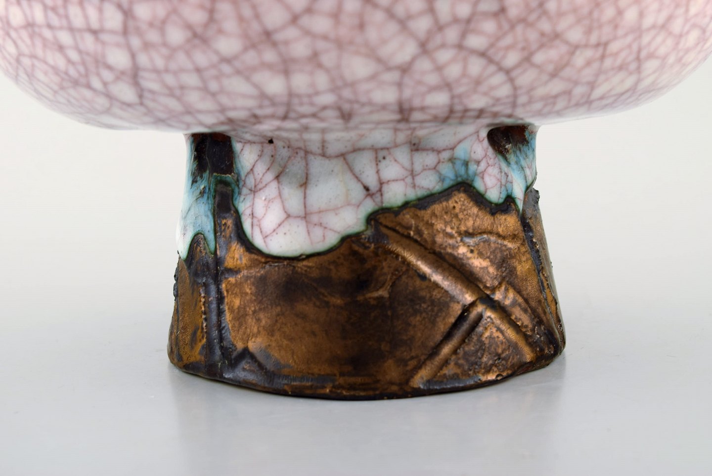 Pieter Groeneveldt (f. 1889, d. 1982). Stor krakeleret / craquelé vase på fod i glaseret keramik. 1940/50'erne. Smuk glasur i lyserøde og bronze nuancer.