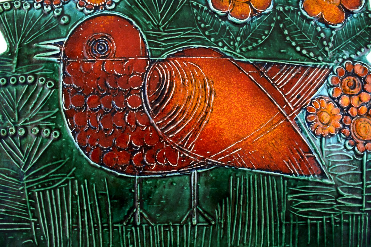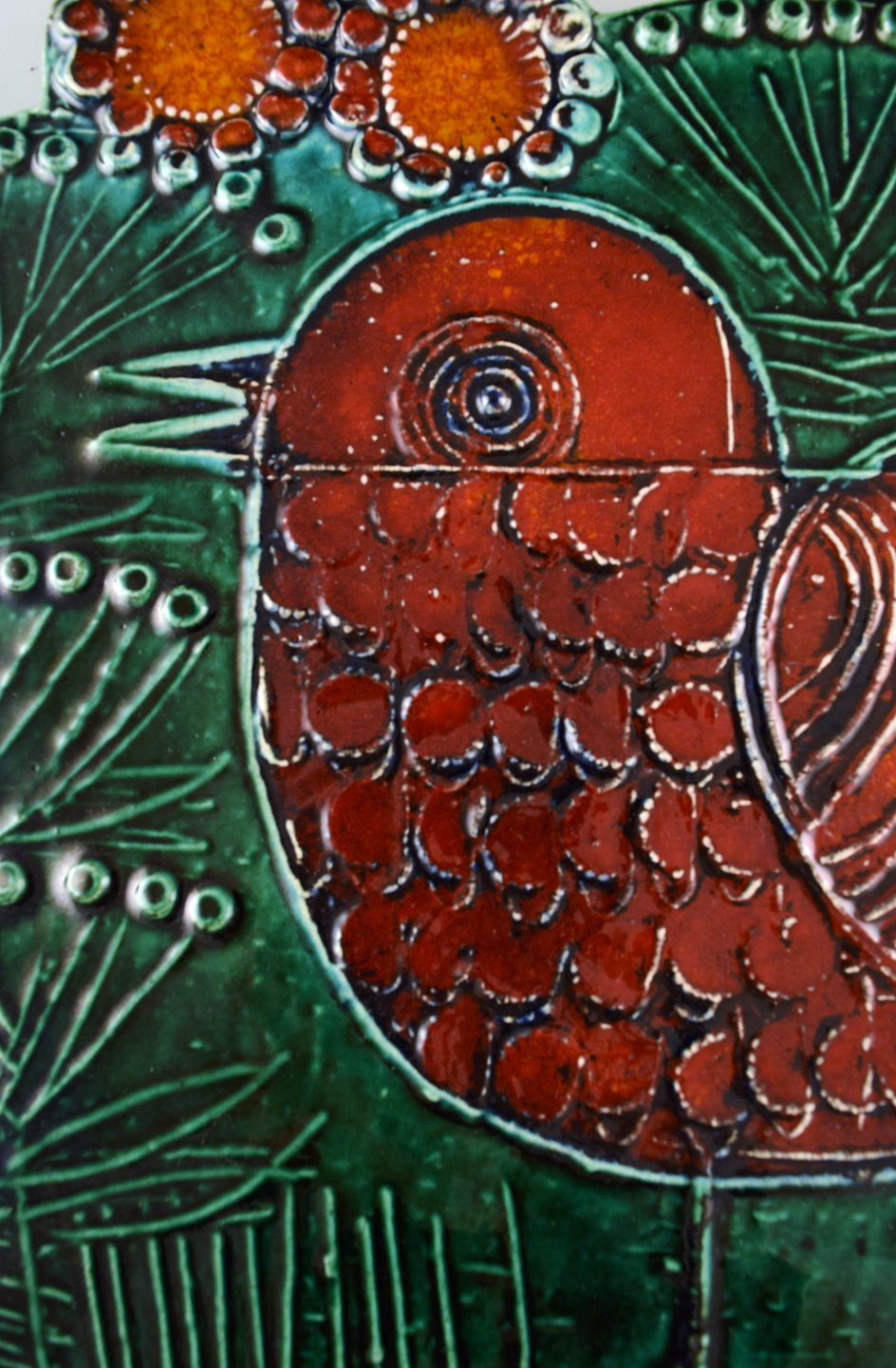 Lisa Larson for Gustavsberg. Stor og sjælden vægdekoration. Rød fugl på grøn baggrund. 1960'erne. I flot stand. Stemplet. Måler: 42 x 31,5 cm.