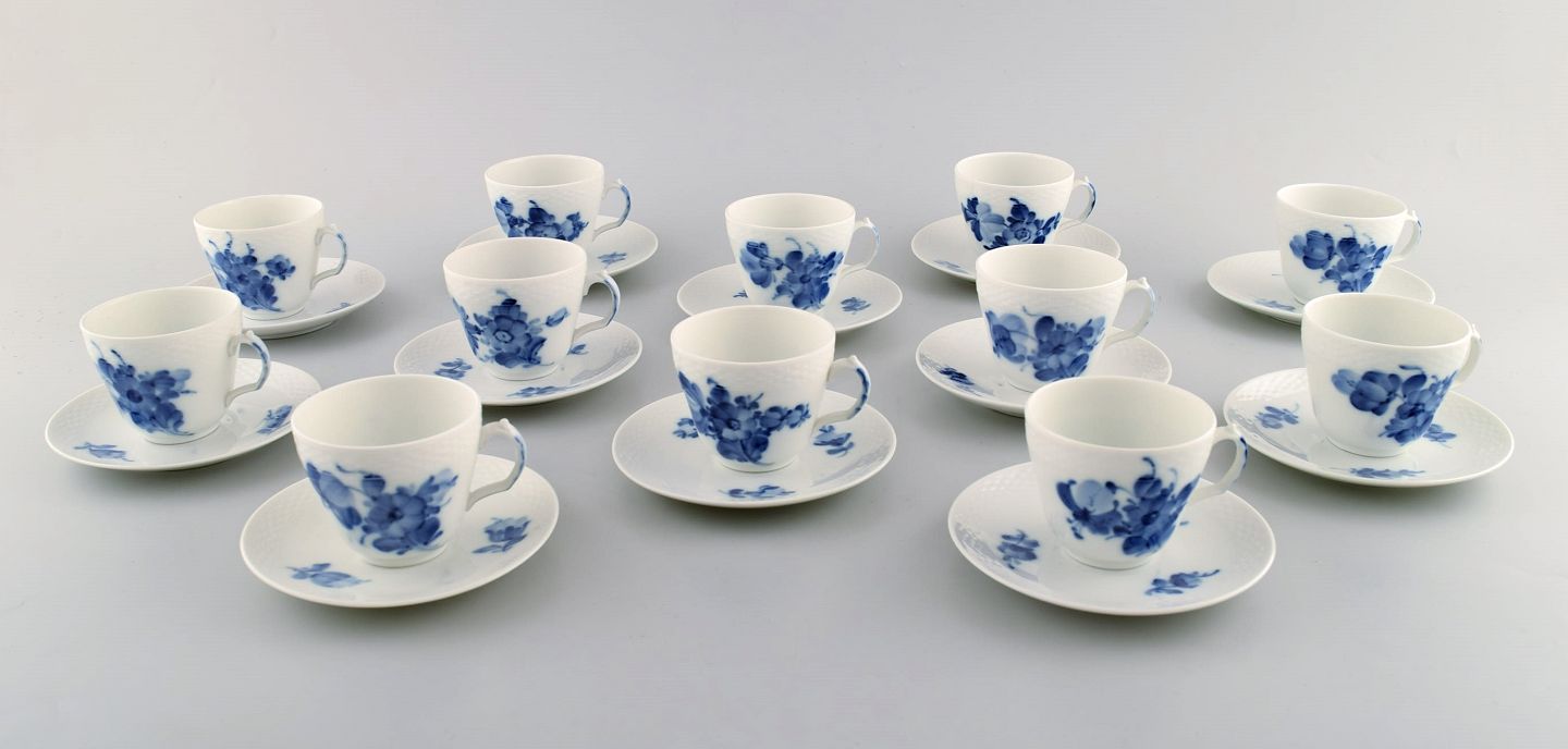 Royal Copenhagen. Sæt på tolv blå blomst flettet espressokopper med tilhørende underkop. Nummer 10/8046.
