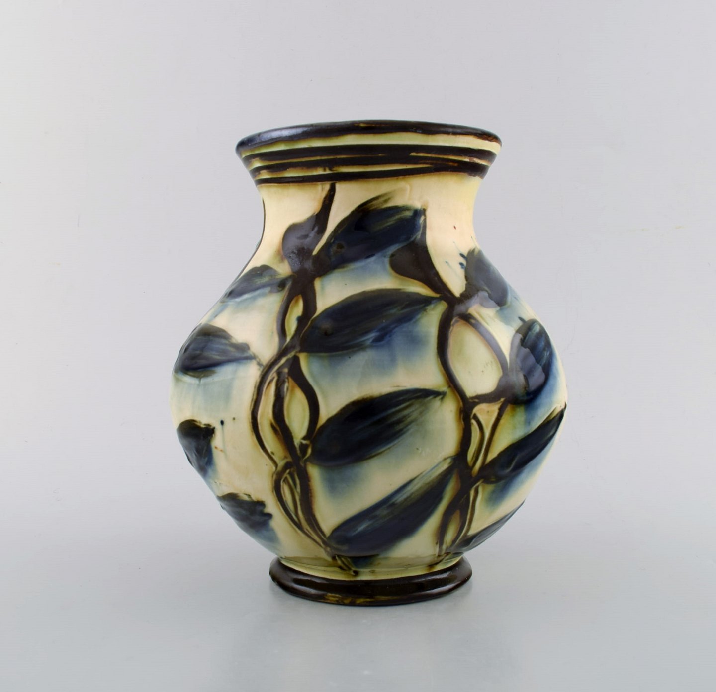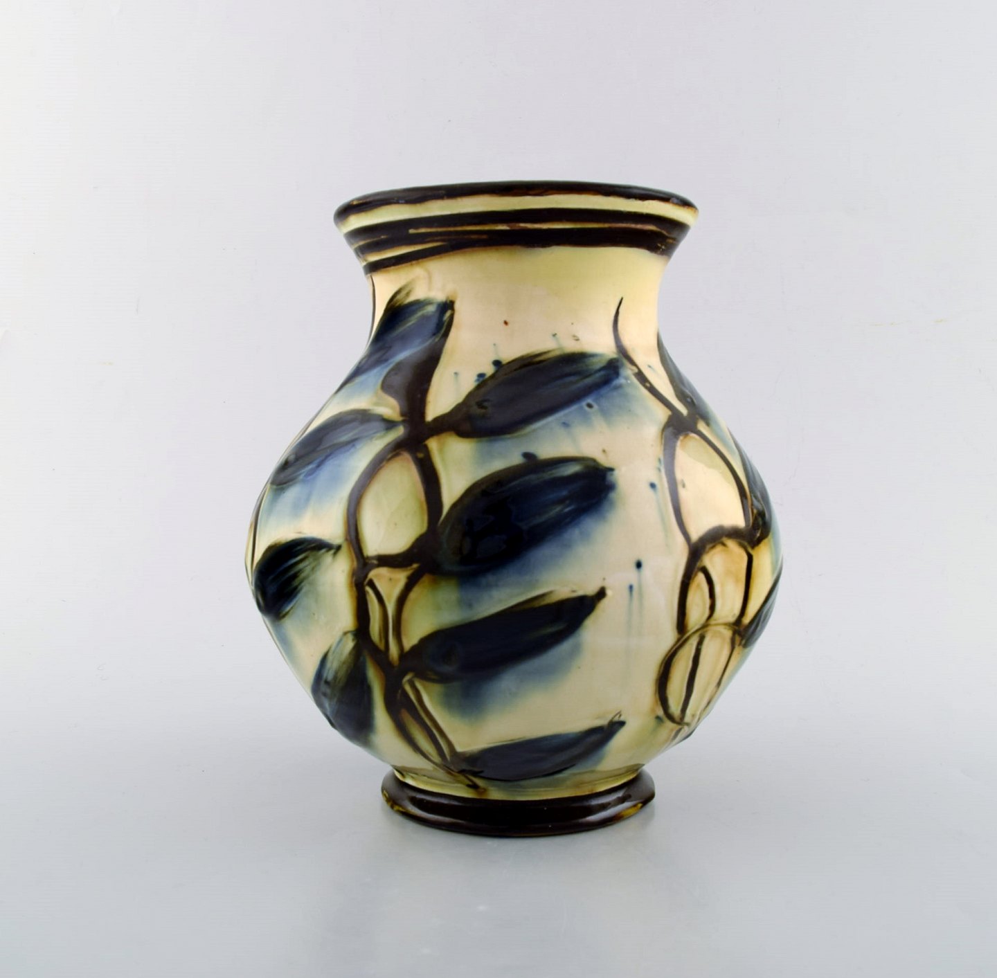 Kähler, HAK, glaseret stentøjsvase i moderne design. 1930/40´erne. Kohornsteknik. Blå blomster på cremefarvet baggrund. Stemplet. Måler : 21 x 20 cm. I flot stand.