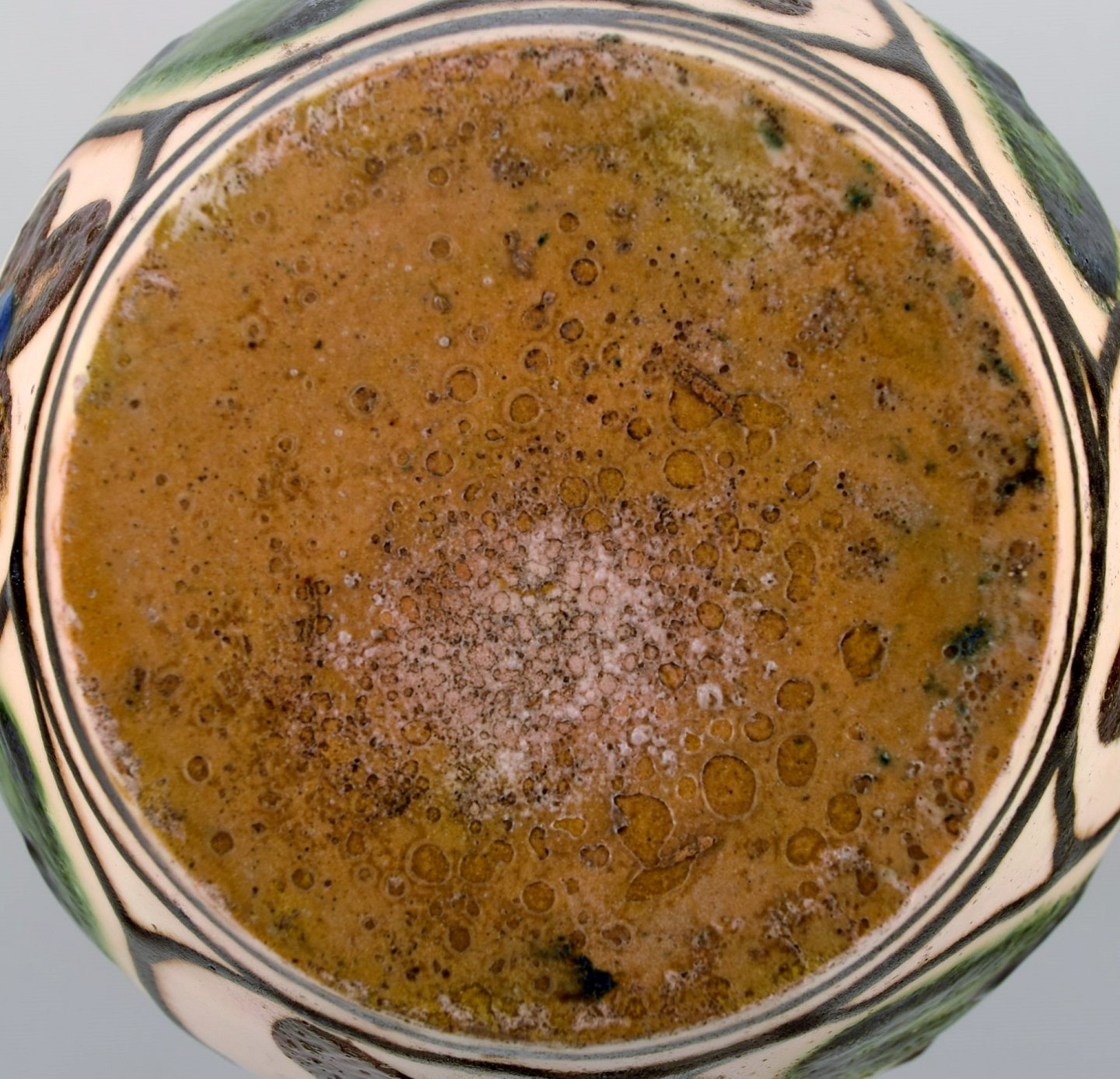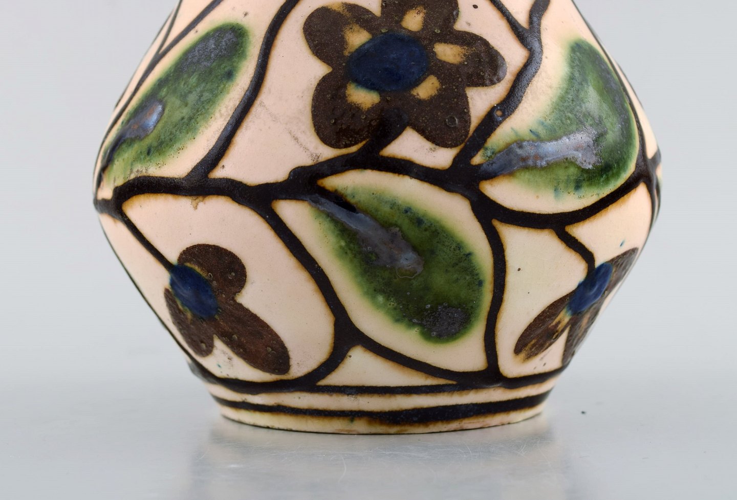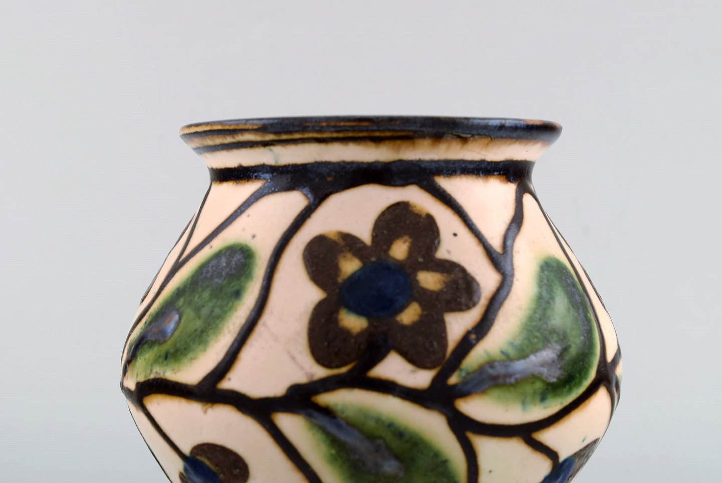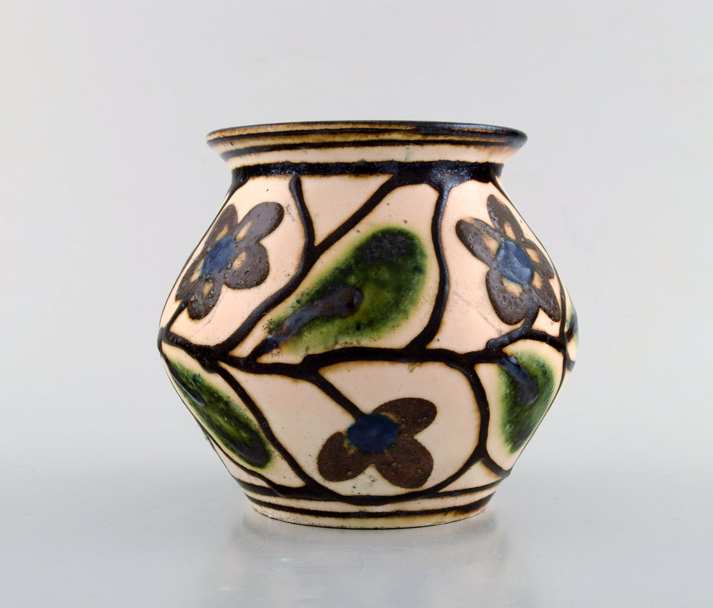 Kähler, HAK, glaseret stentøjsvase i moderne design. 1930/40´erne. Kohornsteknik. brune blomster på cremefarvet baggrund. Måler : 15 x 13 cm. I flot stand.