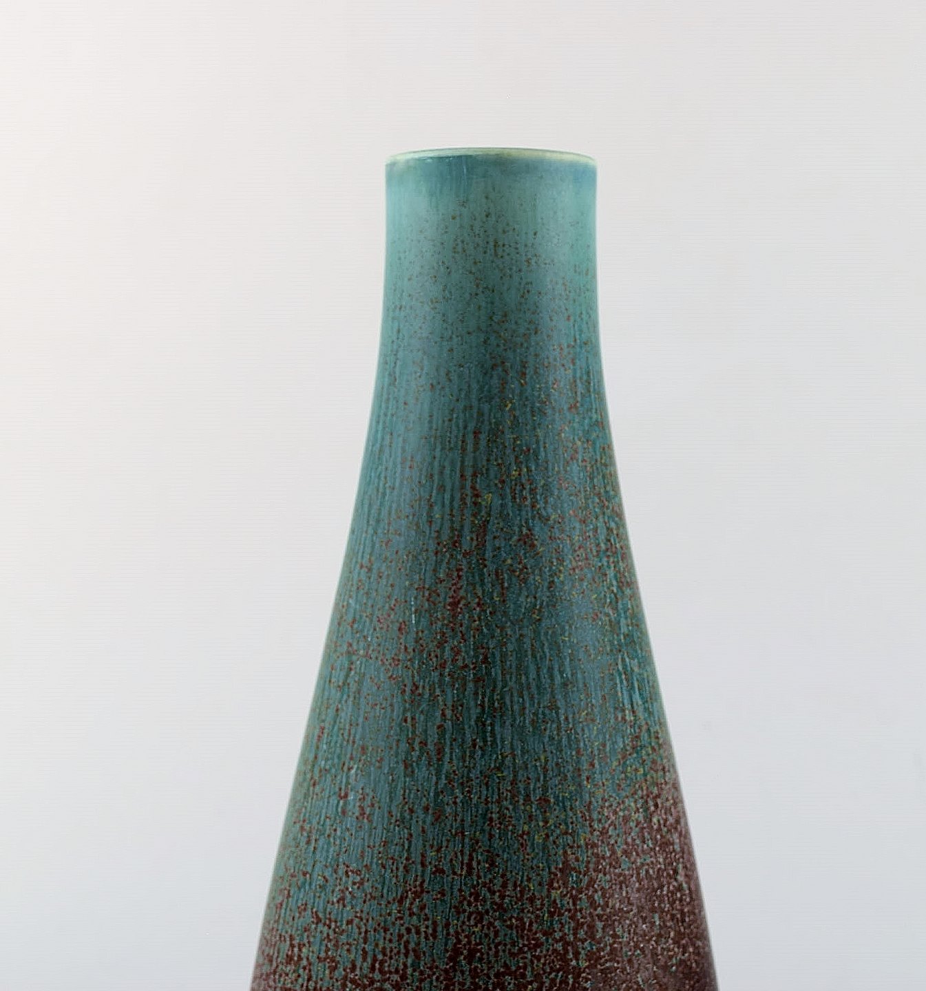 Gunnar Nylund for Rörstrand/Rørstrand. Stor stentøjsvase. 1950'erne. Måler: 28,5 x 12 cm. I perfekt stand. Flot glasur i lilla og blå grønne nuancer. 2. sortering. Stemplet.