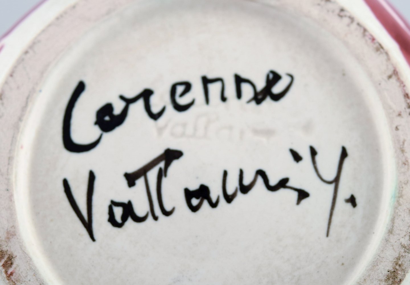 Atelier Cerenne, Vallauris. Sæt på fem håndmalede unika kopper og kande i glaseret stentøj. 1950'erne. I flot stand. Signeret. Koppen måler: 10,5 x 9 cm (uden hank) Kanden måler: 20,5 x 19 cm.