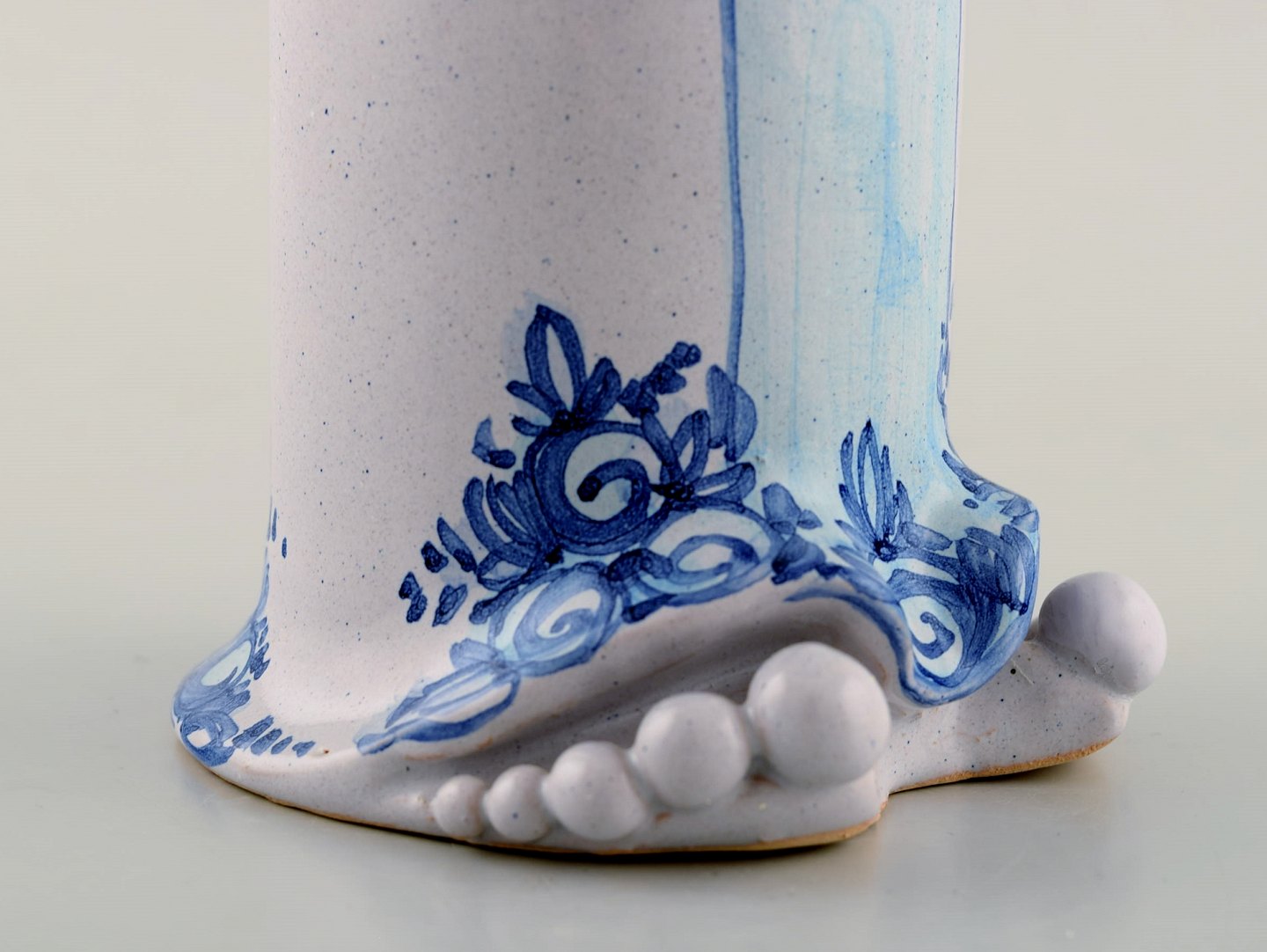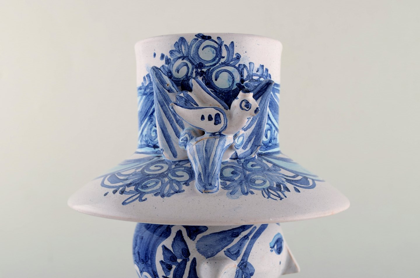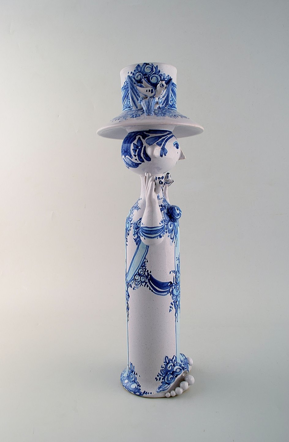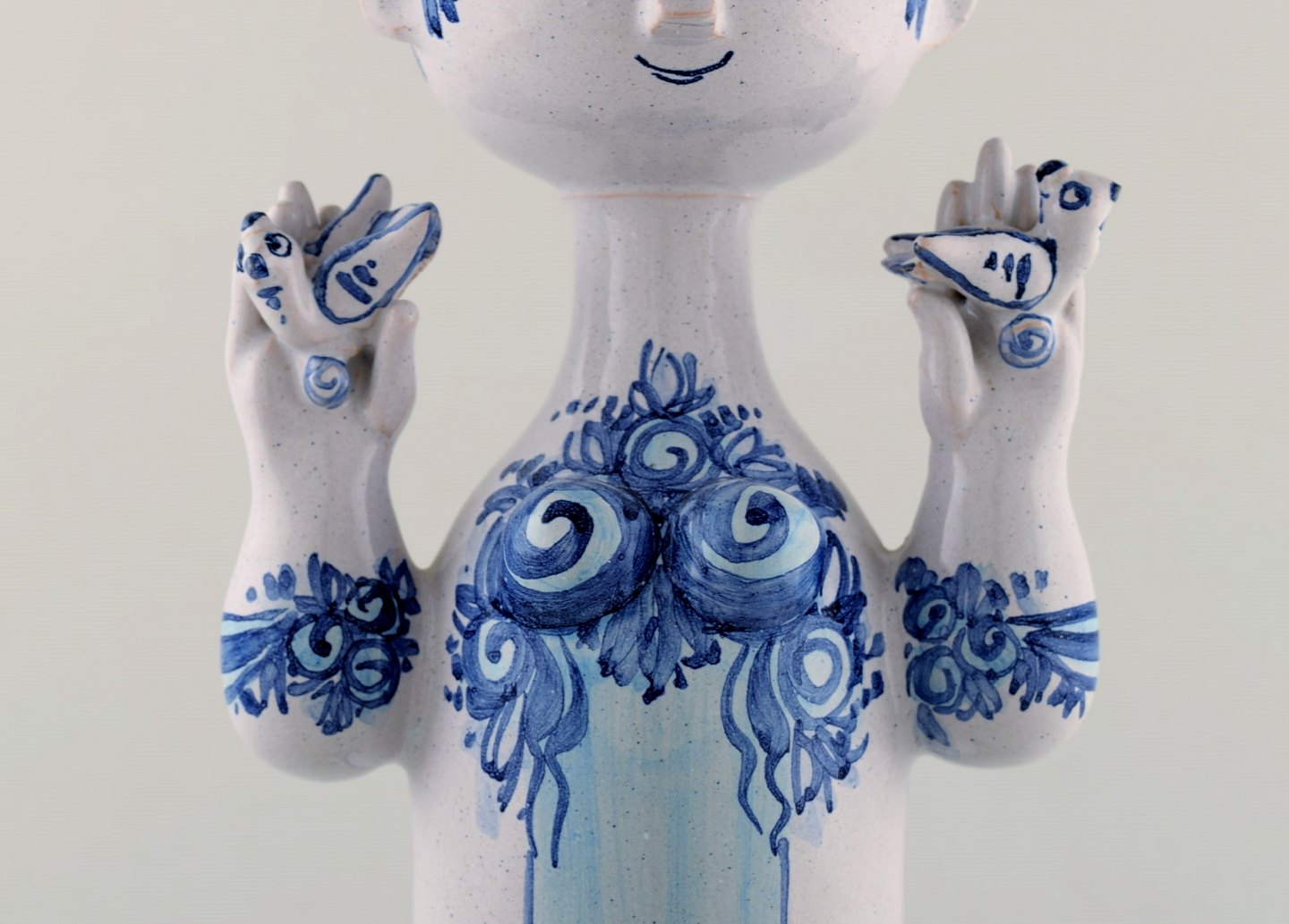Bjørn Wiinblad keramik, blå dame med to fugle. Dekorationsnummer M36. Dateret 2000. Højde 39 cm. Diameter 15 cm. I perfekt stand.