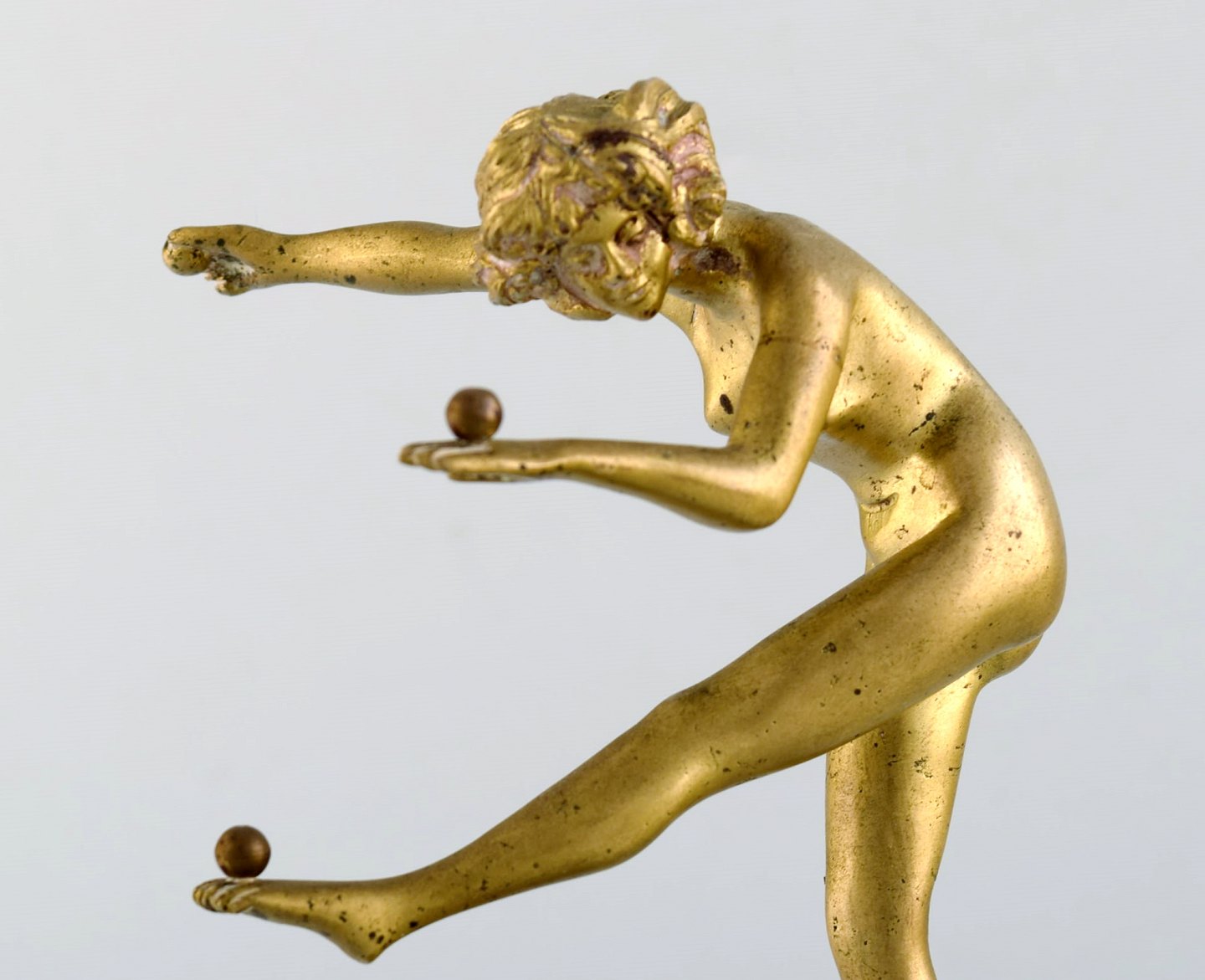 Art deco bronzeskulptur. Nøgen kvinde jonglerende med bolde. Fod i messing med lyserød marmor. 1930'erne.