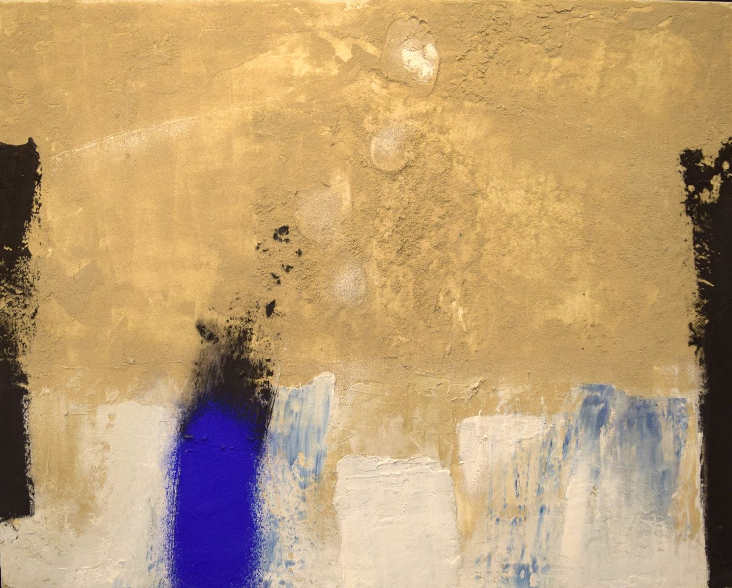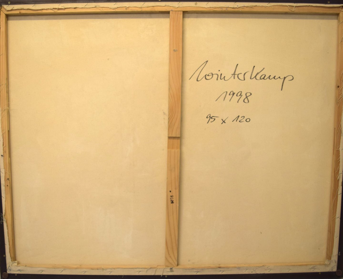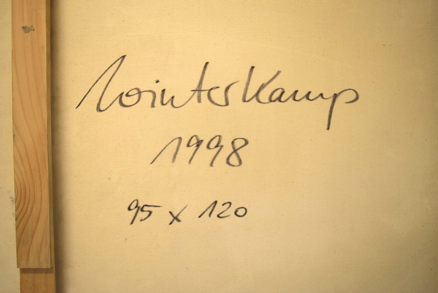 Petra Winterkamp. Tysk samtidskunstner. Blandingsteknik på lærred. "Komposition mit blau". Stålramme. Dateret 1998. Signeret og dateret. I flot stand. Måler: 120 x 95 cm.