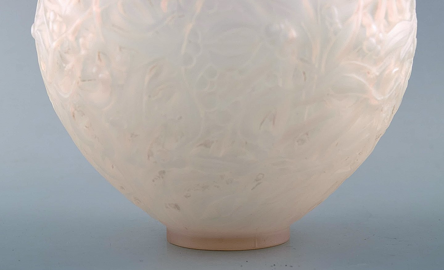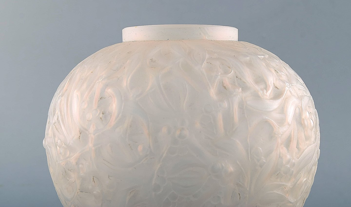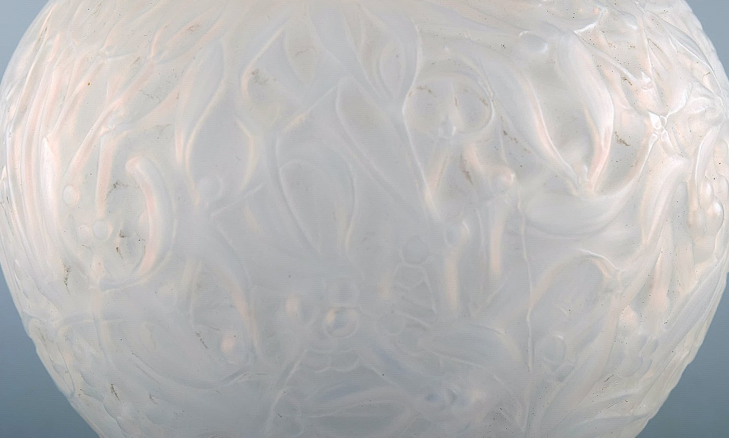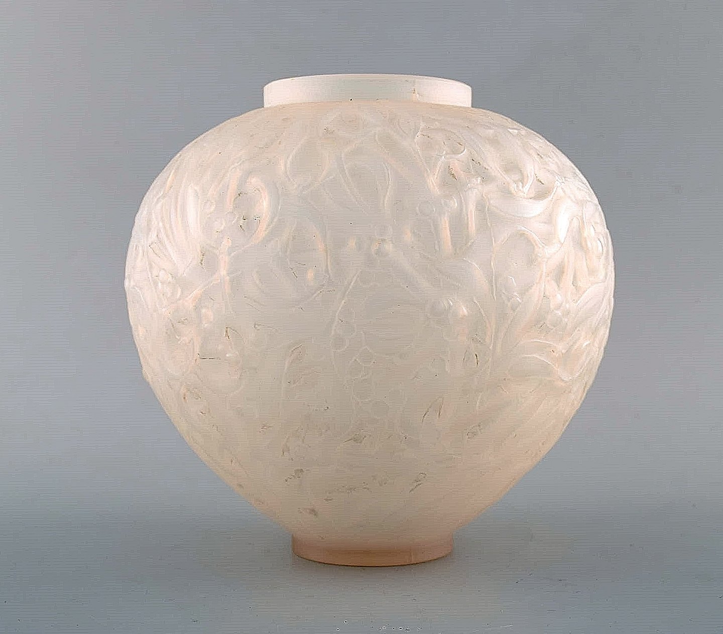 Early René Lalique "Gui" vase in clear and frosted art glass. Moulded with branches of mistletoe. Model number 948. Designed 1920. Prior to 1945.