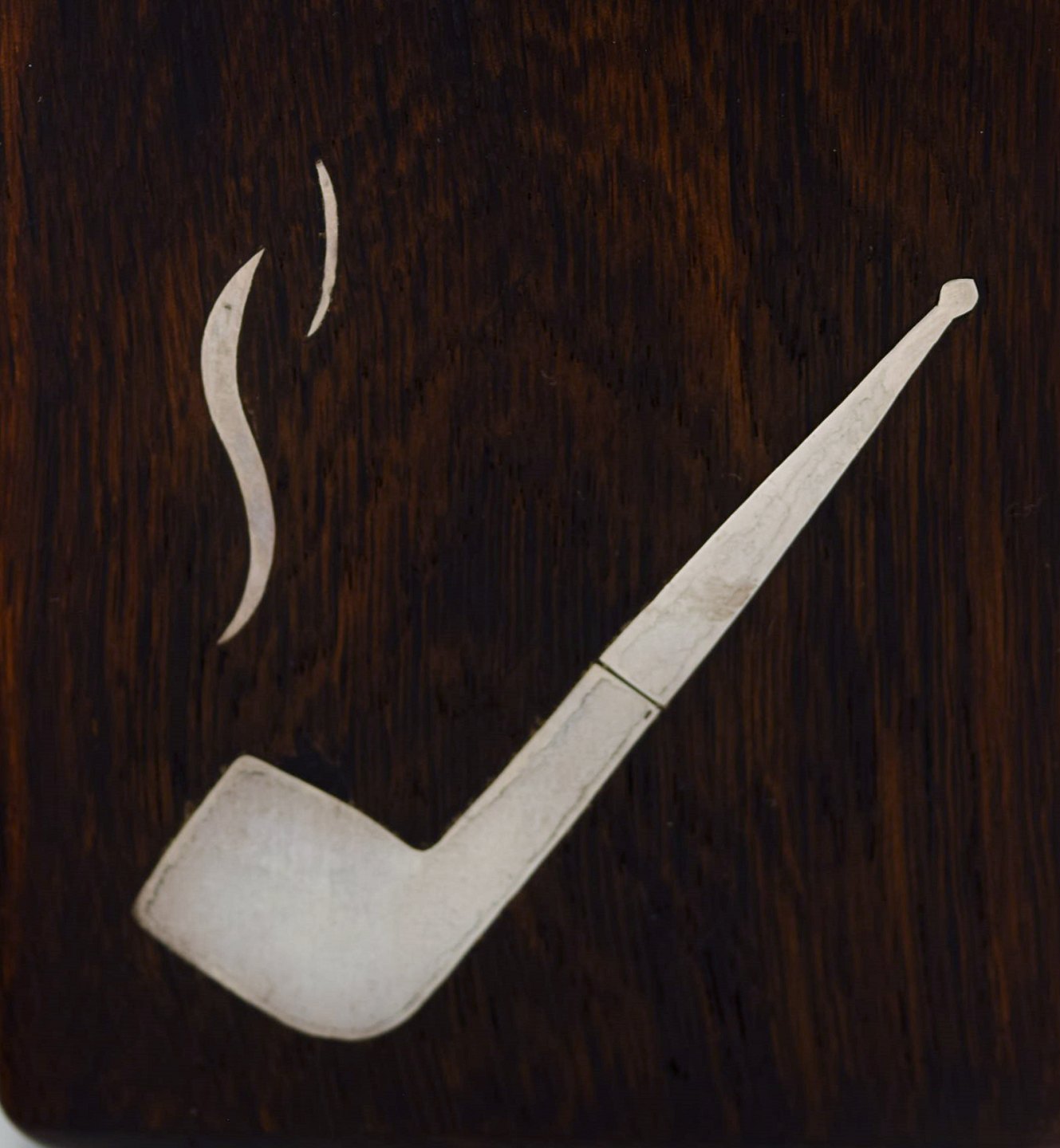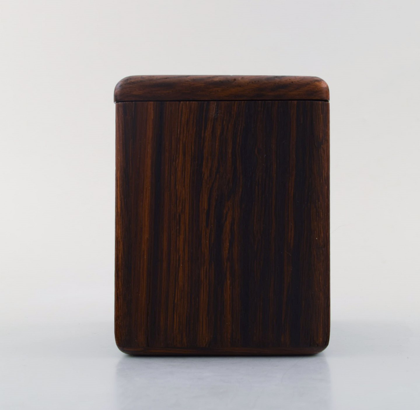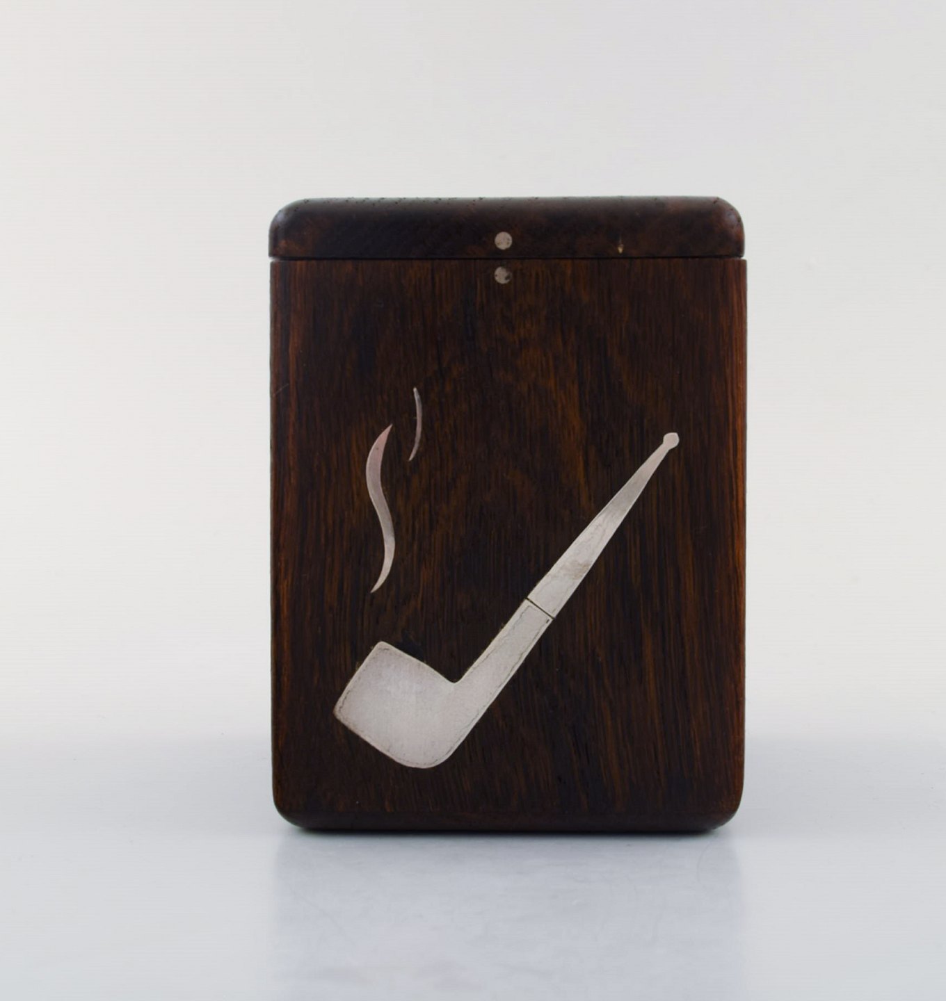 Svend Weihrauch for Franz Hingelberg, Aarhus. Tobakskrukke i palisander med sølvindlæg i form af pibe og tobaksblad. I flot stand. Måler: 12 x 9 cm.