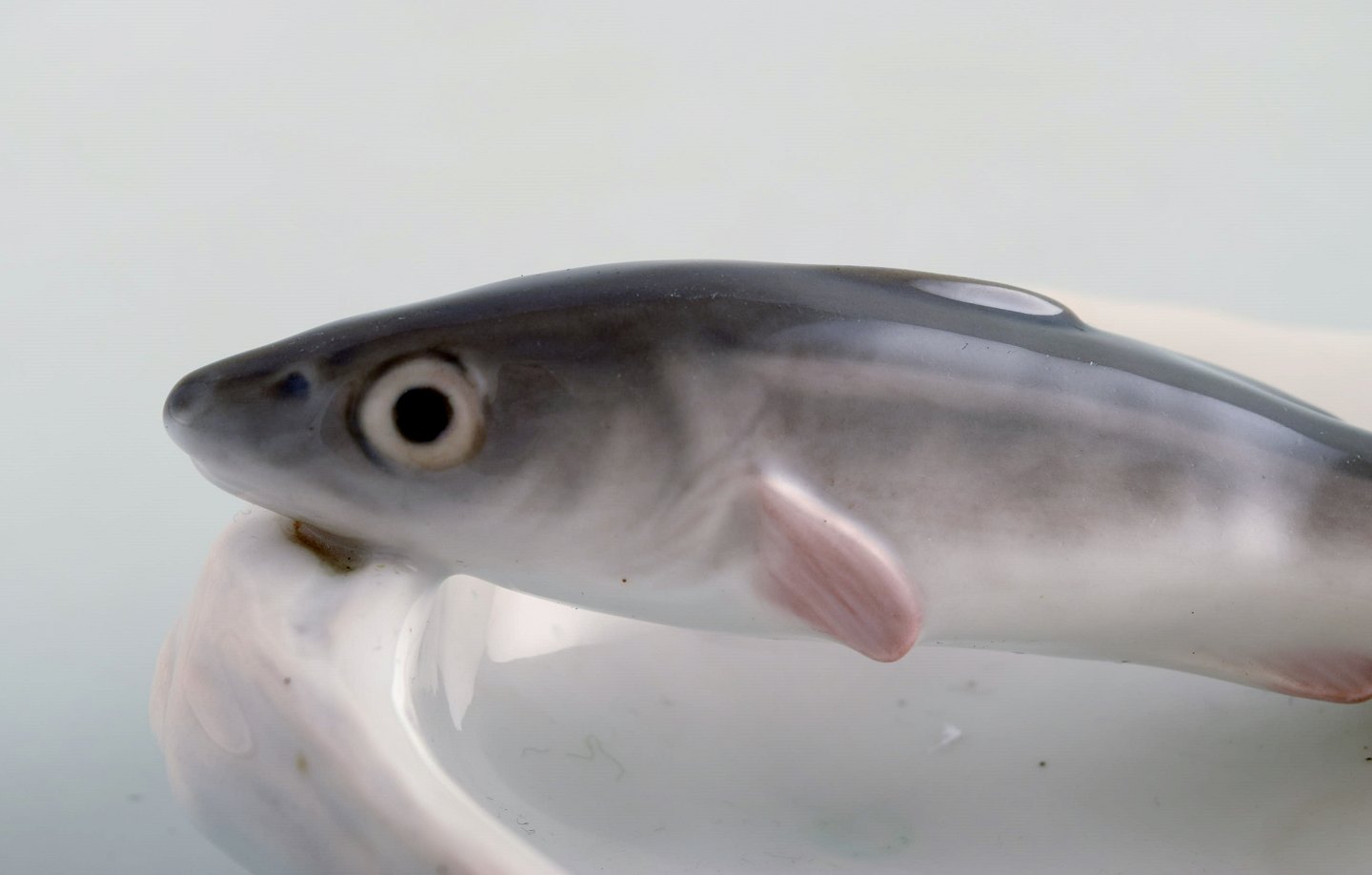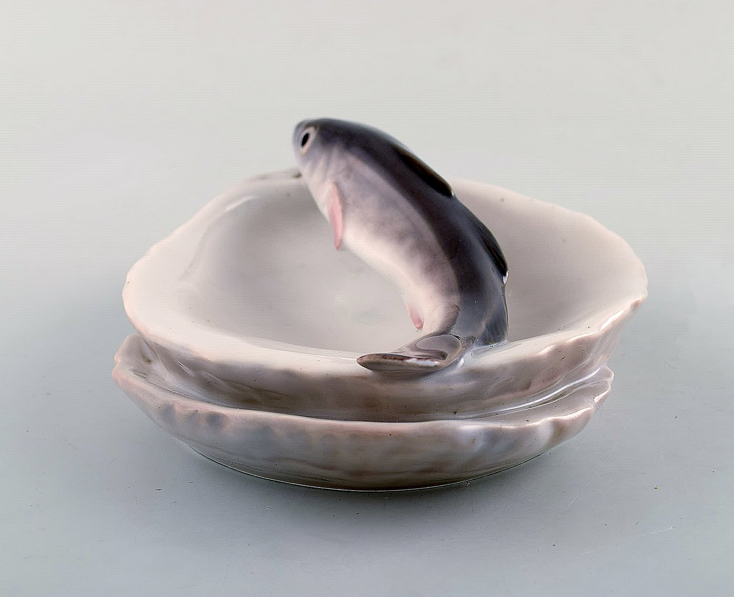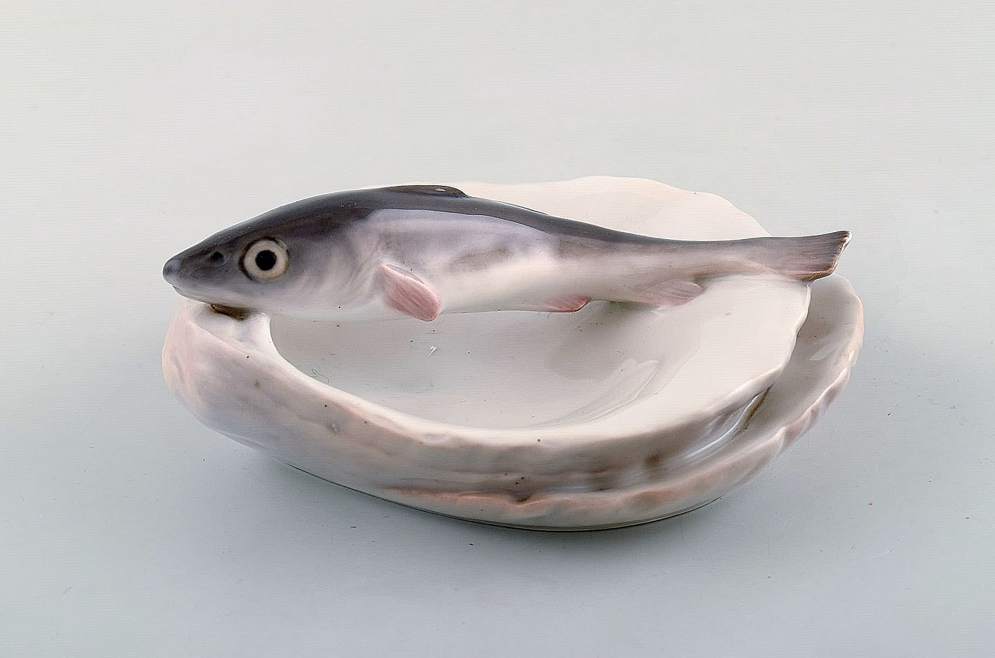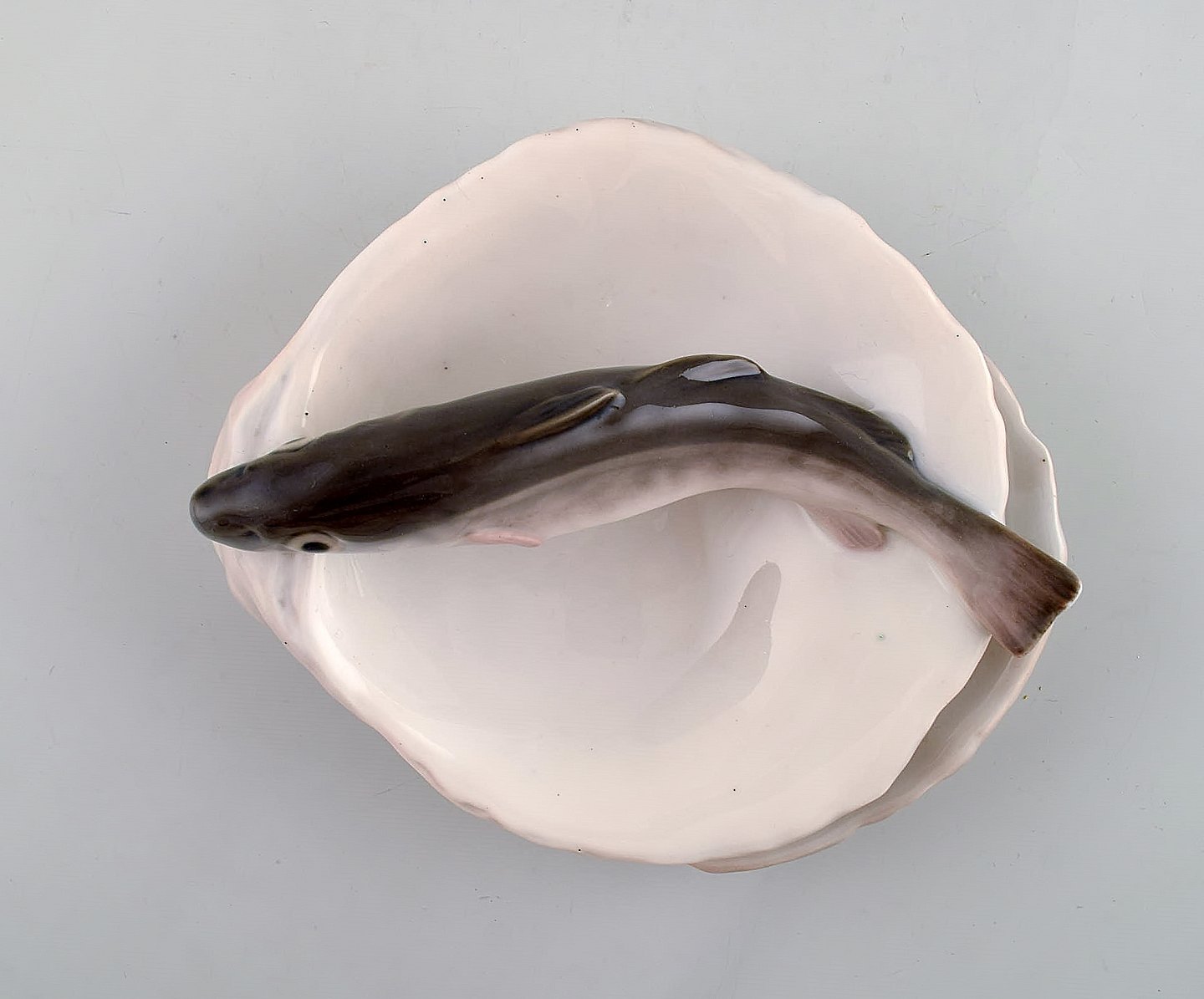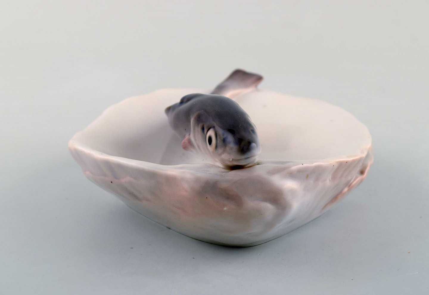 Royal Copenhagen. Sjælden art nouveau fad med fisk. Tidligt 1900-tallet. I flot stand. Måler: 16 x 6 cm. Stemplet.