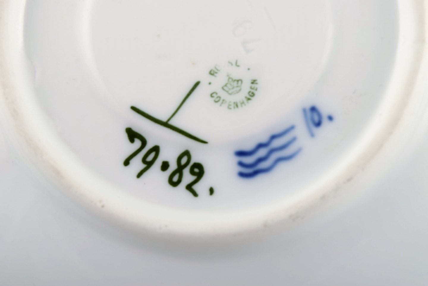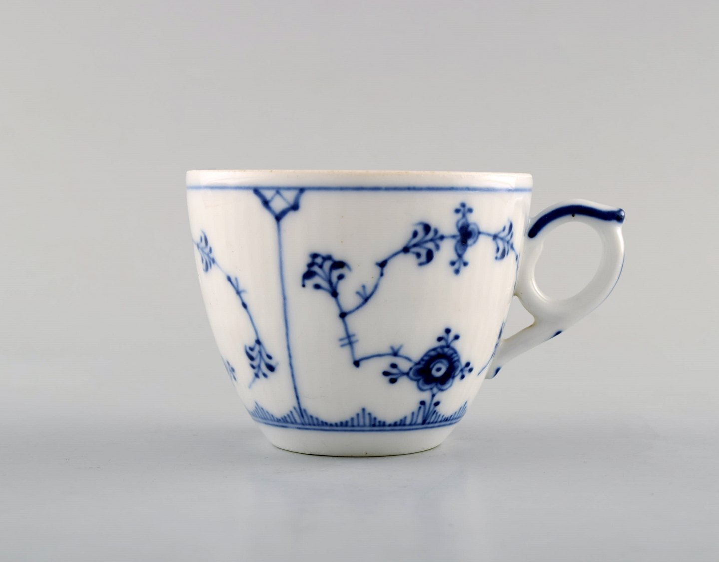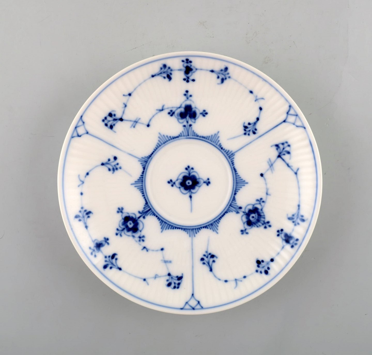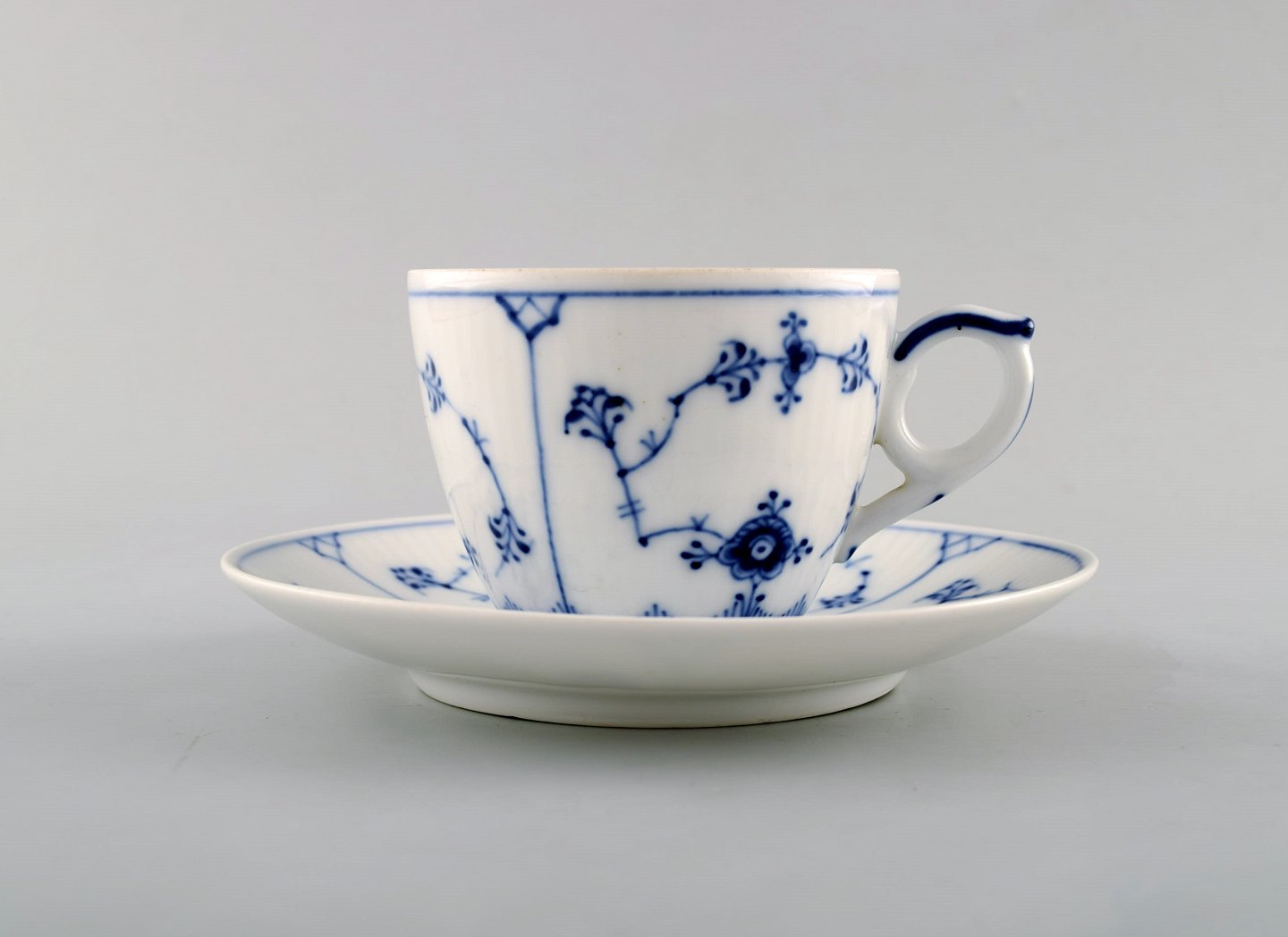 Royal Copenhagen. Sæt på syv Musselmalet riflet kaffekop med underkop # 1/79. I perfekt stand. 1. og 2. sortering. Stemplet. Kop diameter: 8 cm. Underkop diameter: 13,5 cm.