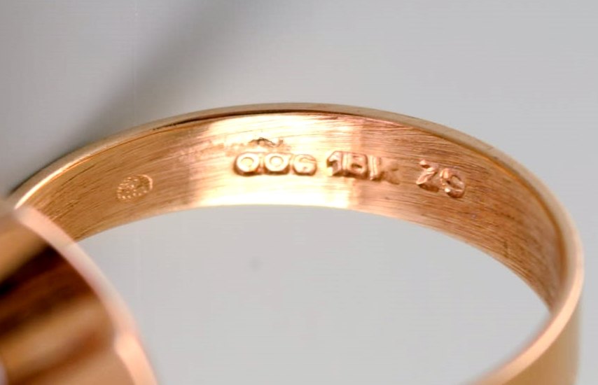 Svensk guldsmed. 18 karat guldring prydet med lilla halvædelsten. I flot stand. 1970'erne. Måler: 15 mm. Stemplet. I de fleste tilfælde kan vi mod et gebyr (kr. 300) pr ring, få ændret størrelsen.