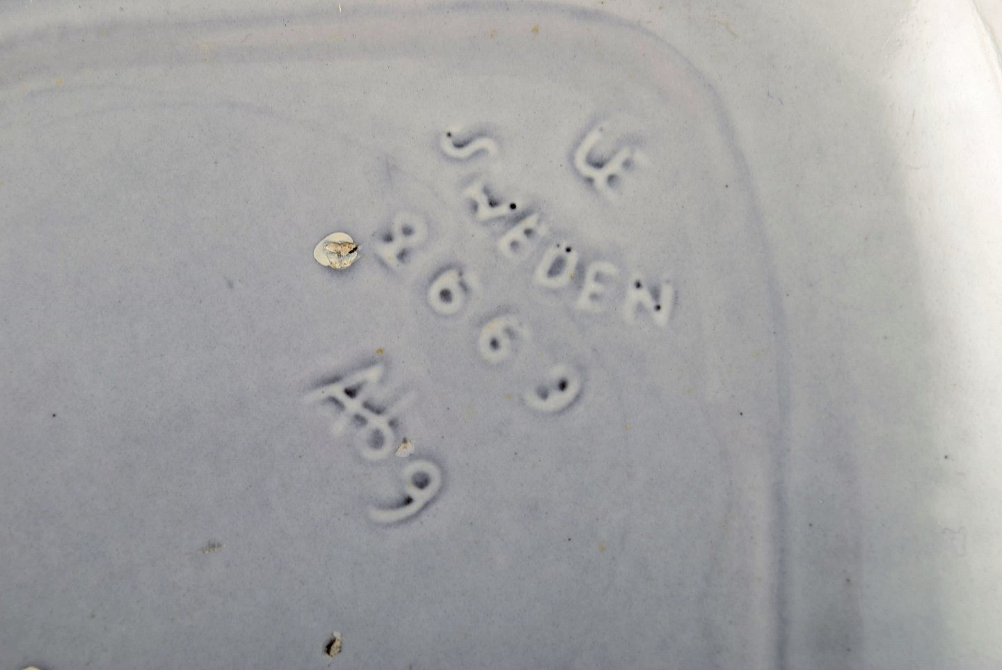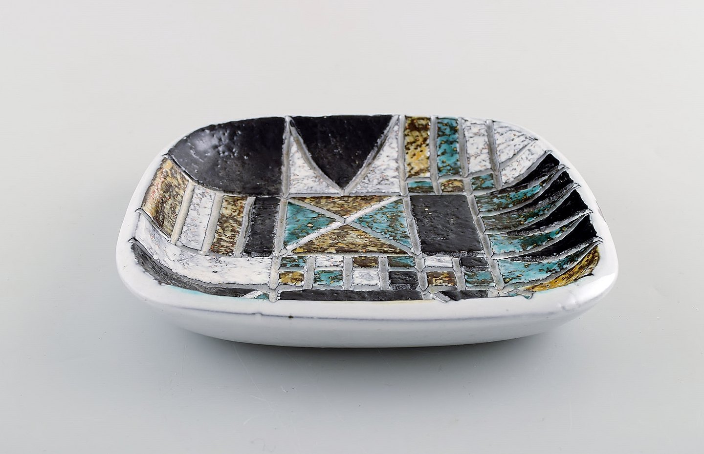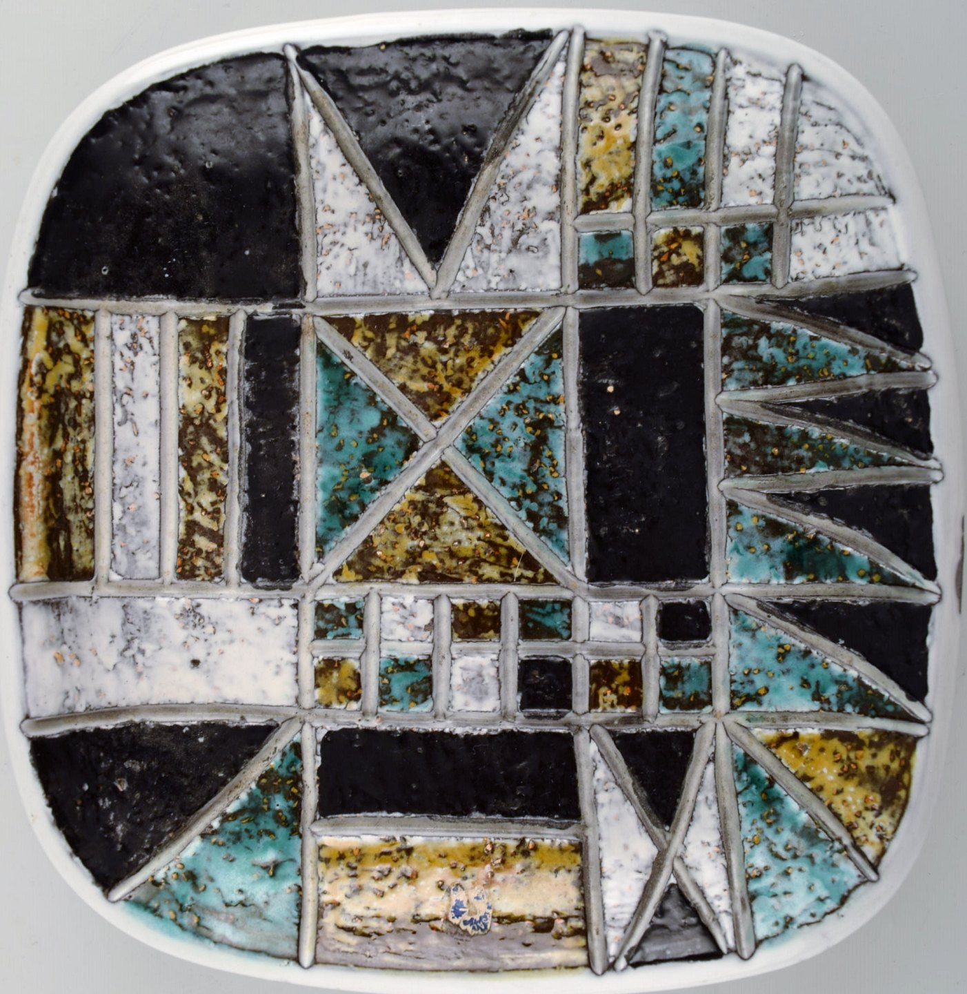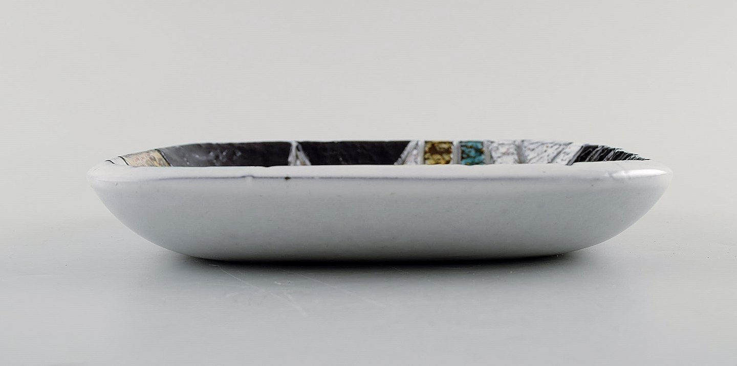 Ingrid Atterberg for Upsala Ekeby. Fad i glaseret stentøj med geometrisk mønster. 1960'erne. I flot stand. Måler: 20,5 x 3 cm. Stemplet.