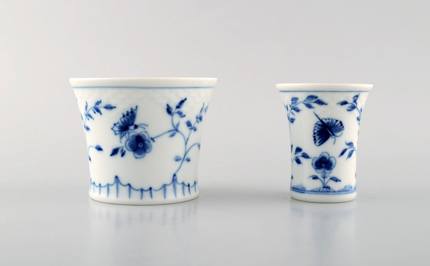 Bing & Grøndahl / B&G, "Sommerfugl". To små vaser, en lysestage og otte små fade i håndmalet porcelæn.
