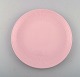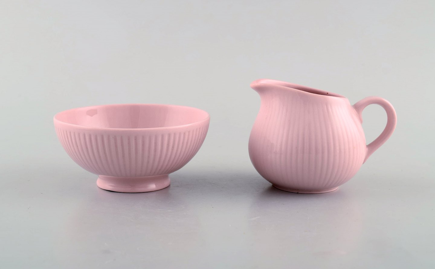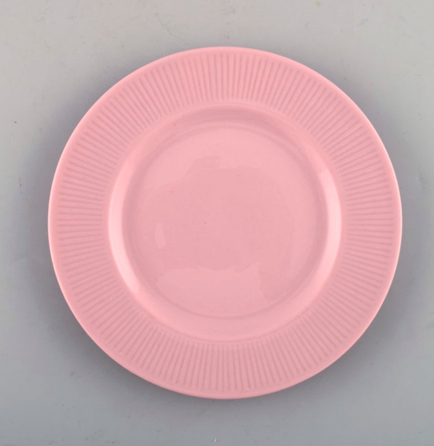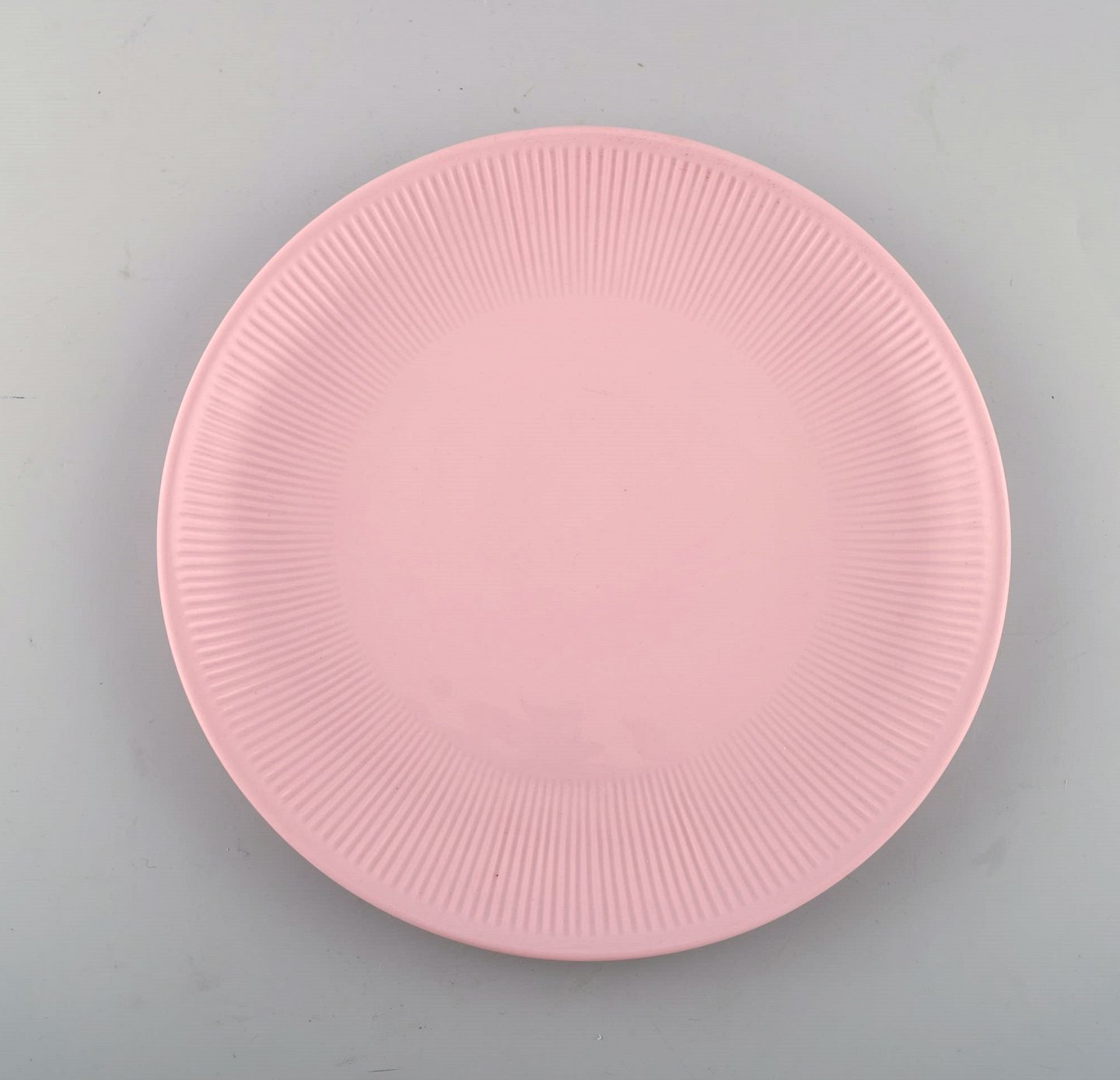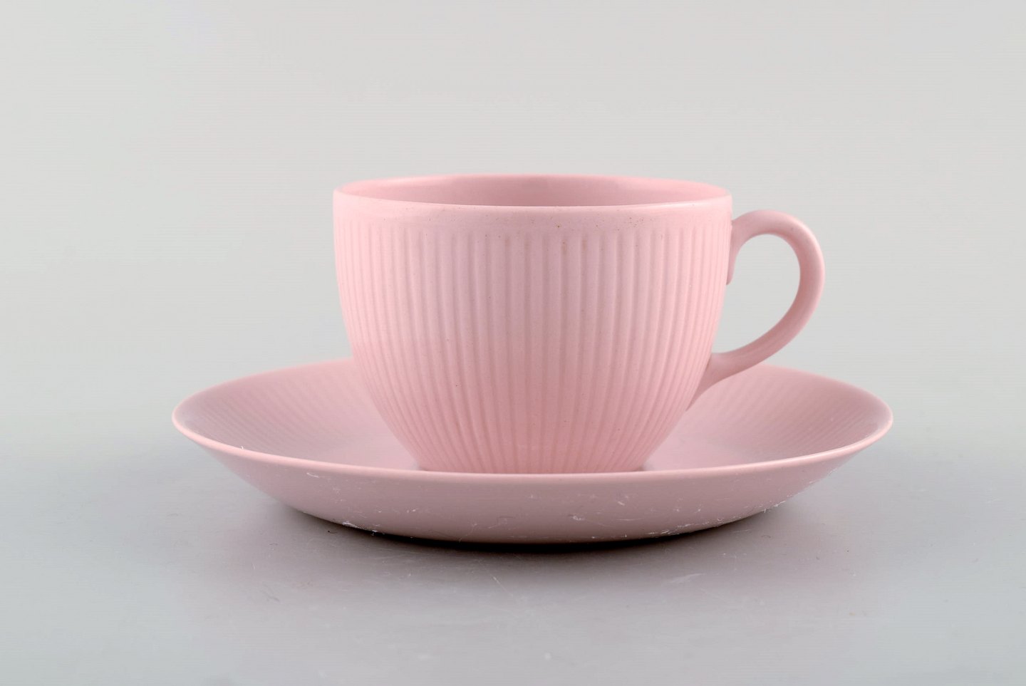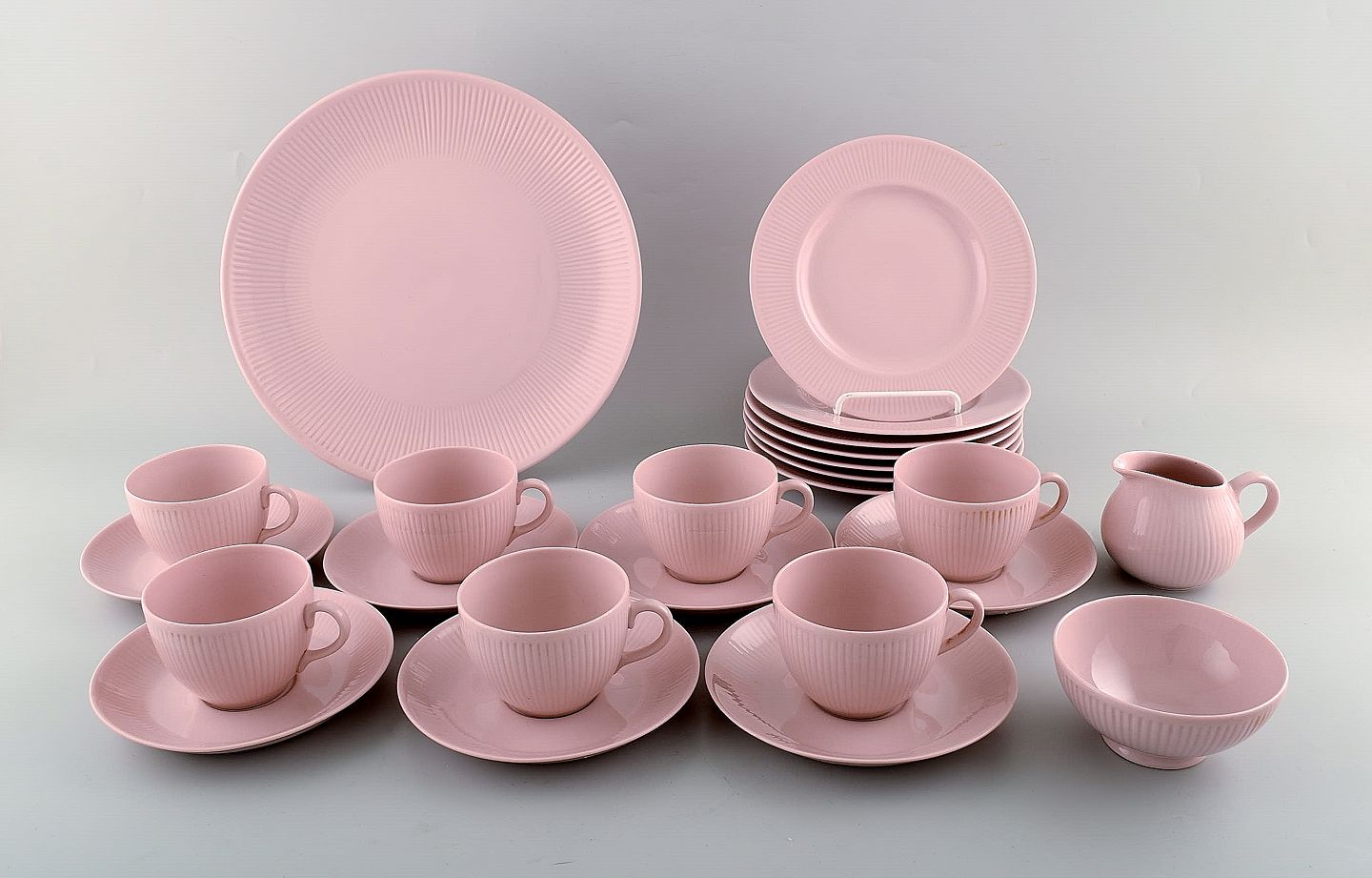 Arabia, Finland. Lyserødt kaffesæt i riflet porcelæn til syv personer. Bestående af syv kaffekopper med underkop, syv tallerkener samt et stort rundt fad. 1960'erne.