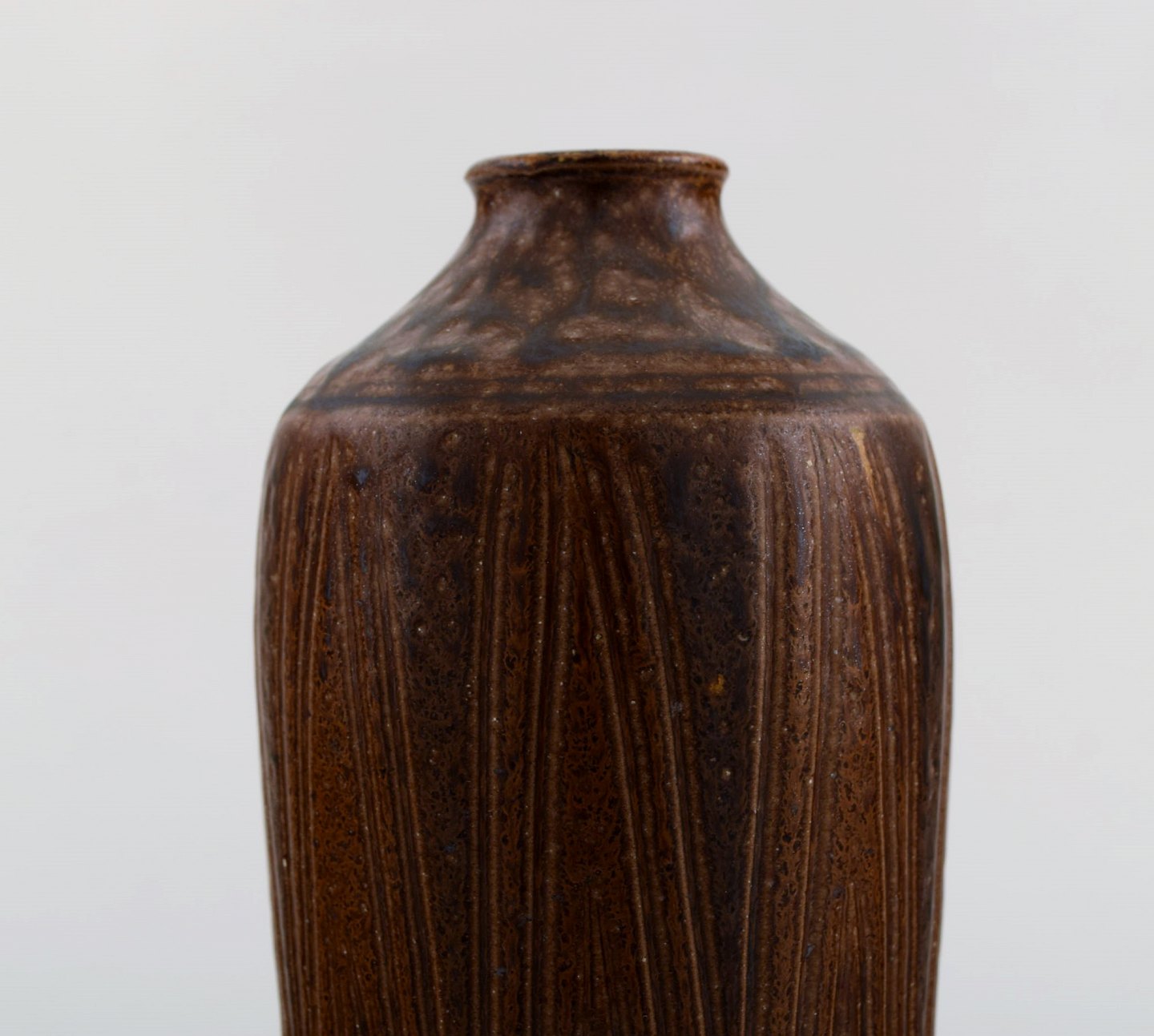 Wallåkra. To vaser i glaseret stentøj. Smuk glasur i brune nuancer. 1950'erne. I flot stand. Største måler: 19,5 x 9 cm. Signeret.