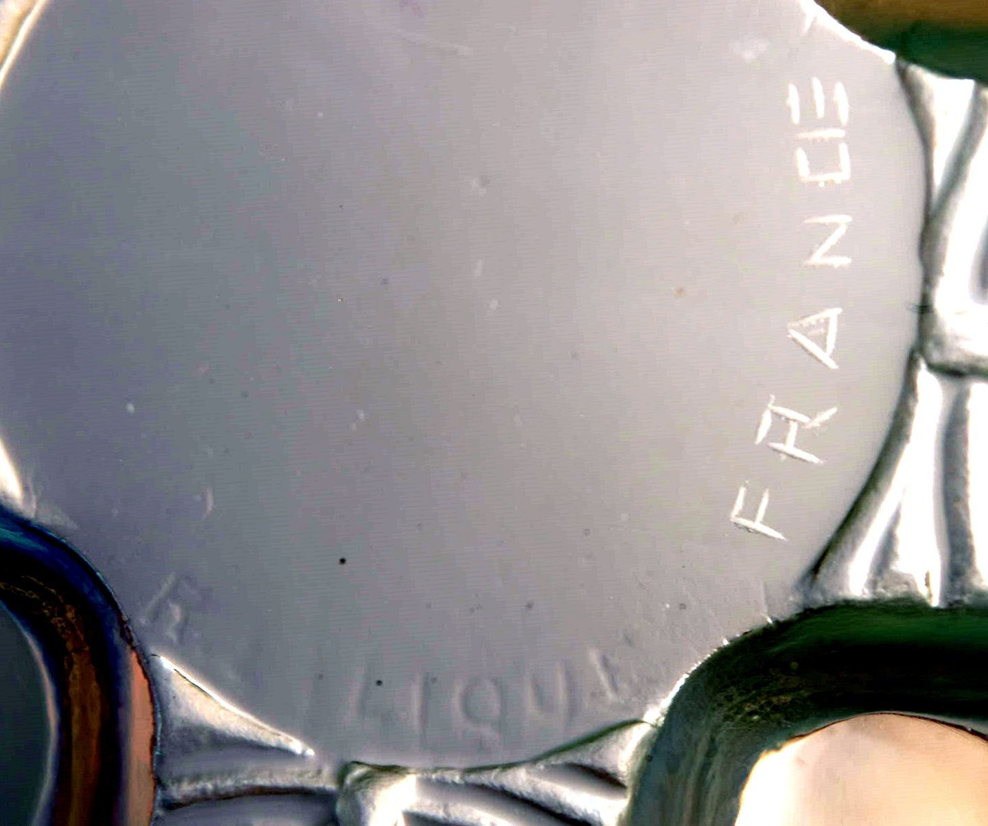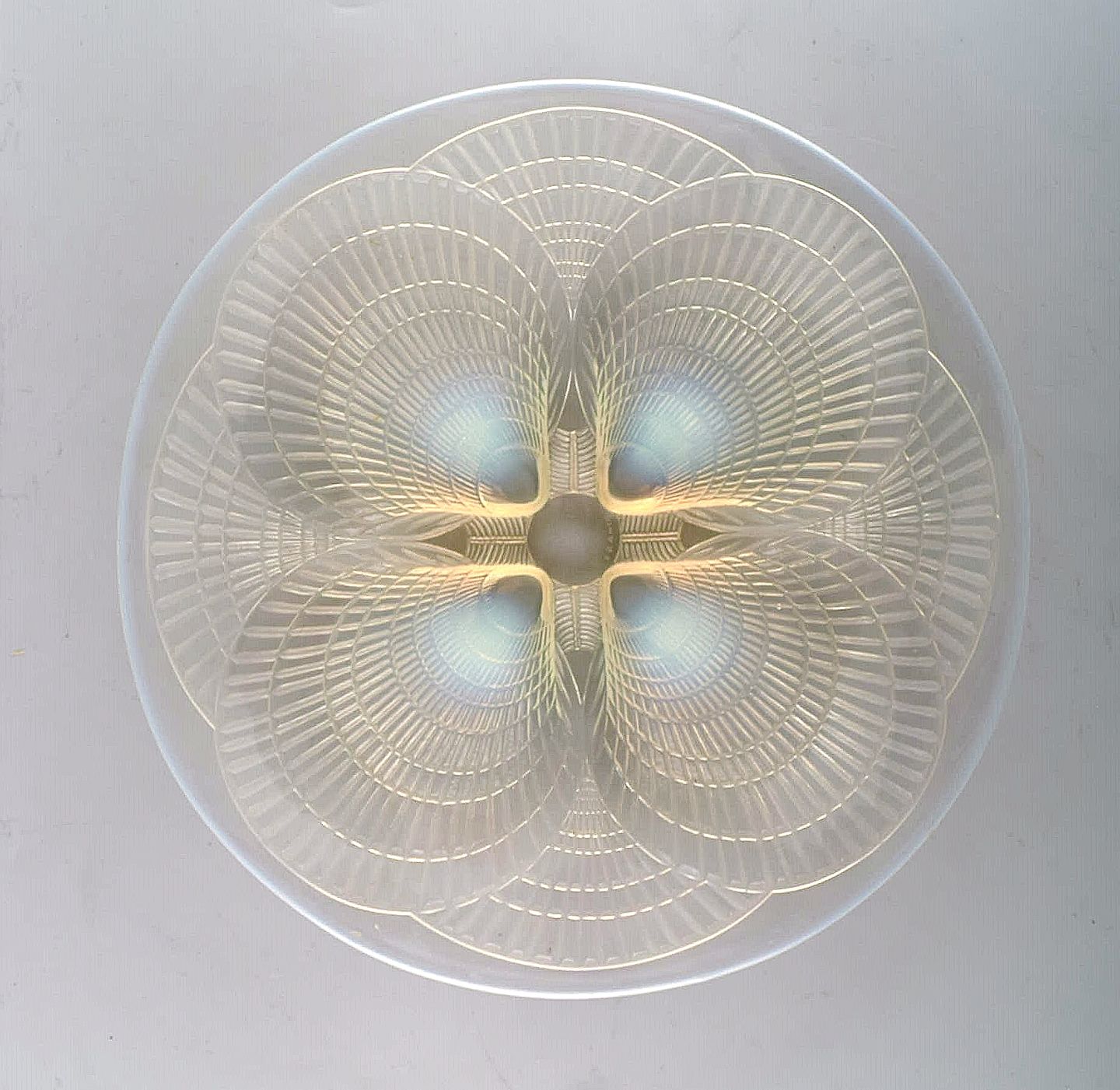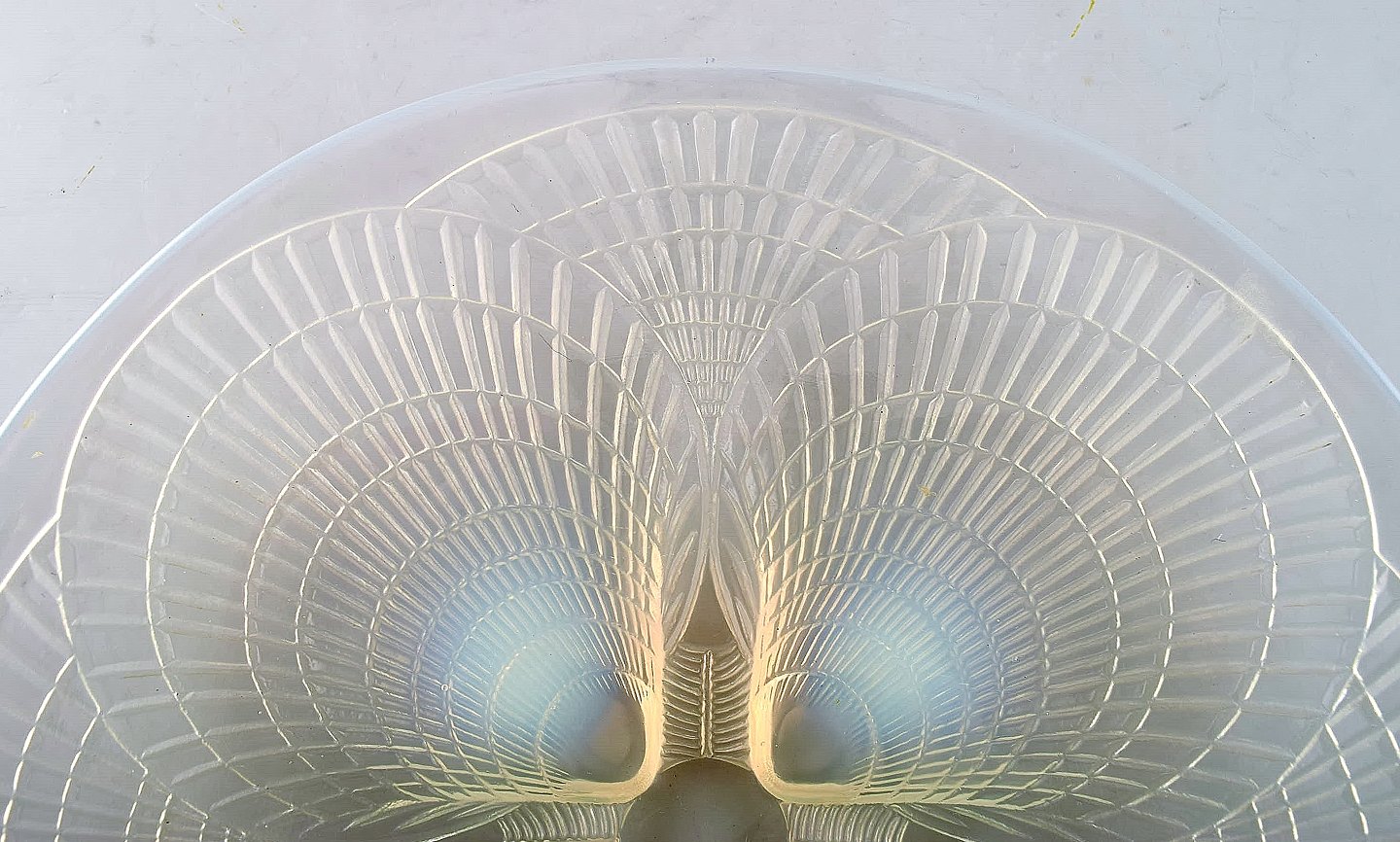 Tidligt René Lalique "Coquilles" fad i kunstglas dekoreret med muslingeskaller. Dateret før 1945. Stemplet: R. Lalique France. I flot stand. Måler: 30 x 4 cm.