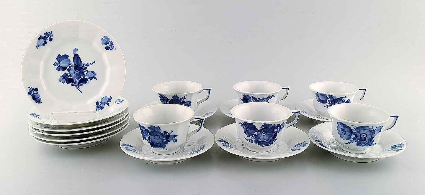 Royal Copenhagen blå blomst kantet sæt på 6 kaffekopper med underkopper samt seks kagetallerkener.