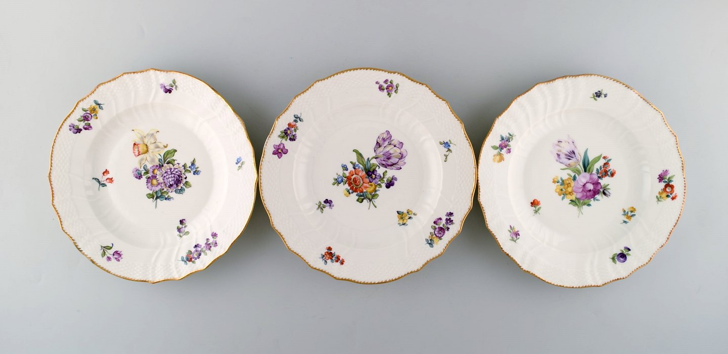 Royal Copenhagen Saksisk Blomst. Tolv middagstallerkener. Dekorationsnummer 4/1621. 1. sortering. Måler: 25,5 cm. I flot stand.