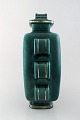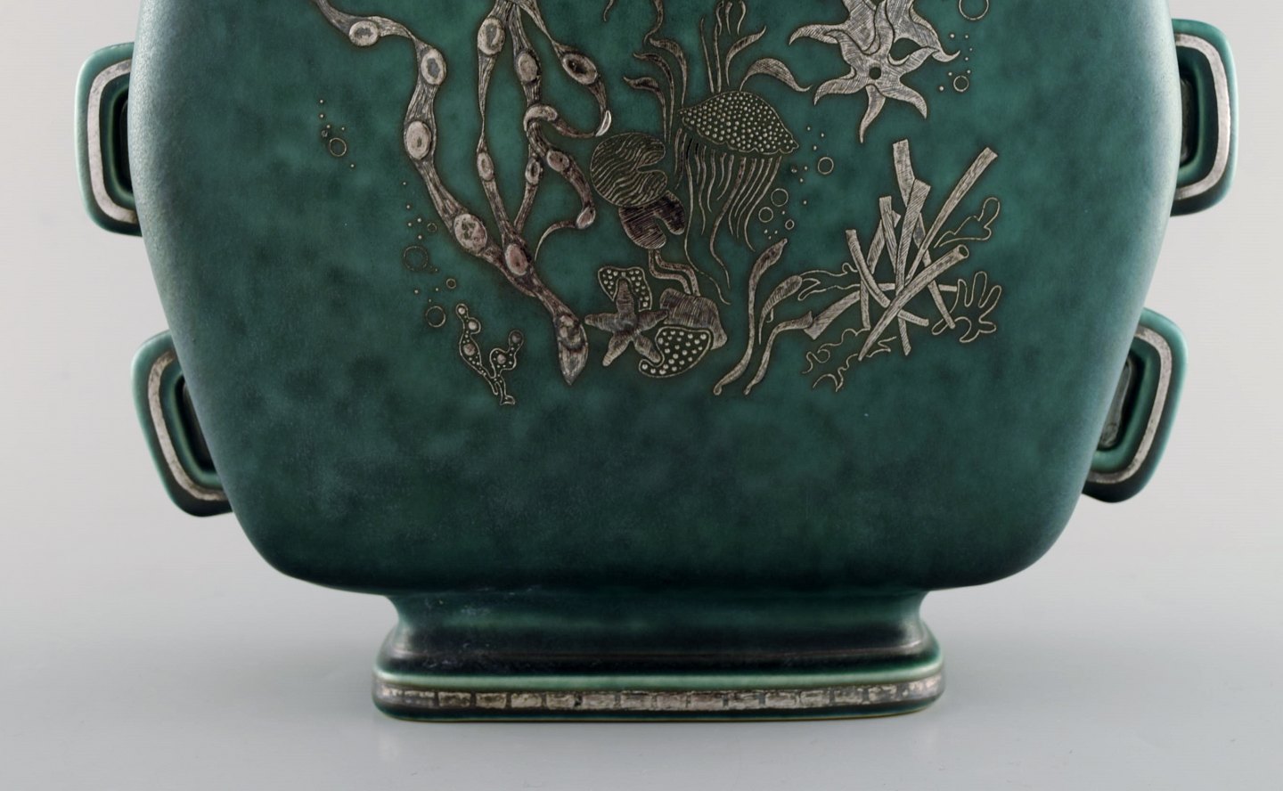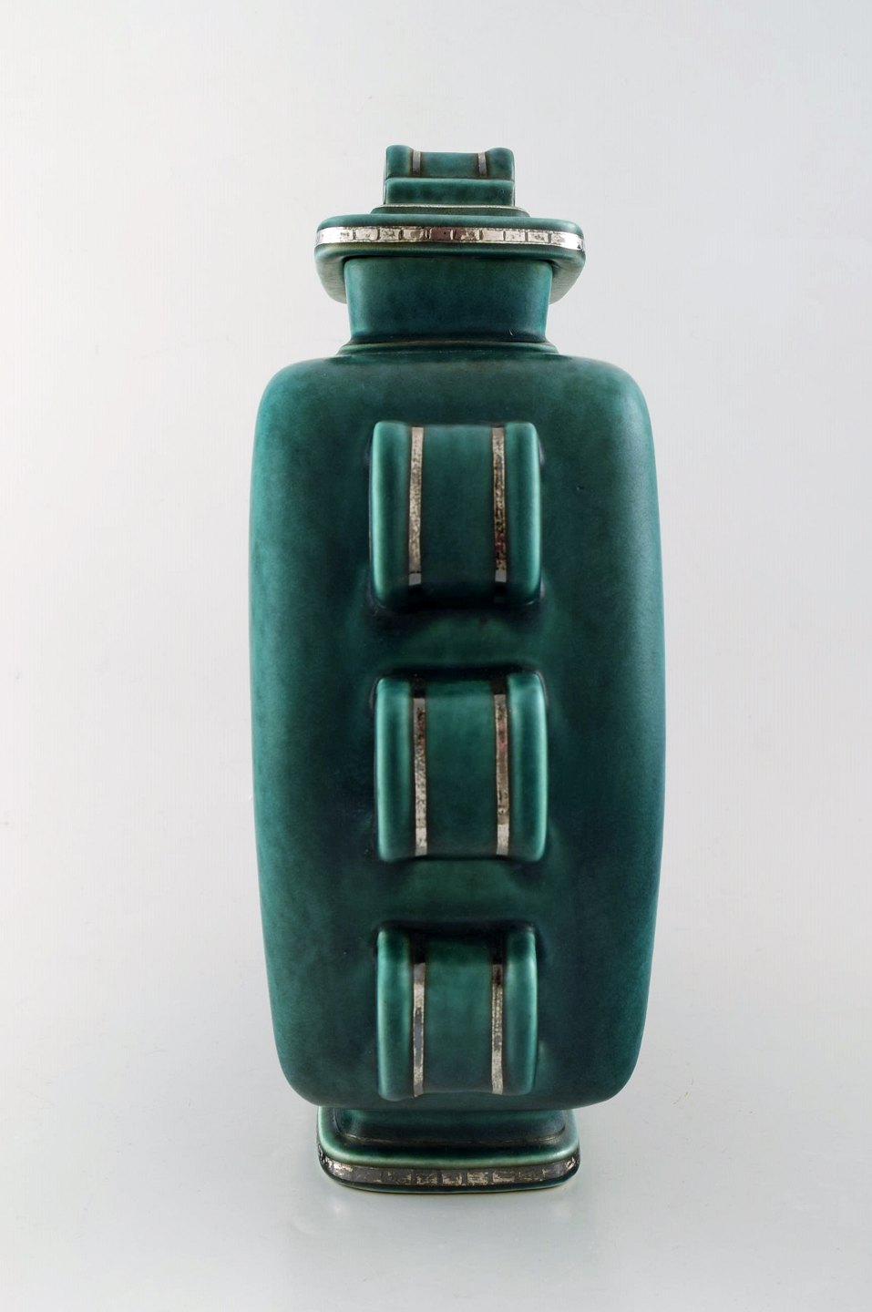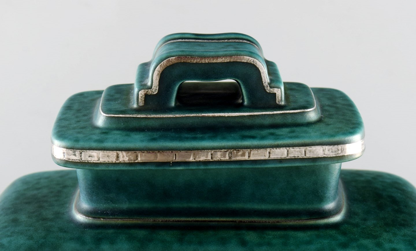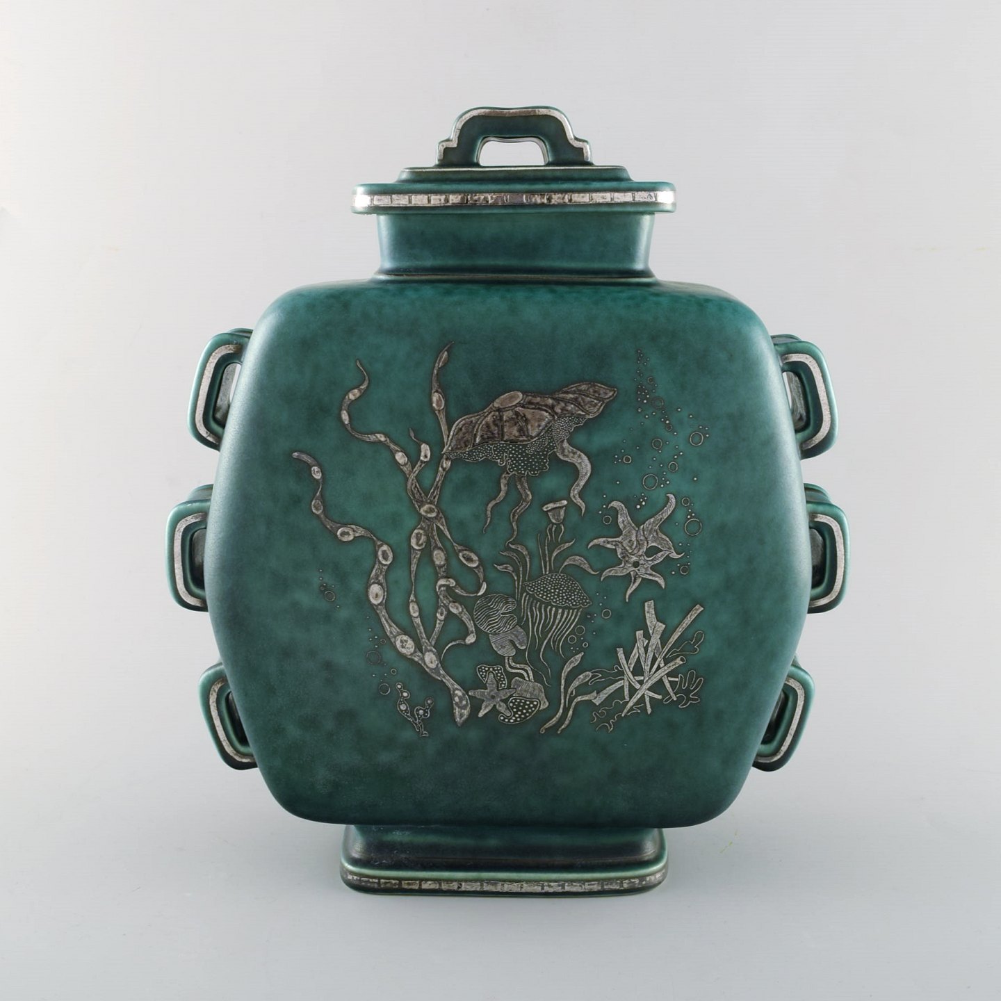 Wilhelm Kåge for Gustavsberg. Stor sjælden argenta art deco lågkrukke i glaseret keramik dekoreret med havfrue og gobler i sølvindlæg.