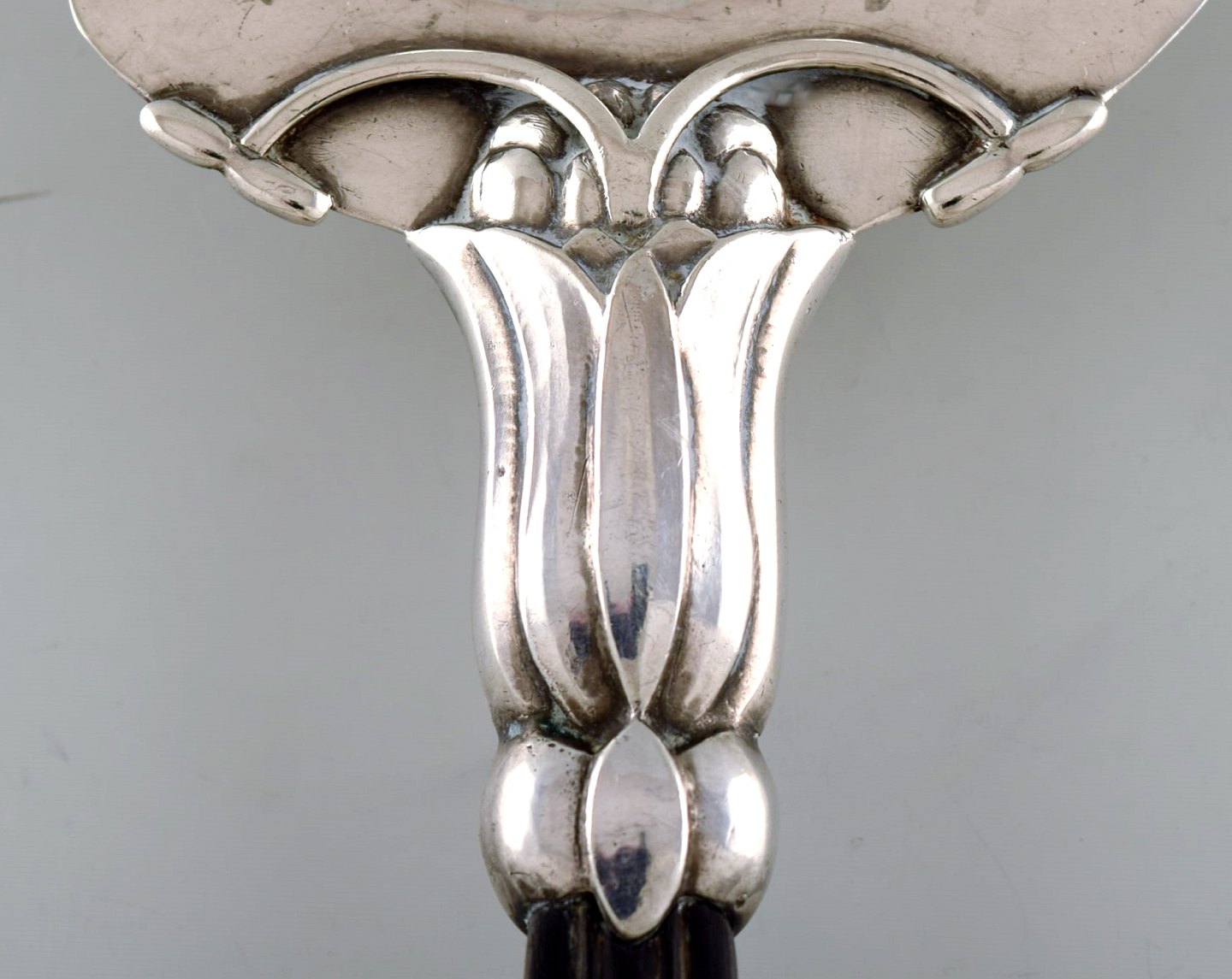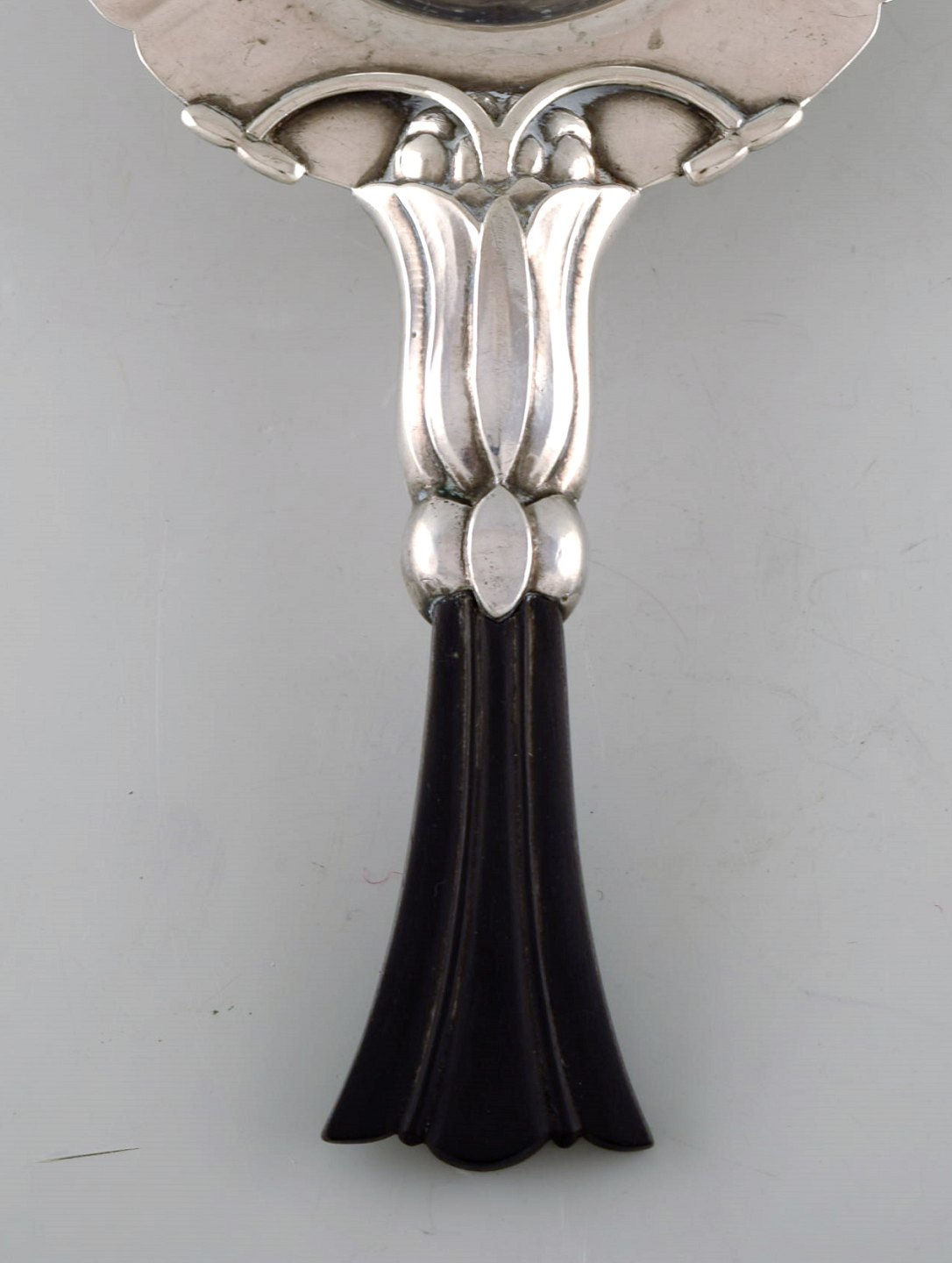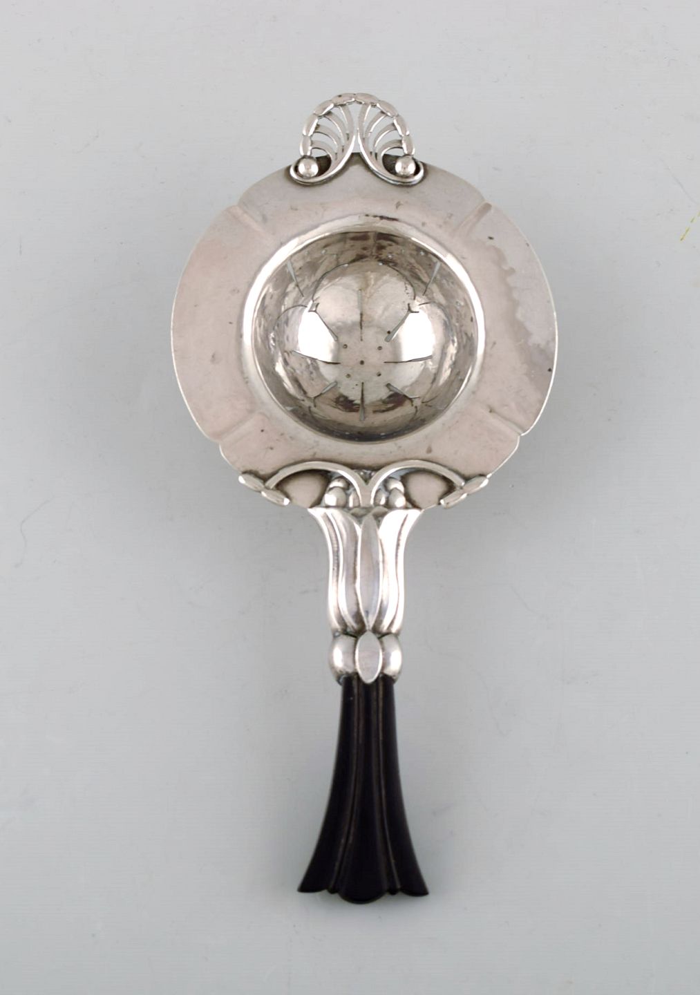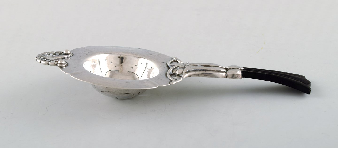 Tidlig og sjælden art nouveau Georg Jensen tesi i sølv med håndtag af ibenholt. Dateret 1915-30. Stemplet. Svenske importstempler. I flot stand. Måler: 18,5 cm.