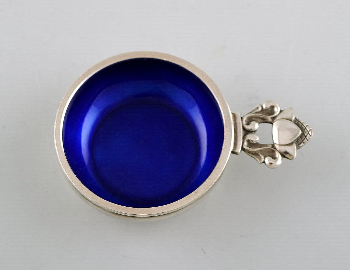 Johan Rohde for Georg Jensen. "Konge" saltkar i sterlingsølv med kongeblå emalje og tilhørende ske. Design 62. I flot stand. Stemplet. Saltkaret måler: 6 x 4 cm. Skeen måler: 6 cm.
