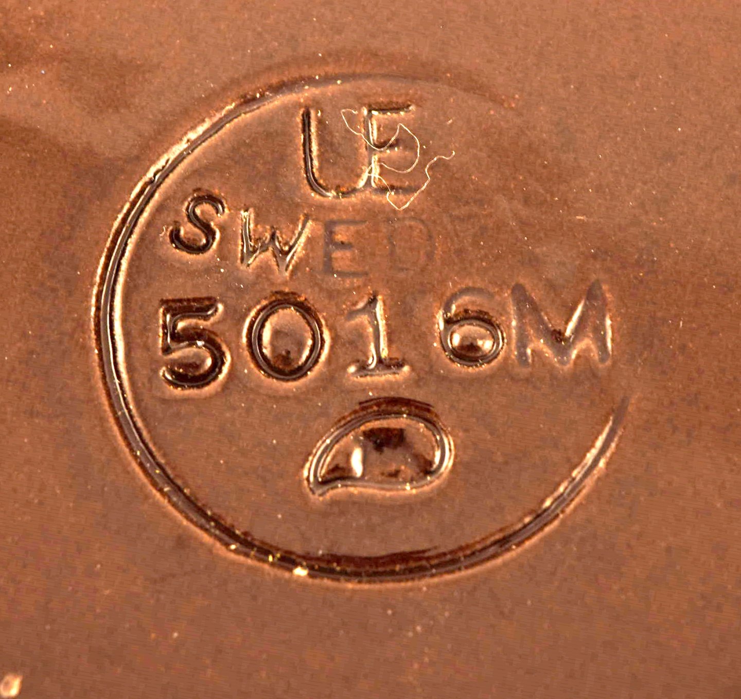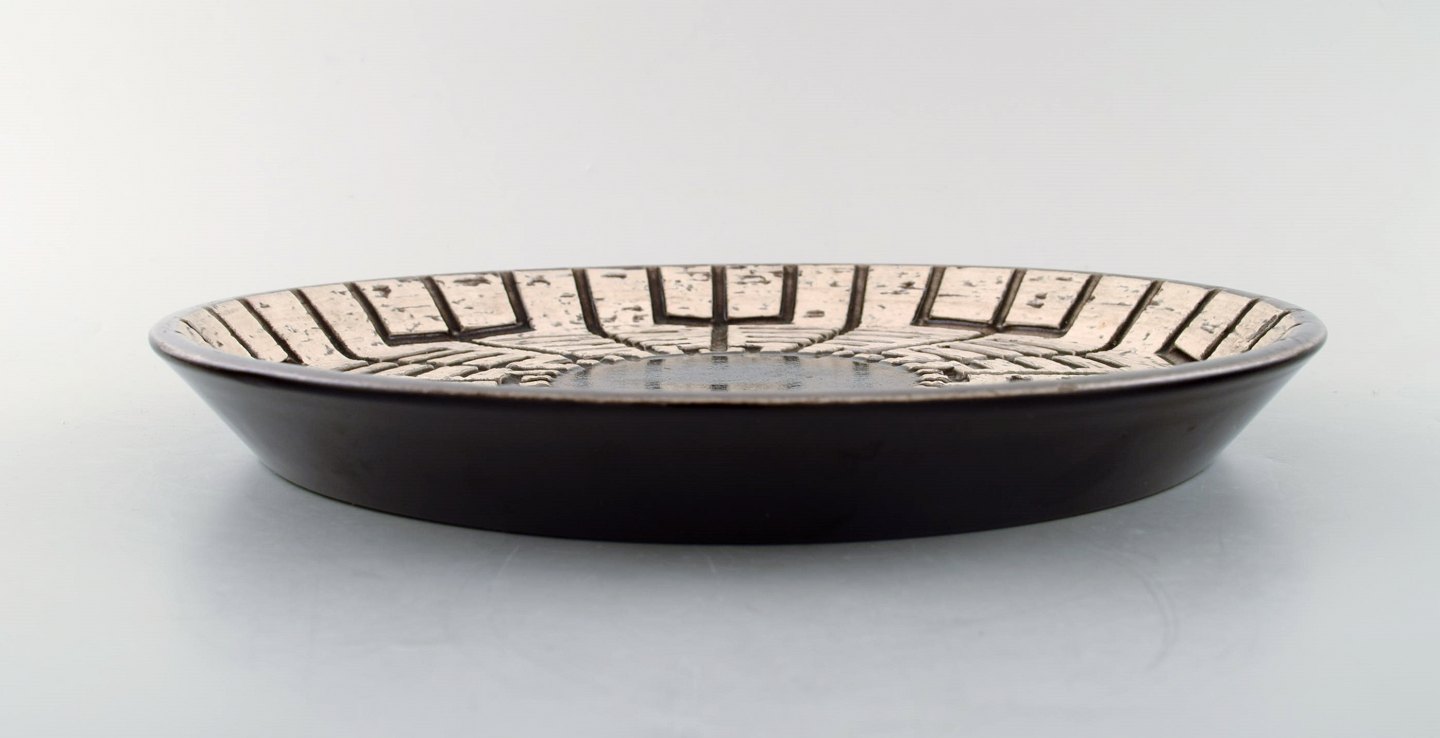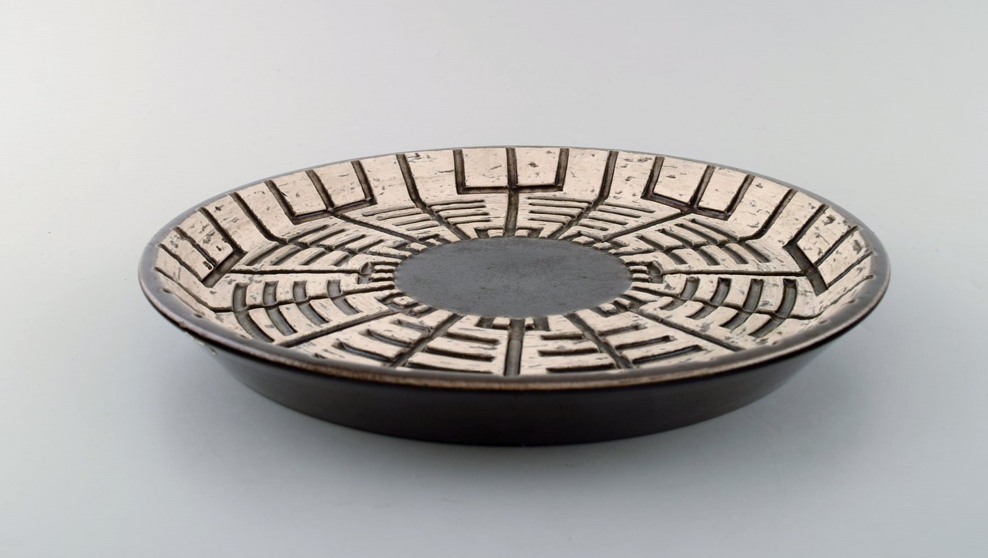 Mari Simmulson for Upsala-Ekeby. Fad i glaseret stentøj med geometrisk mønster. 1960'erne. I flot stand. Måler: 30 x 4 cm Stemplet.