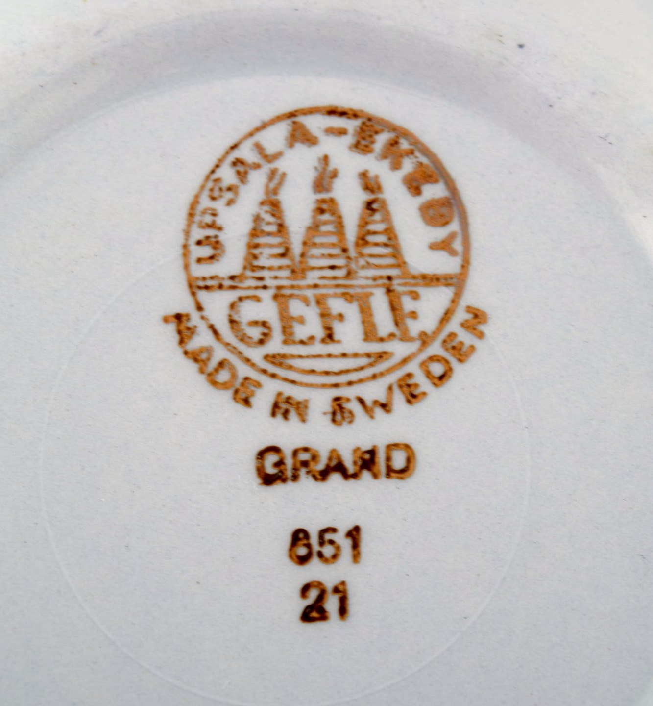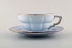 Arthur Percy for Upsala-Ekeby / Gefle. Sæt på fire art deco "Grand" tekopper med underkop, tekande, sukker/fløde sæt og fire tallerkener i pastelblå porcelæn med håndmalet guldkant. 1930/40'erne.