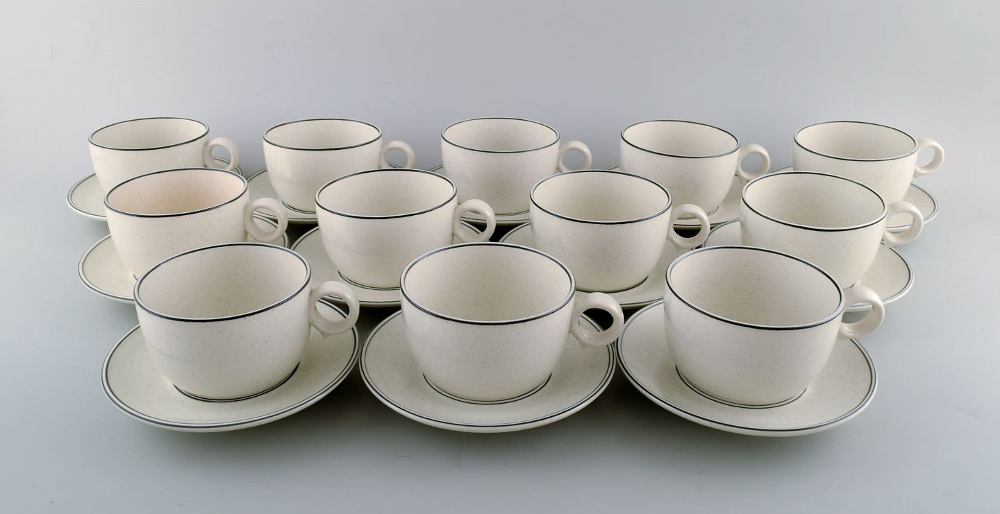 Stig Lindberg for Gustavsberg. Sæt på tolv "Birka" tekopper med underkop i glaseret stentøj. 1960'erne. I flot stand. Koppen måler: 10 x 7 cm. Underkoppen måler: 15 cm. Stemplet.