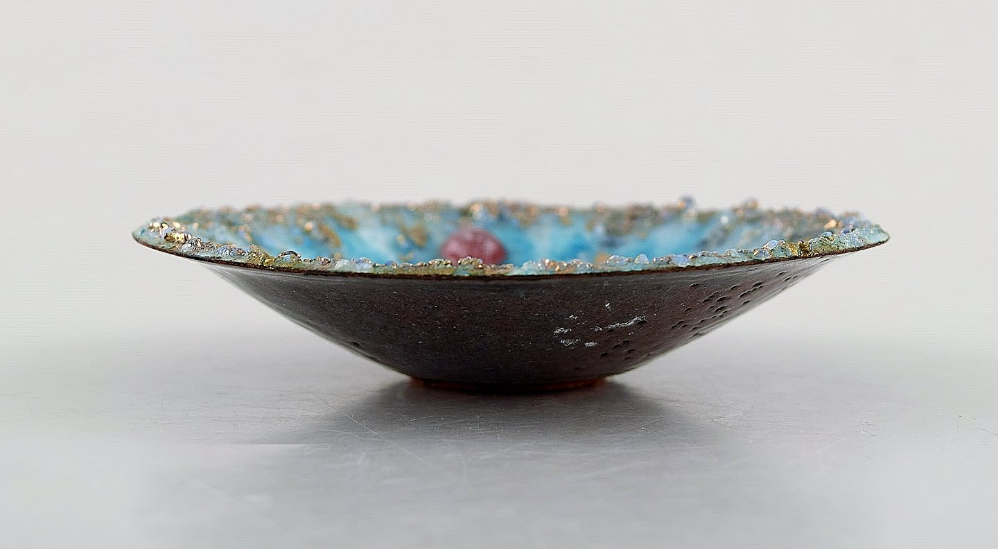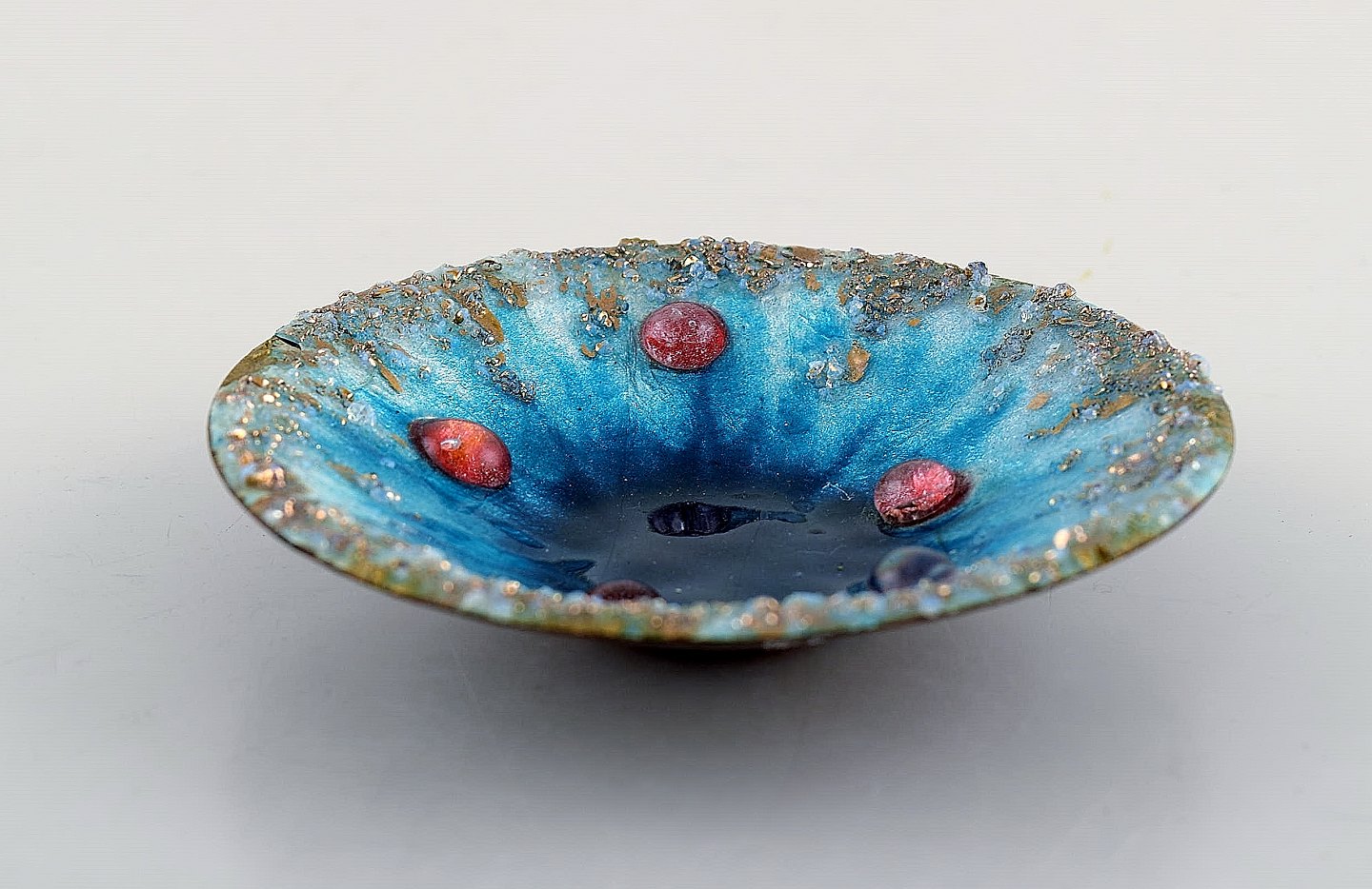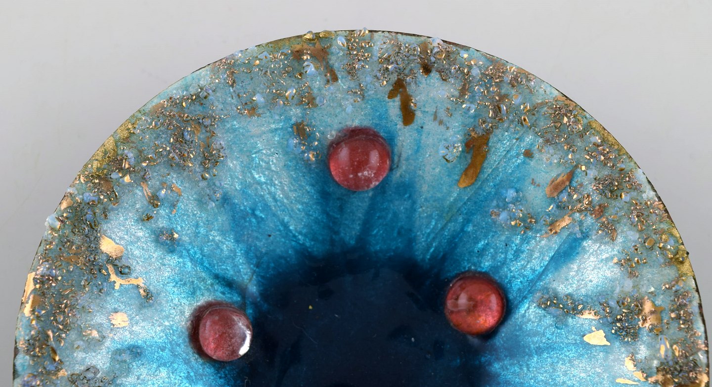 Camille Fauré for Limoges, Frankrig. Art nouveau bronzeskål i emaljearbejde. Røde kunstglas-sten indlagt på blå baggrund. Ca. 1910.