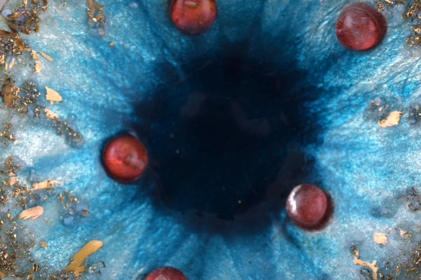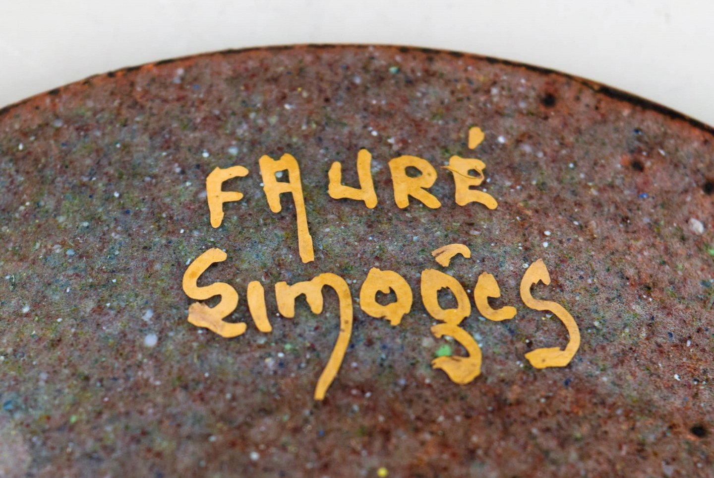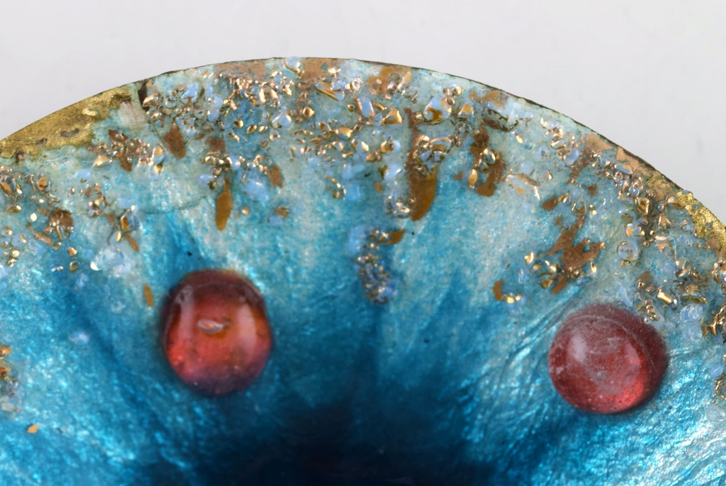 Camille Fauré for Limoges, Frankrig. Art nouveau bronzeskål i emaljearbejde. Røde kunstglas-sten indlagt på blå baggrund. Ca. 1910.