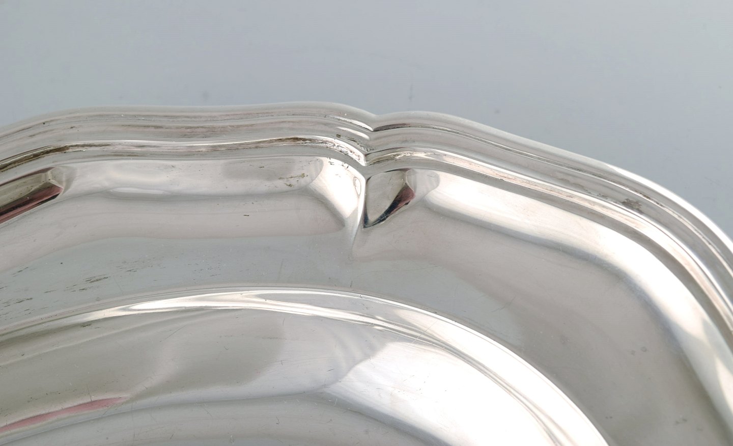 Dansk sølvsmed. Stort serveringsfad i 3-tårnet sølv. Dateret 1936. Måler: 50 x 33 x 4 cm. I flot stand. Stemplet.