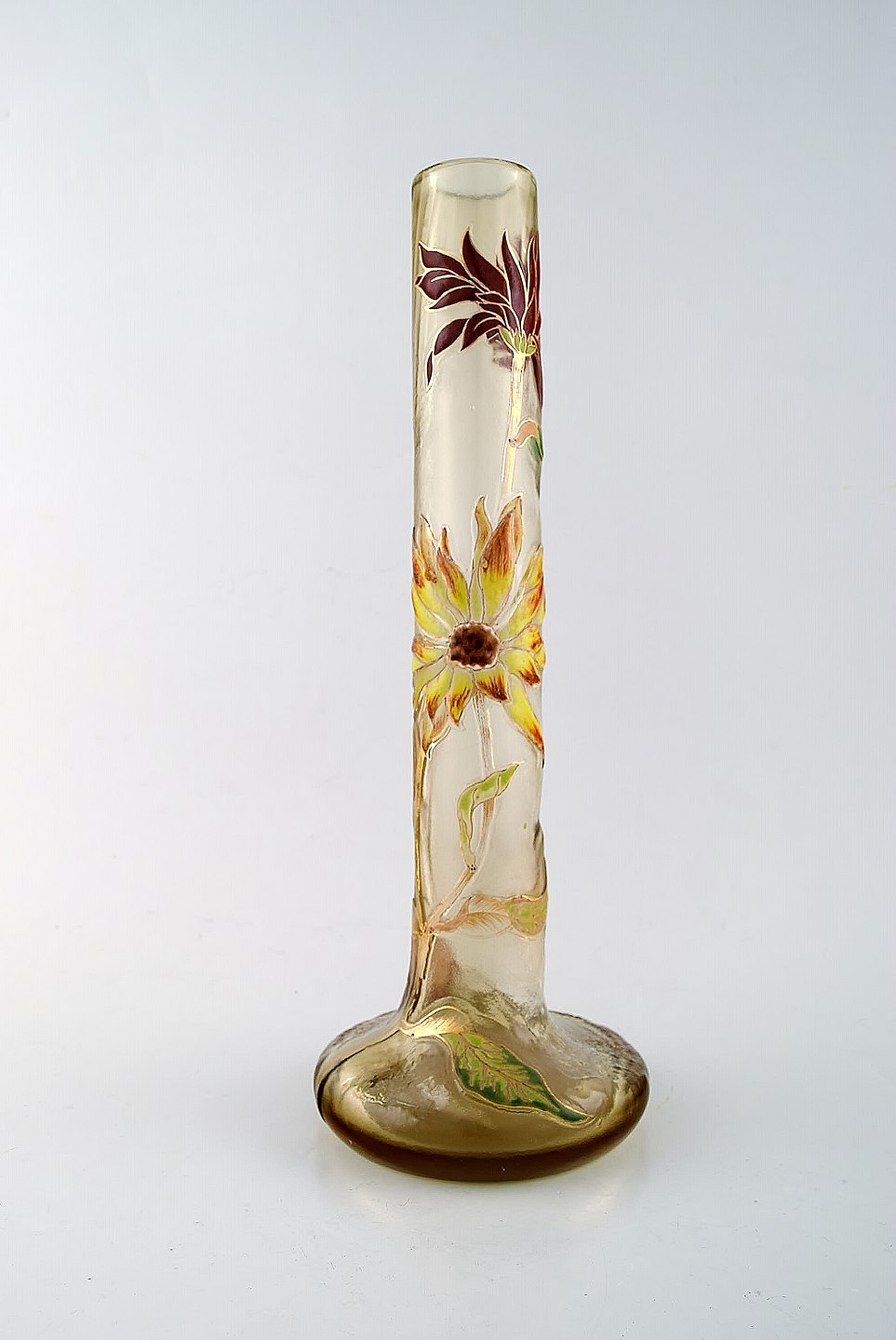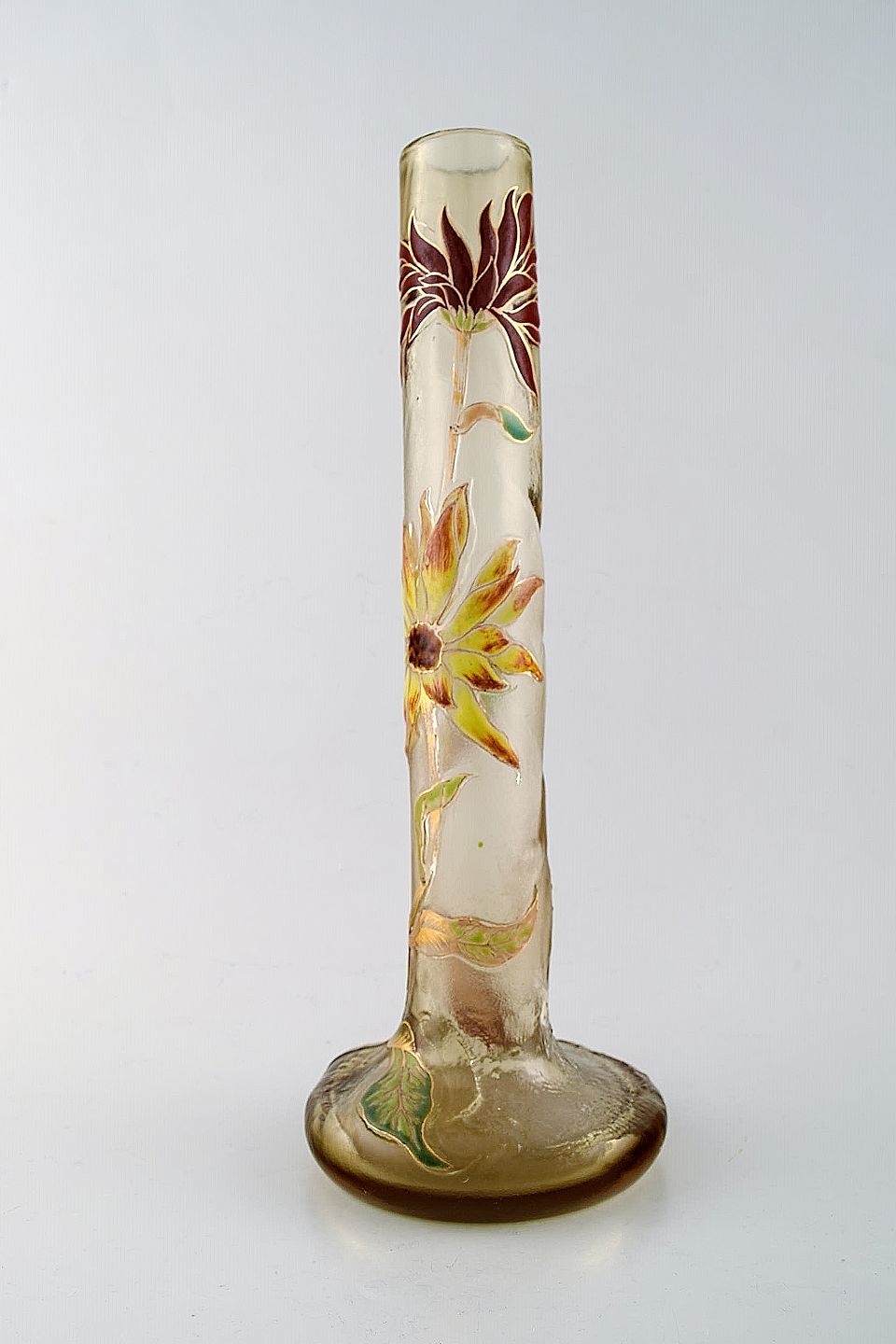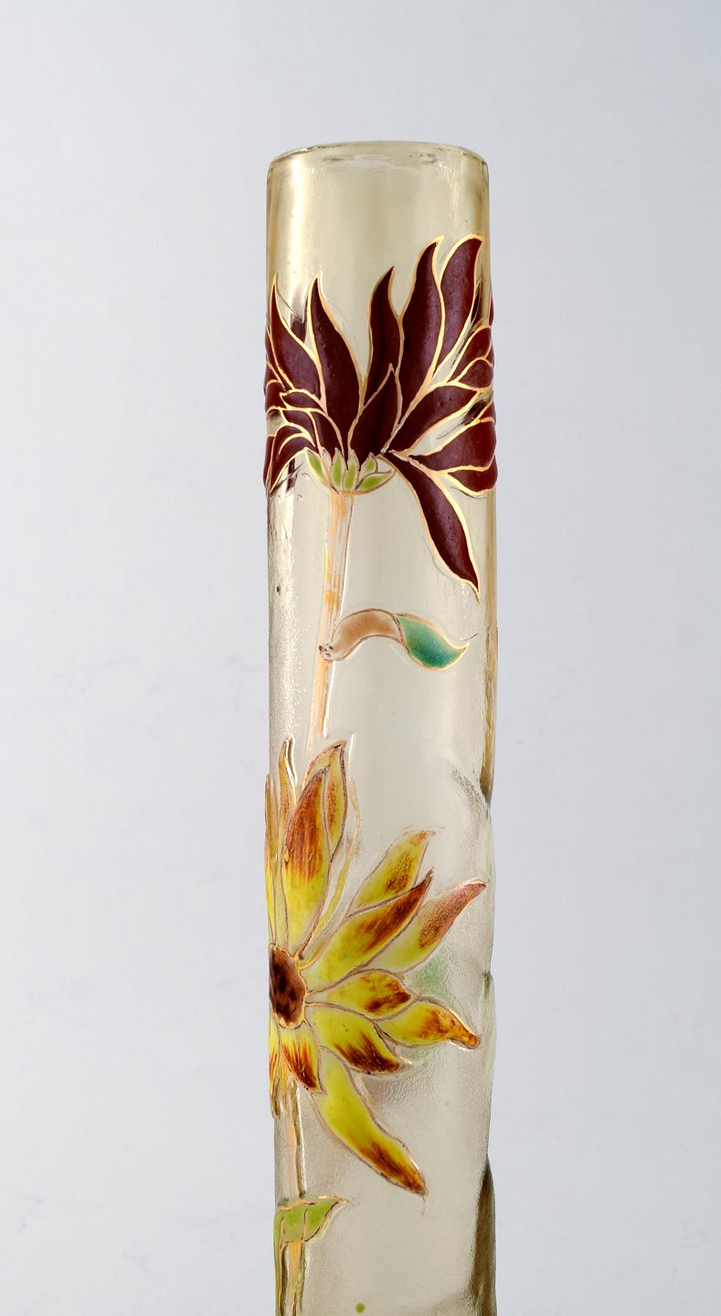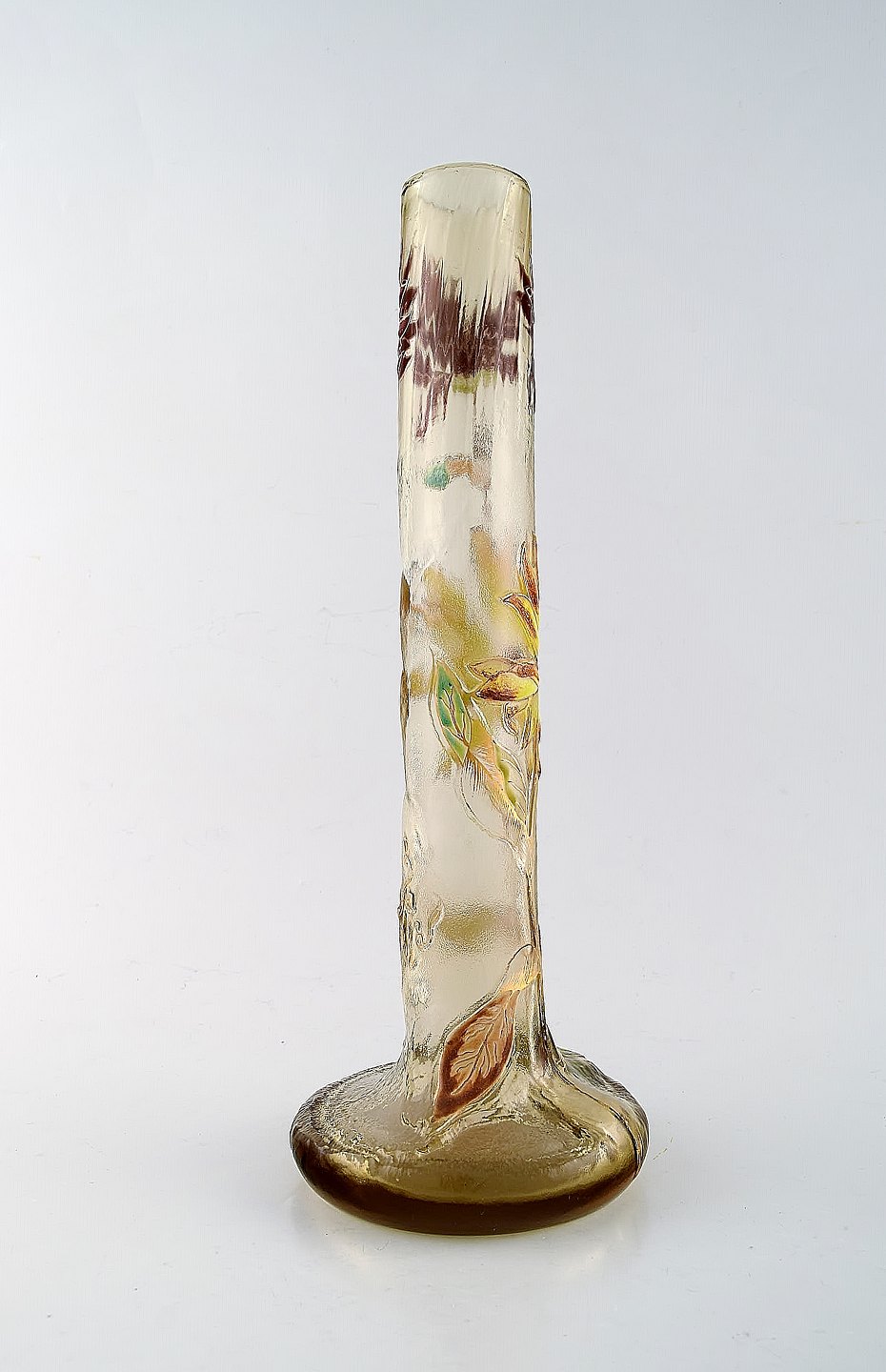 Tidlig Emile Gallé japanisme vase i klart matteret kunstglas. Overfang udskåret med motiver i form af blomster og blade gult og rødt kunstglas. 1890'erne.