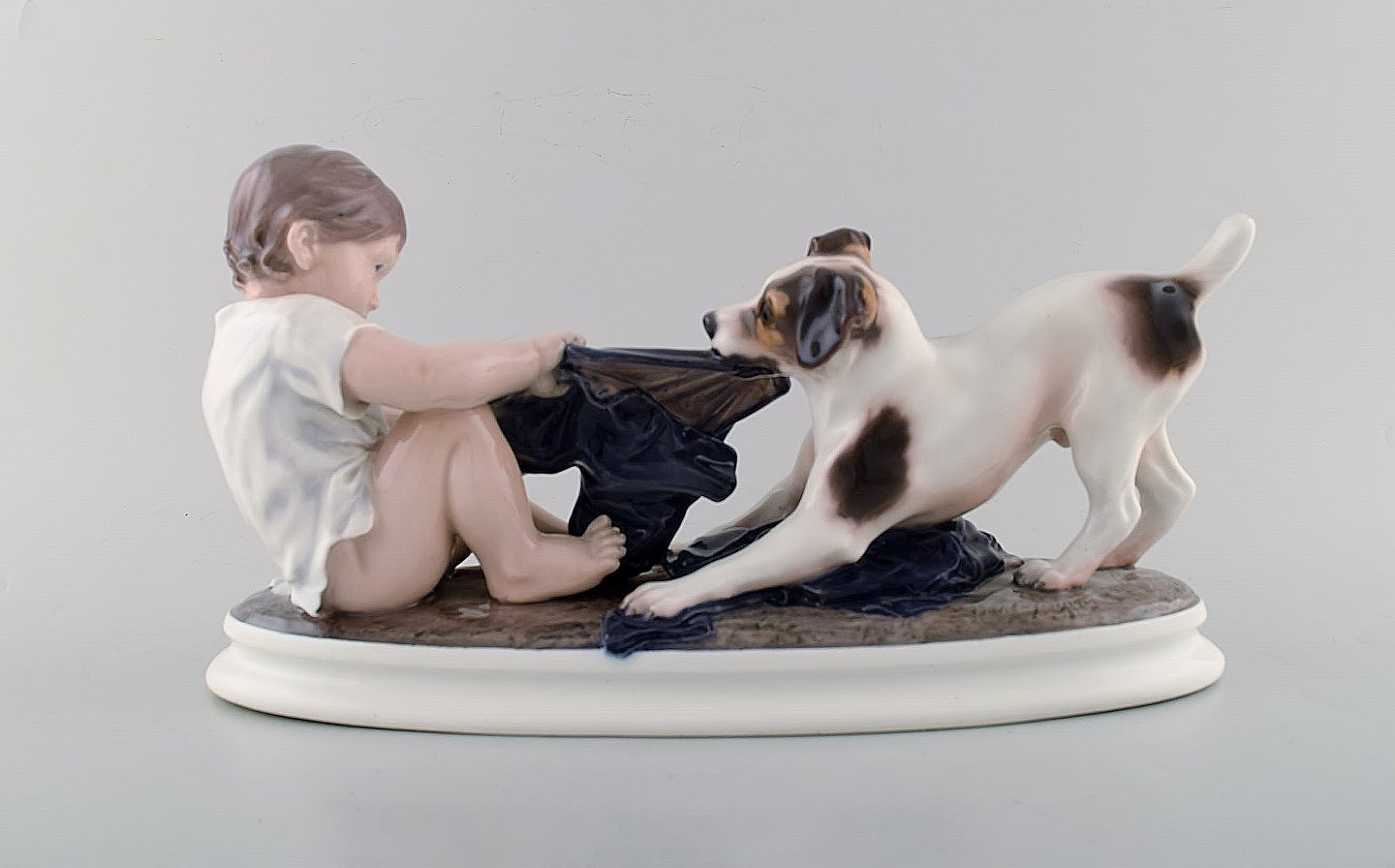 Stor Dahl Jensen porcelænsfigur. Dreng og hund. Modelnummer 1072. 2. Sortering. 1930'erne. I flot stand. Måler: 32 x 18 cm. Signeret: Kongekrone , DJ Copenhagen.