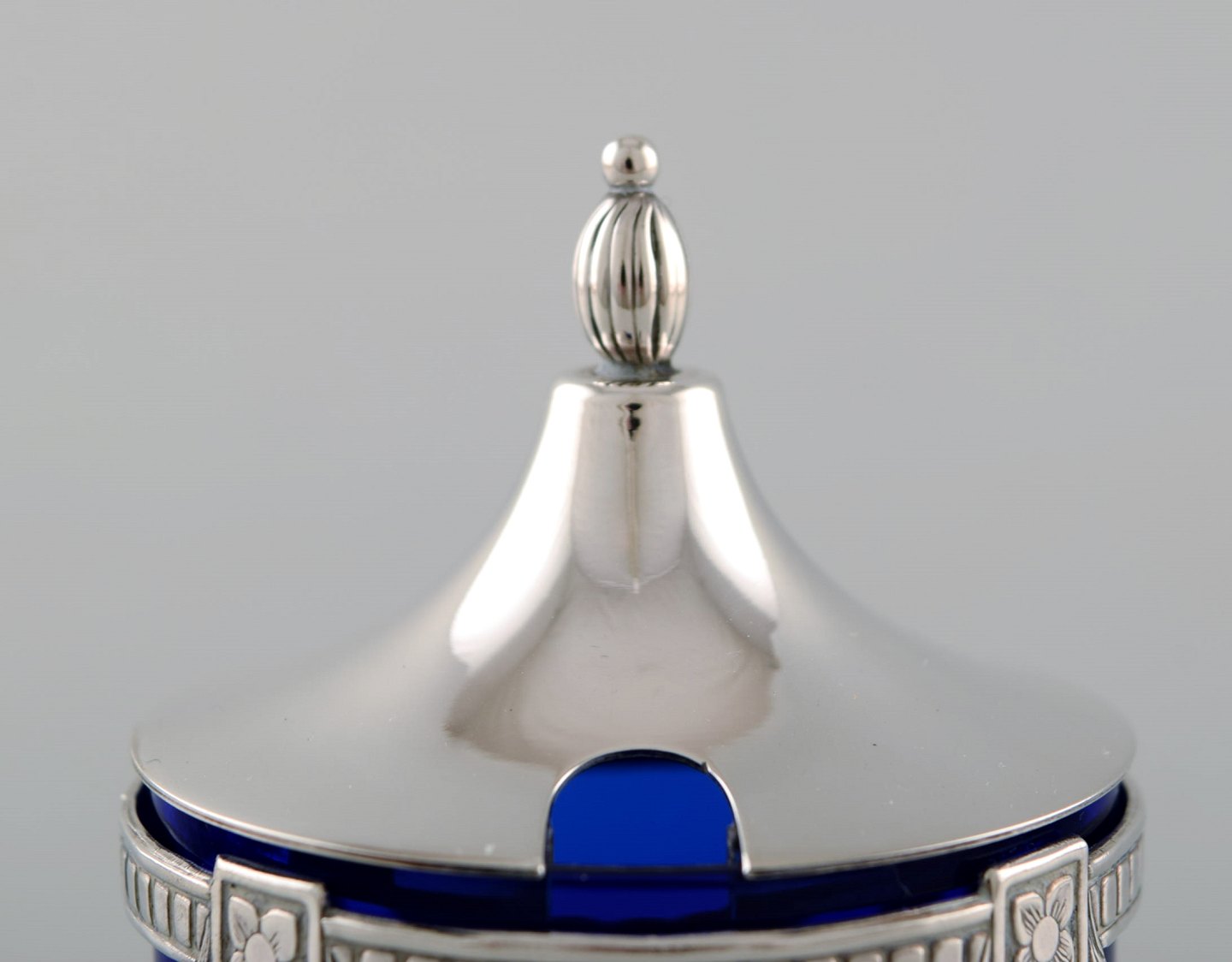 Svensk sølvsmed. To sukkerskåle i sølv. Empire stil med kongeblåt glasindlæg. I flot stand. Stemplet. Måler: 9,3 x 5 cm.