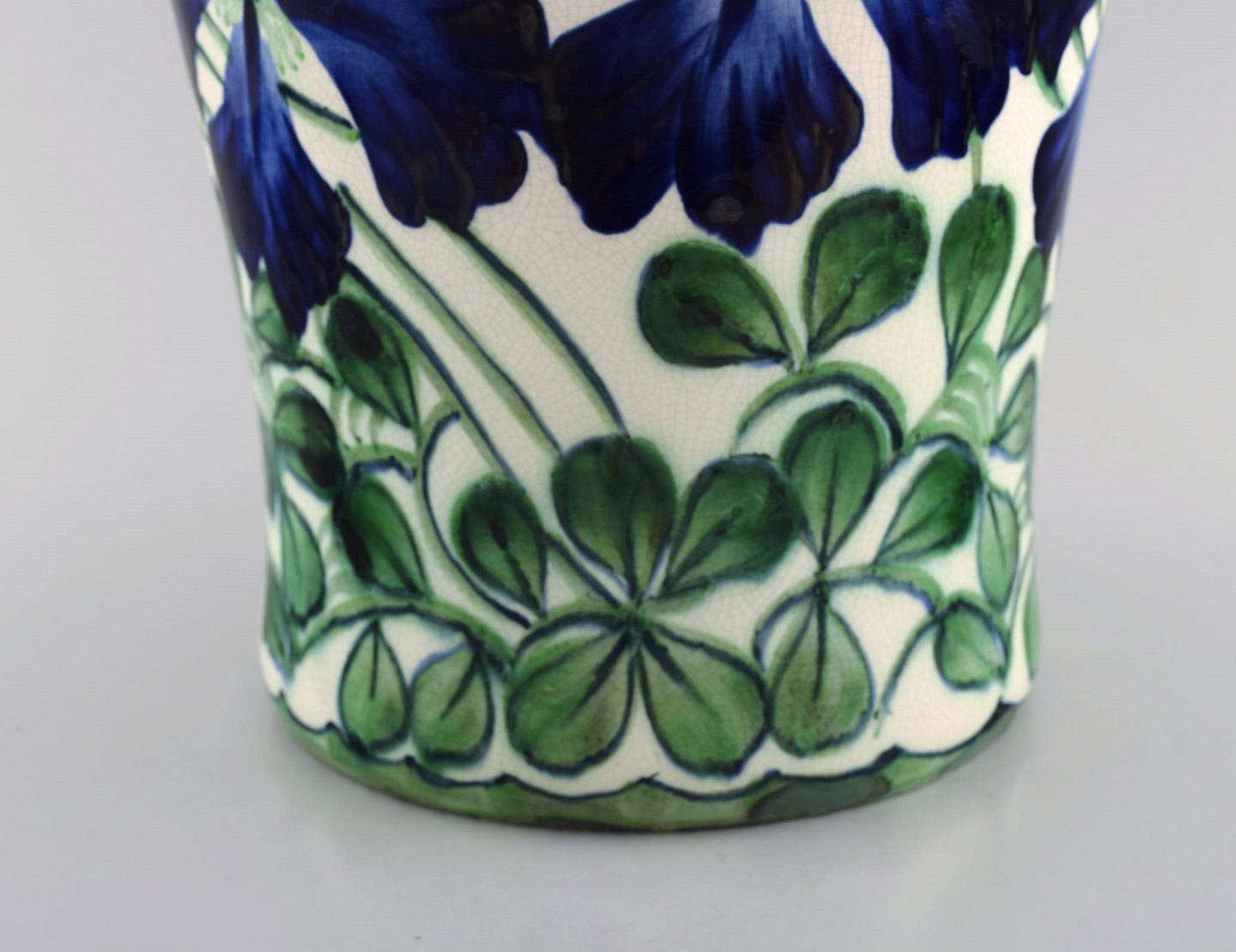 Tidlig kolossal Aluminiavase i fajance. Blå blomster og grønne blade på cremefarvet baggrund. Tidligt 1900-tallet. Måler: 55 x 29 cm. Stemplet. I flot stand.