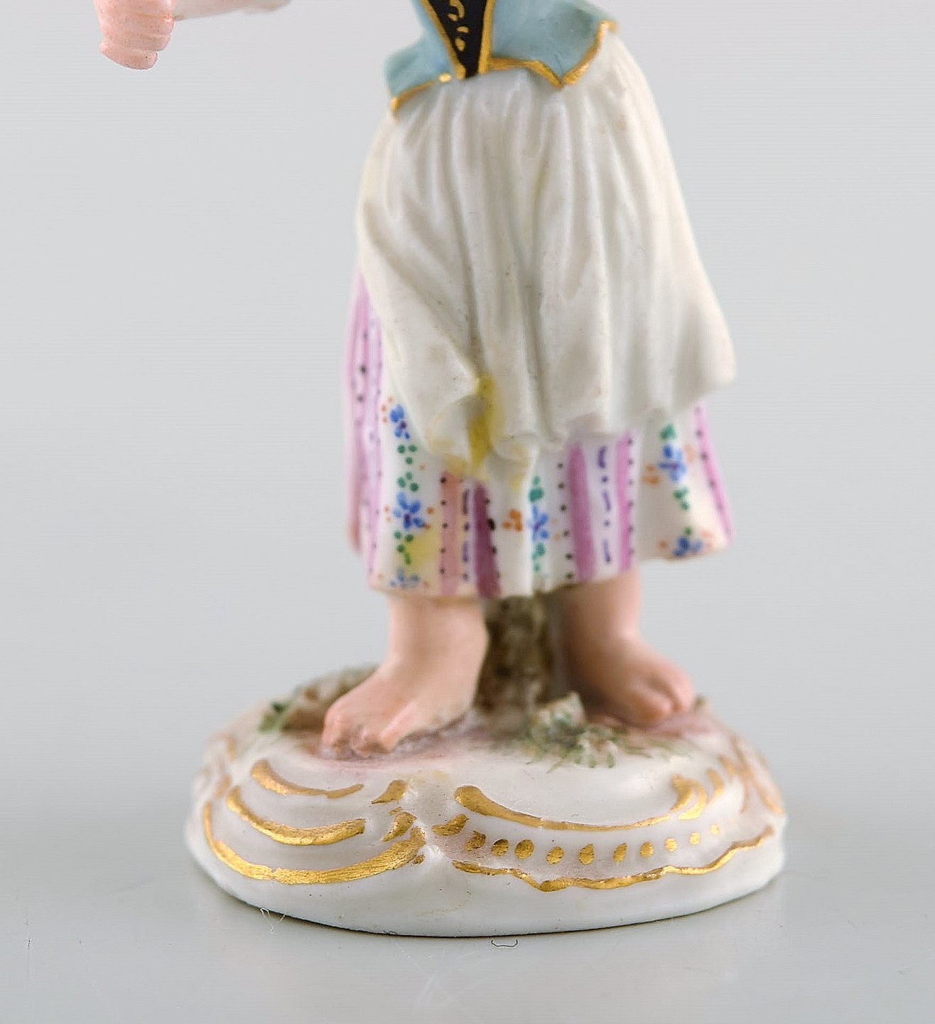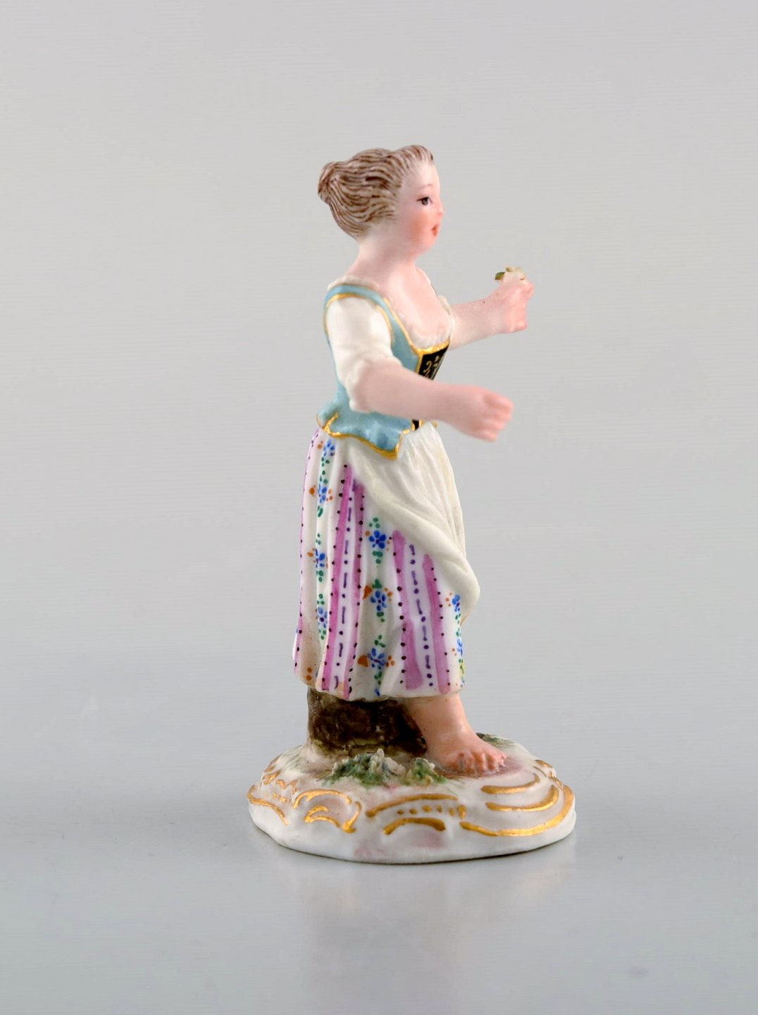 Rare antique Meissen miniature figure after Johann Joachim Kändler in hand-painted porcelain. Girl with flowers. Dated 1850-80. Model Number 2869. Measures: 6.2 x 3.5 cm. In very good condition. Stamped.