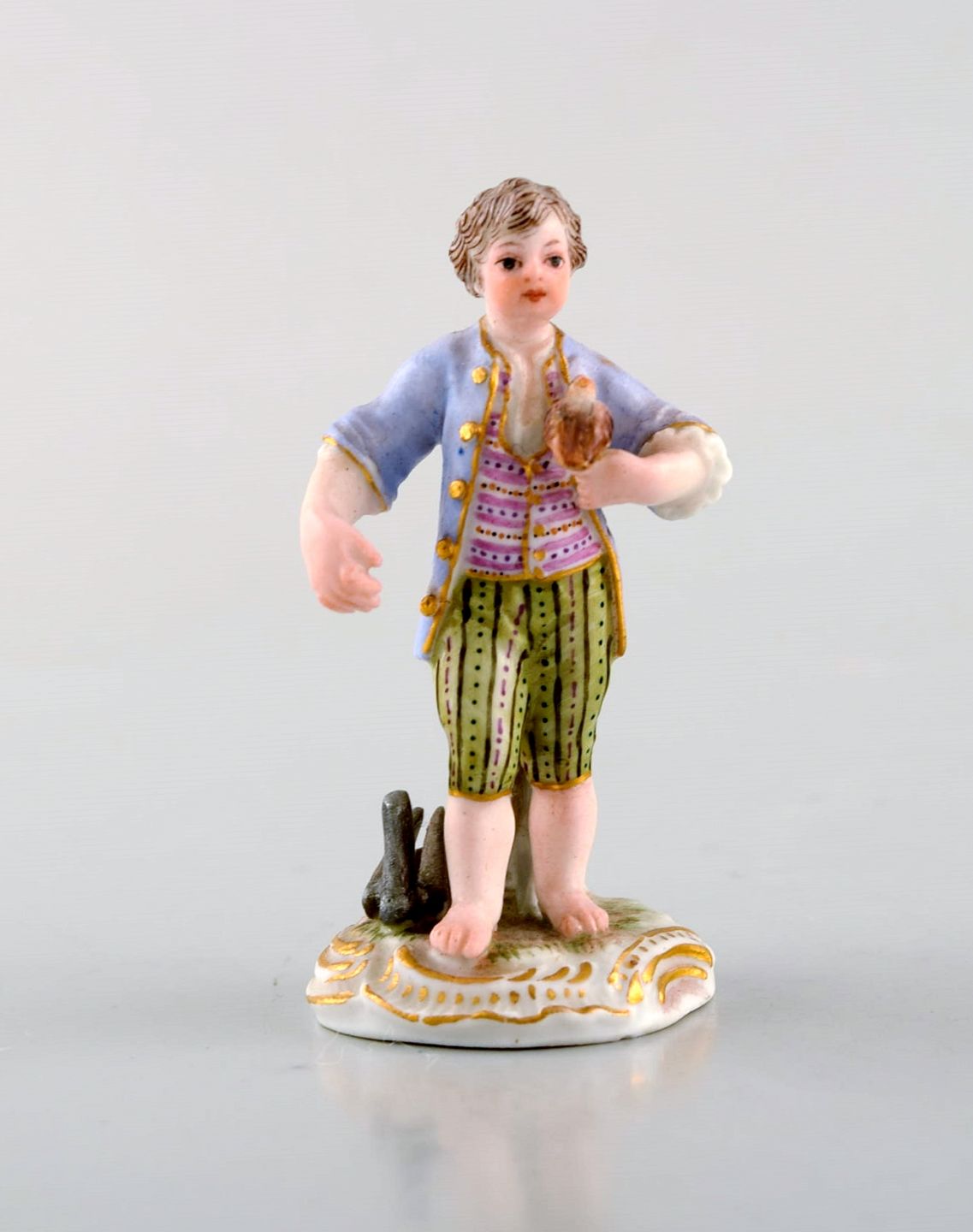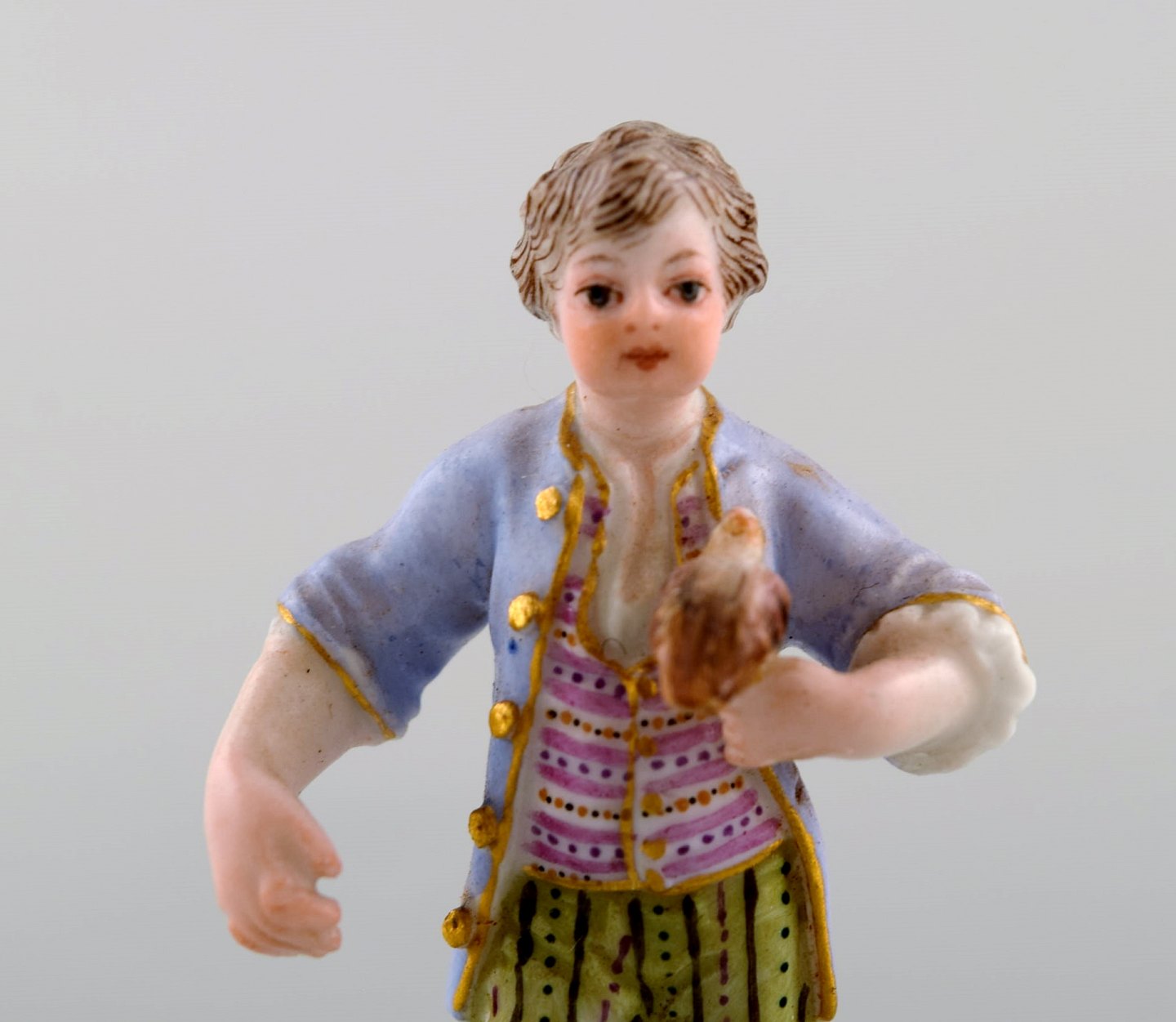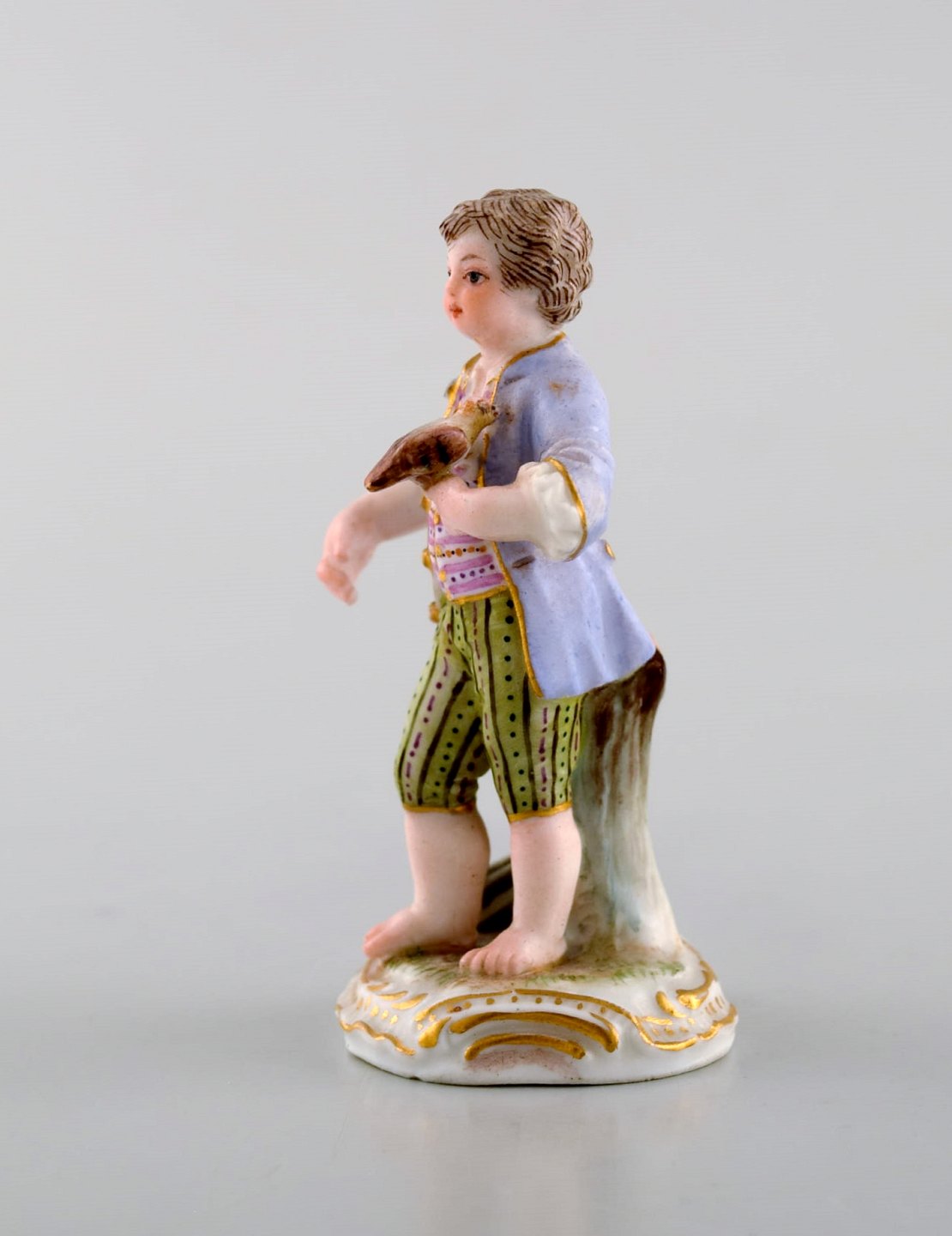 Sjælden antik Meissen miniature figur efter Johann Joachim Kändler i håndmalet porcelæn. Dreng med falk. Dateret 1850-80. Modelnummer 2869. Måler: 6,3 x 3,5 cm. I flot stand. Stemplet.