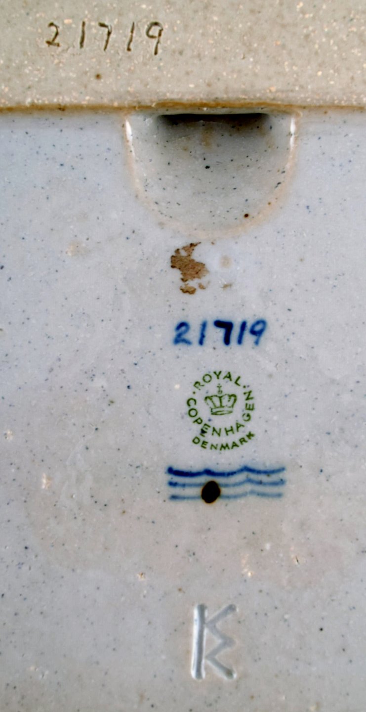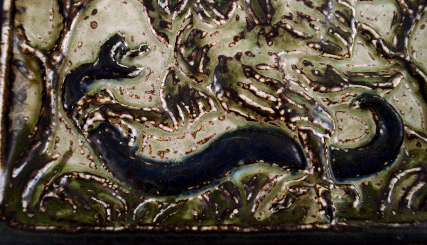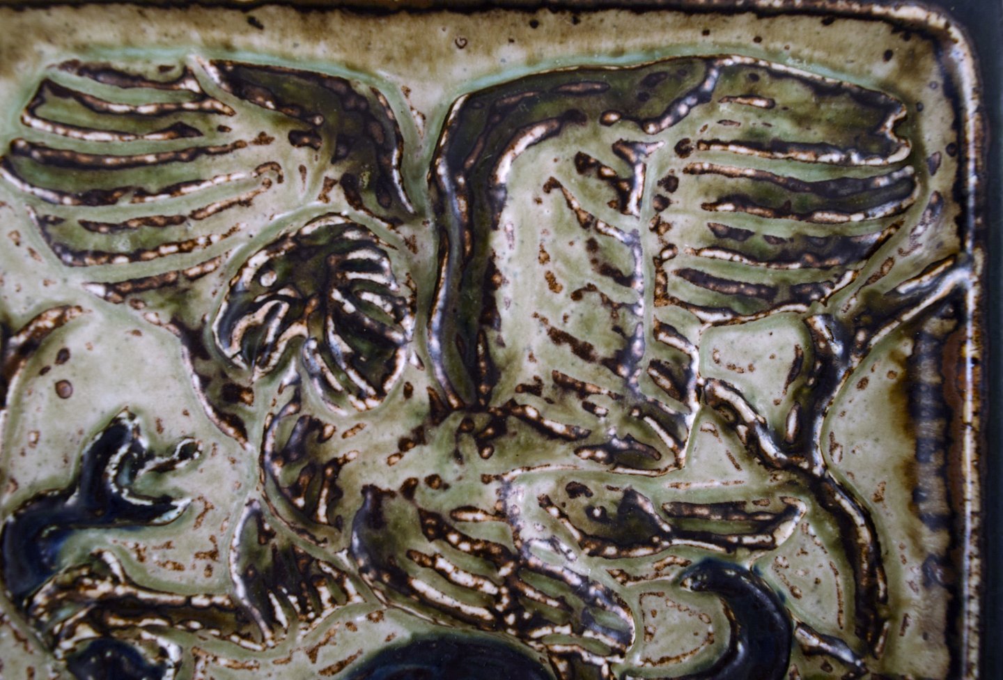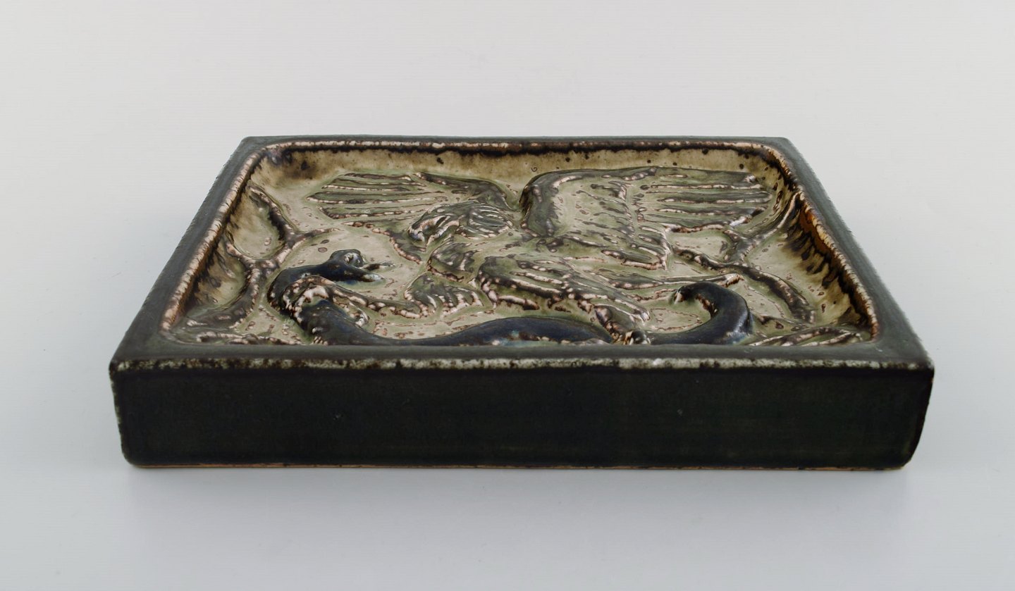 Knud Kyhn for Royal Copenhagen. Vægplakette i glaseret stentøj med ørn og slange i relief. Smuk sung glasur. Modelnummer: 21719. 1940/50'erne.