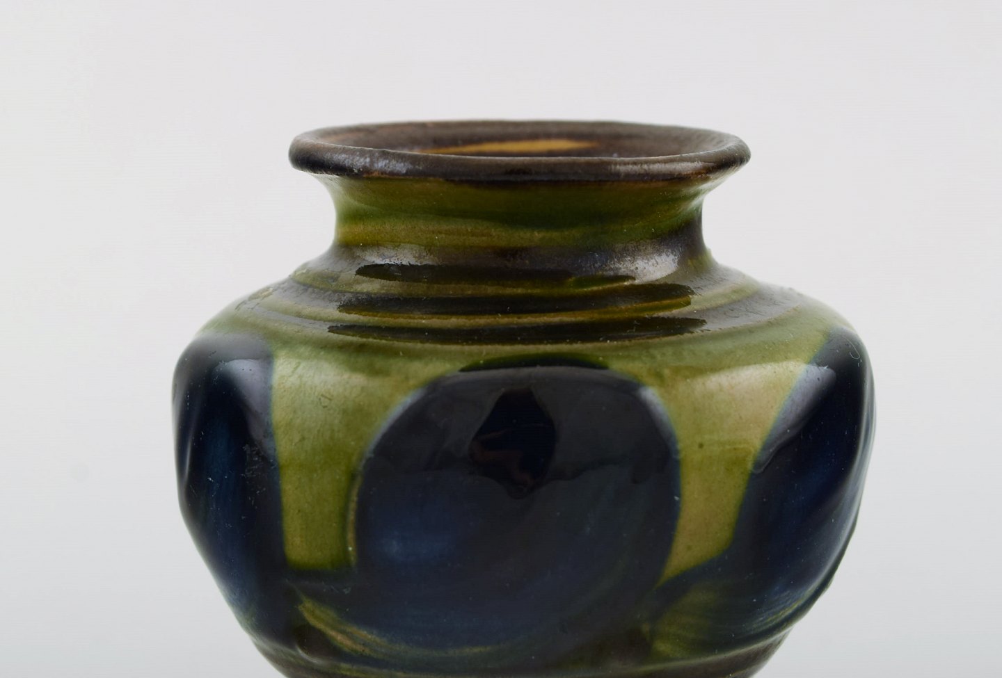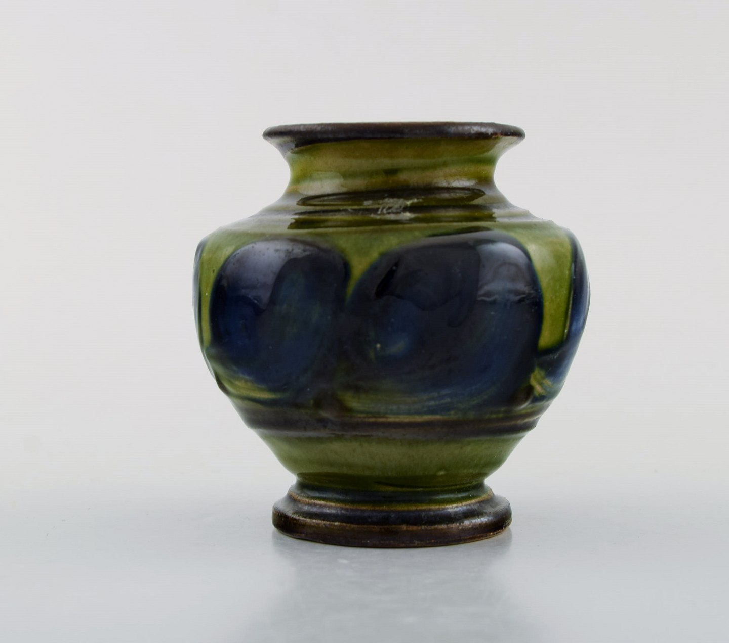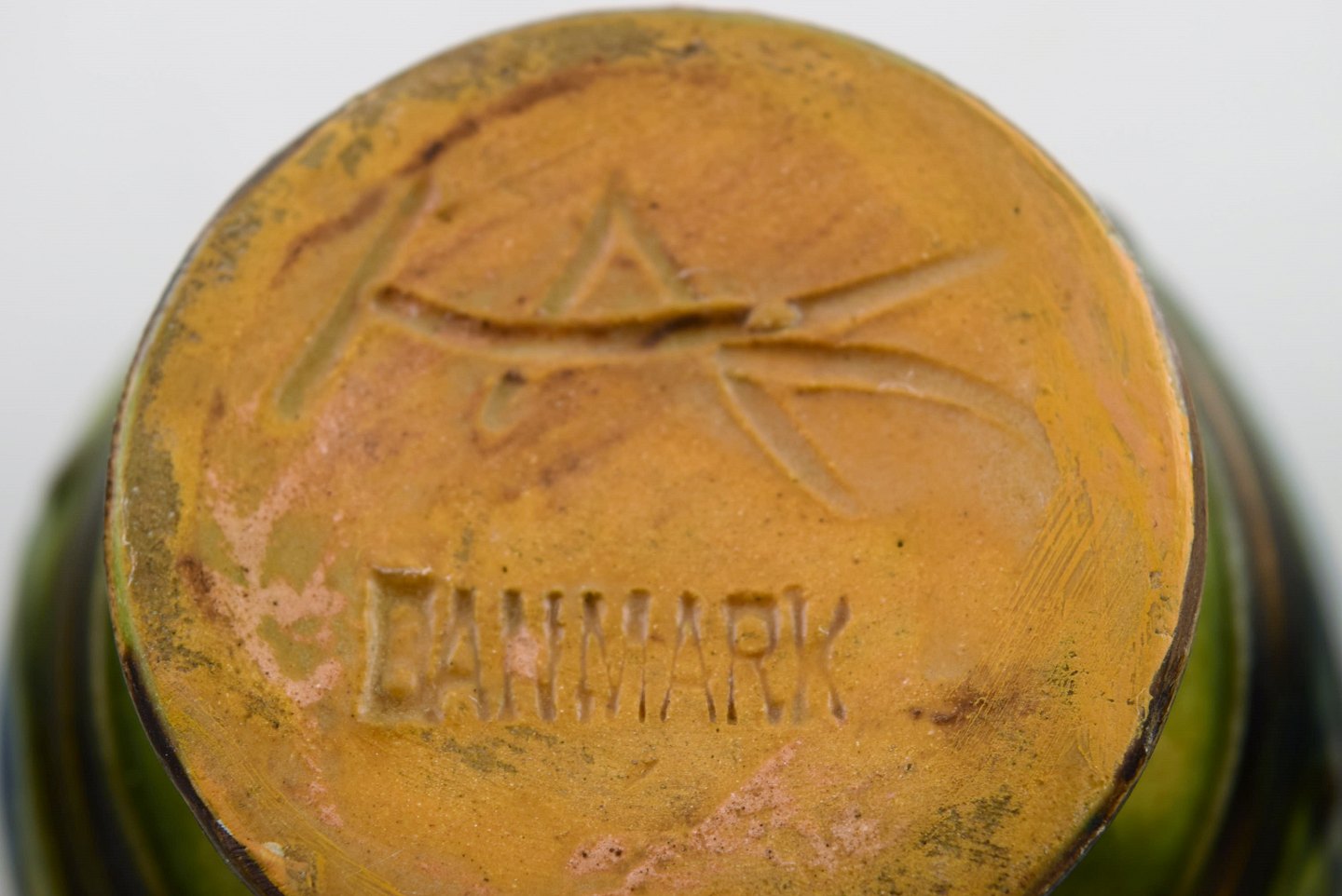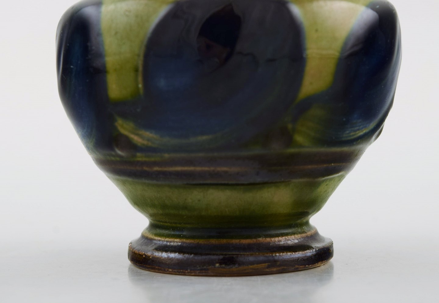 Kähler, HAK, glaseret stentøjsvase i moderne design. 1930/40´erne. Kohornsteknik. Blå blade på grøn baggrund.